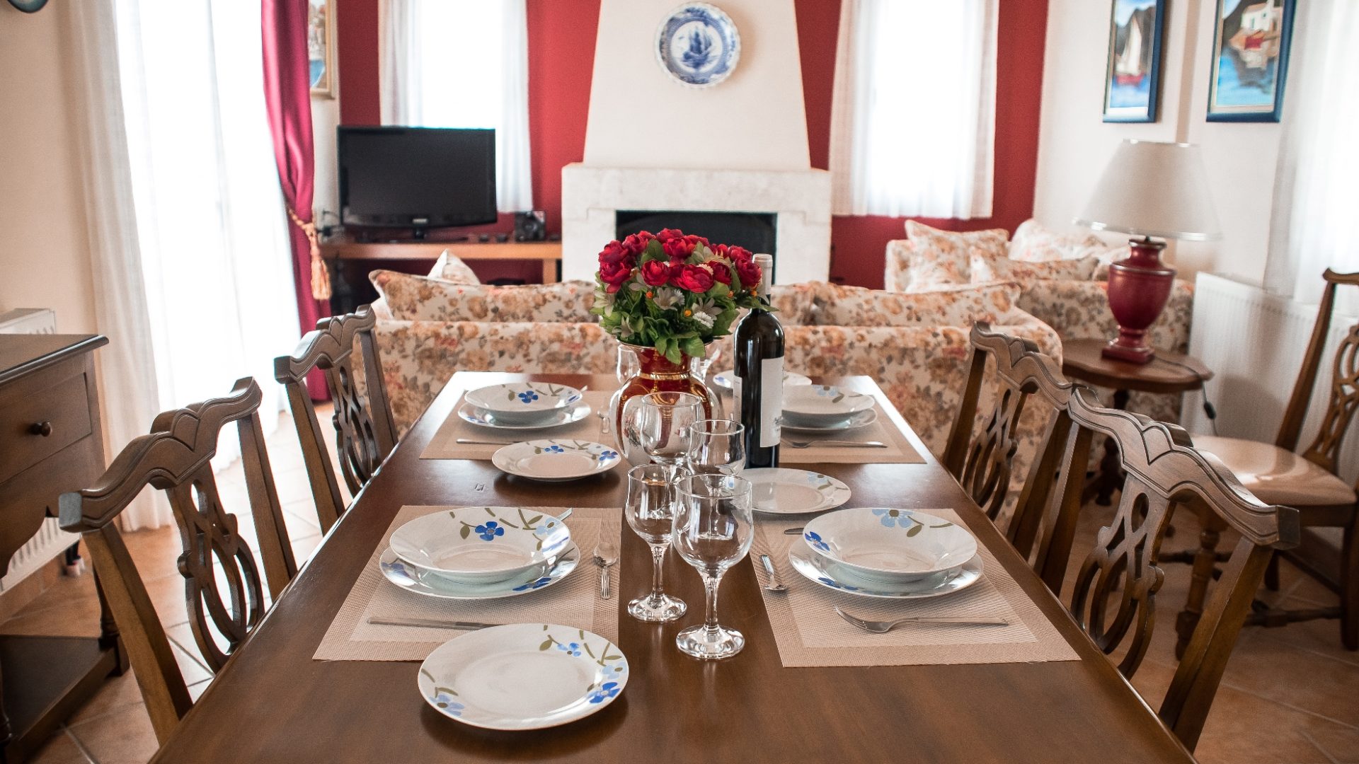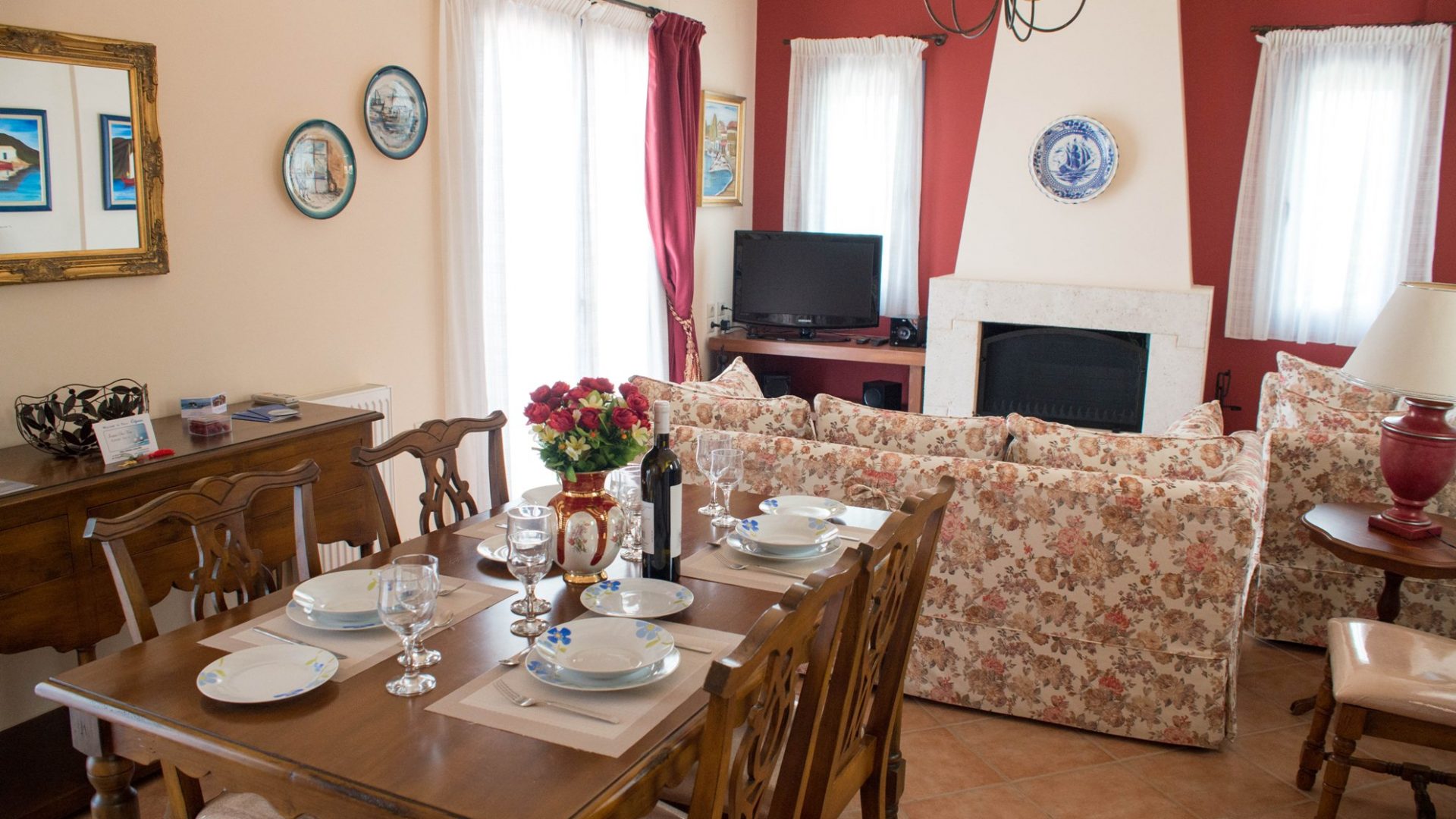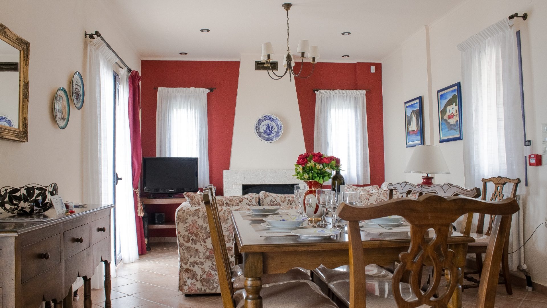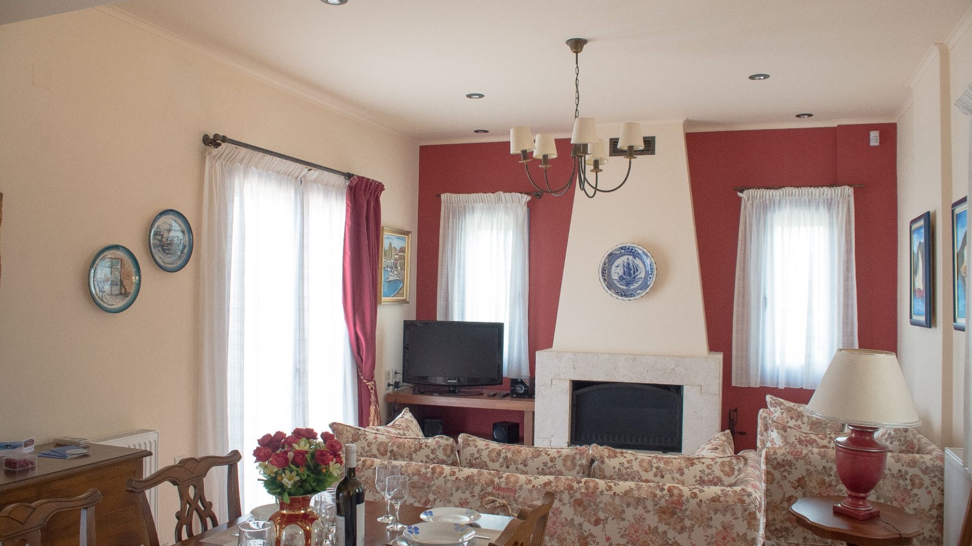 The villa is 100sm. The ground floor includes the living room and in front of the fireplace, there are two sofas, as well as a traditionally decorated kitchen and dining room. Moreover, there is a WC and a laundry machine.