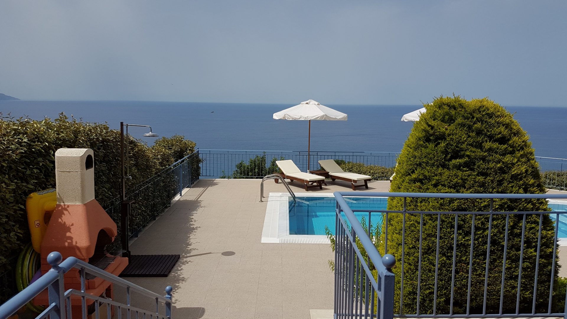 Private pool, 4×7 m, maximum depth 1.7m., shower, BBQ, parking, beach beds around the pool, table with chairs.