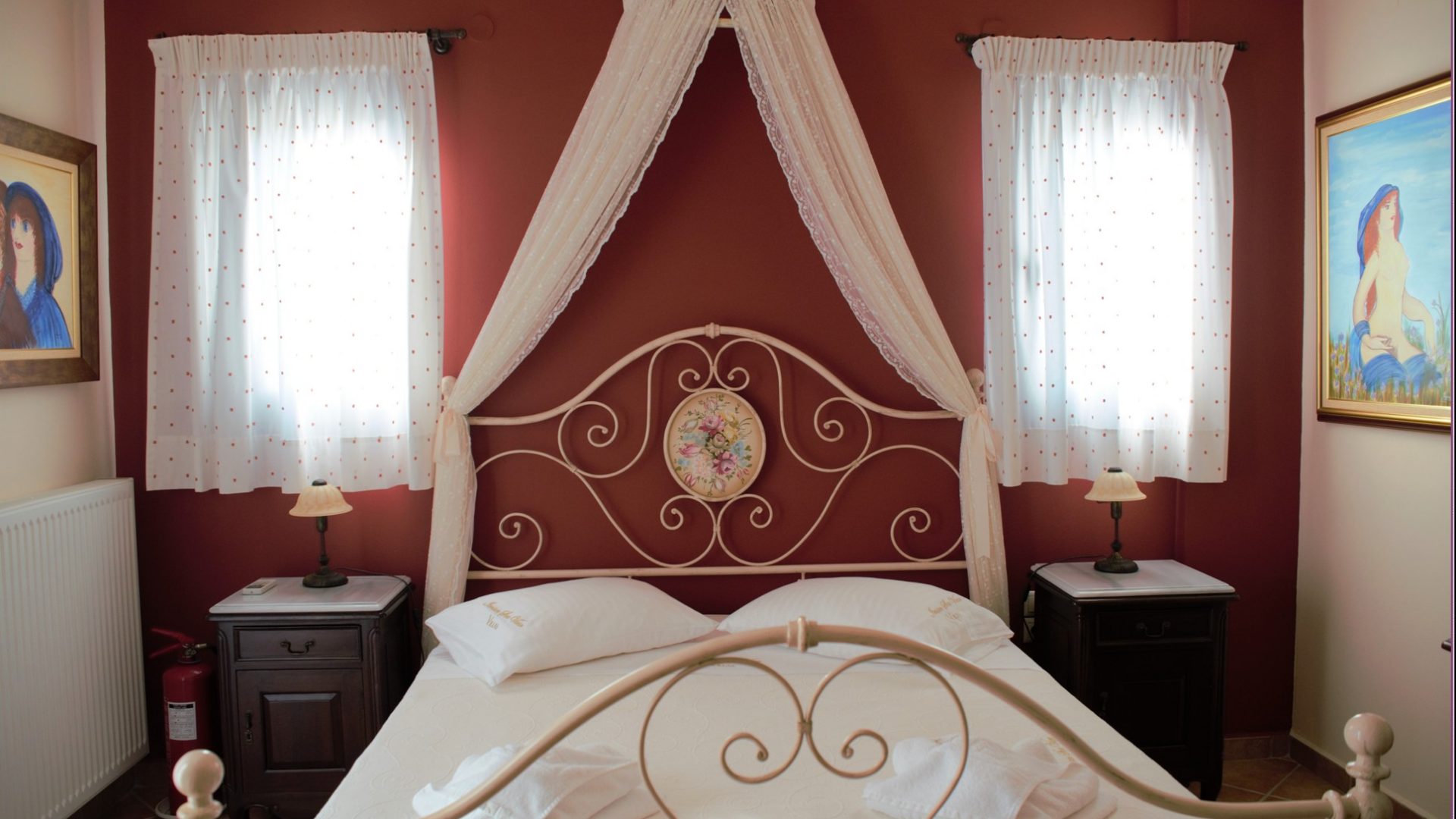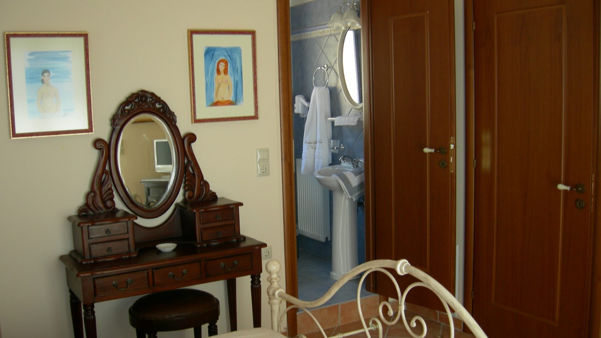 The bedroom with the twin size steel bed and the fly net has an internal bathroom which includes a shower and a hydromassage. The other bedroom, with the single beds, provides a bathroom with a bathtub and hydro massage.
