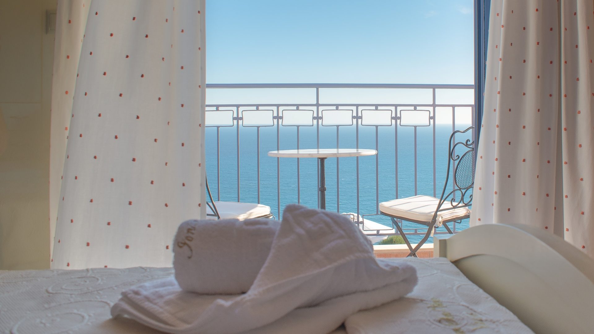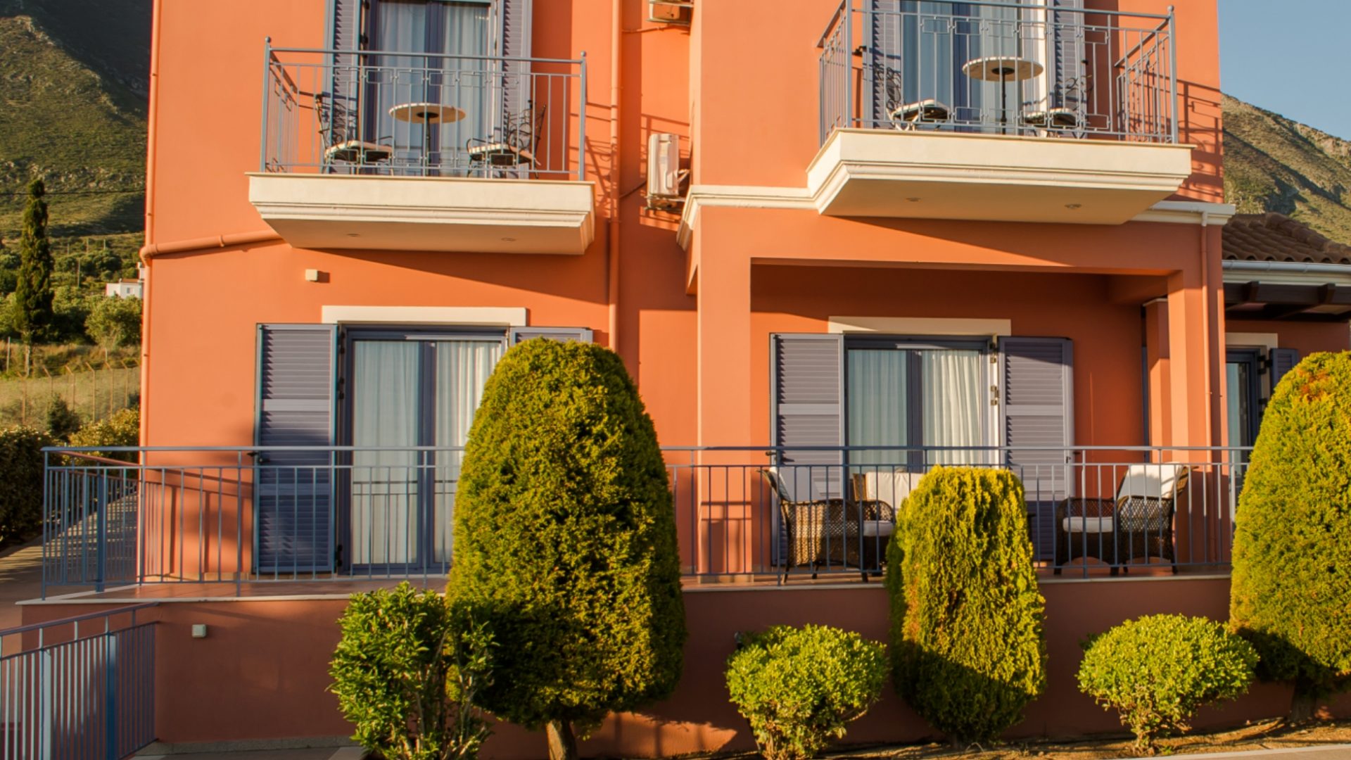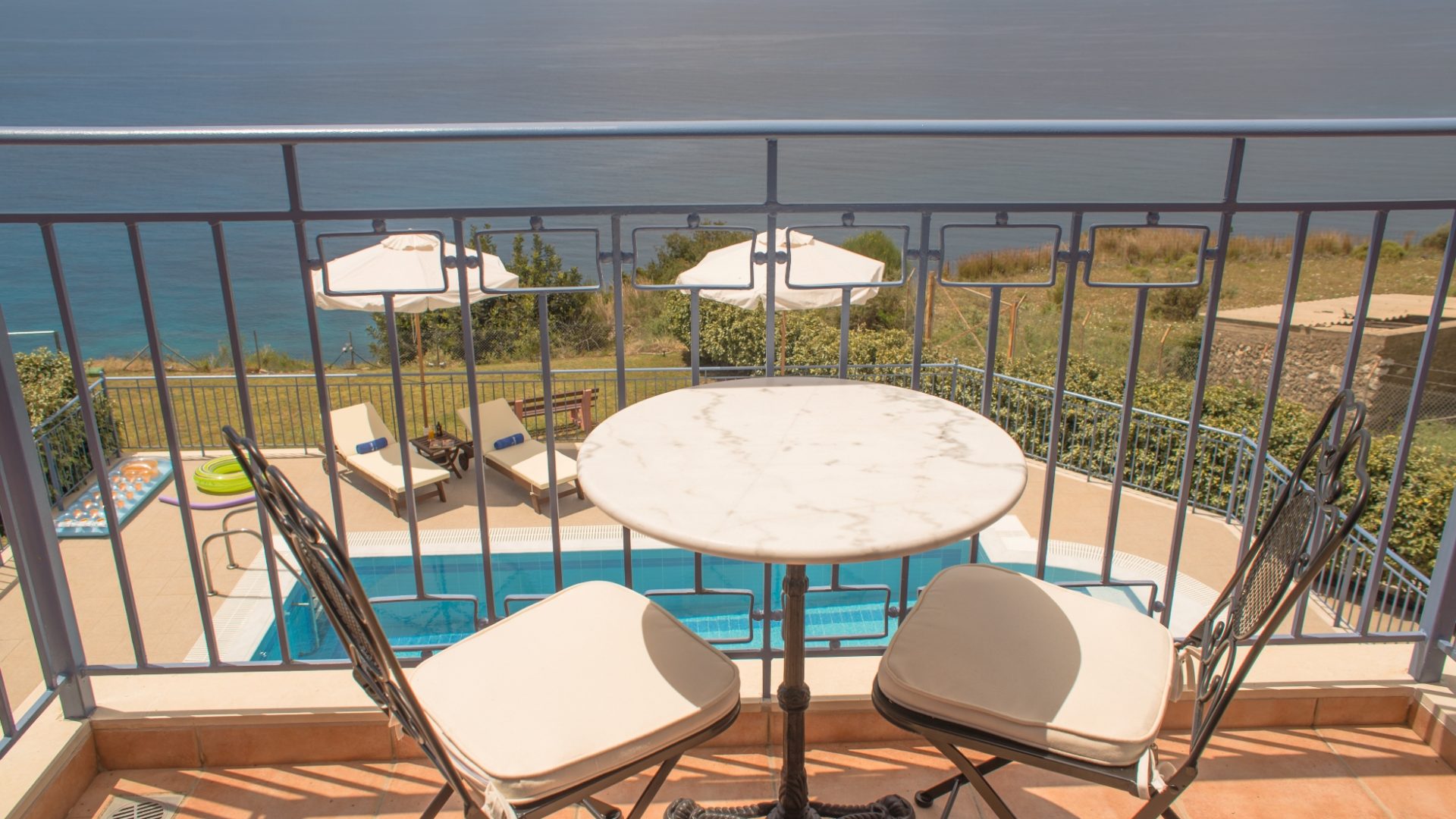 In the first floor, there are two bedrooms with separate balconies, each one equipped with tables and seats.