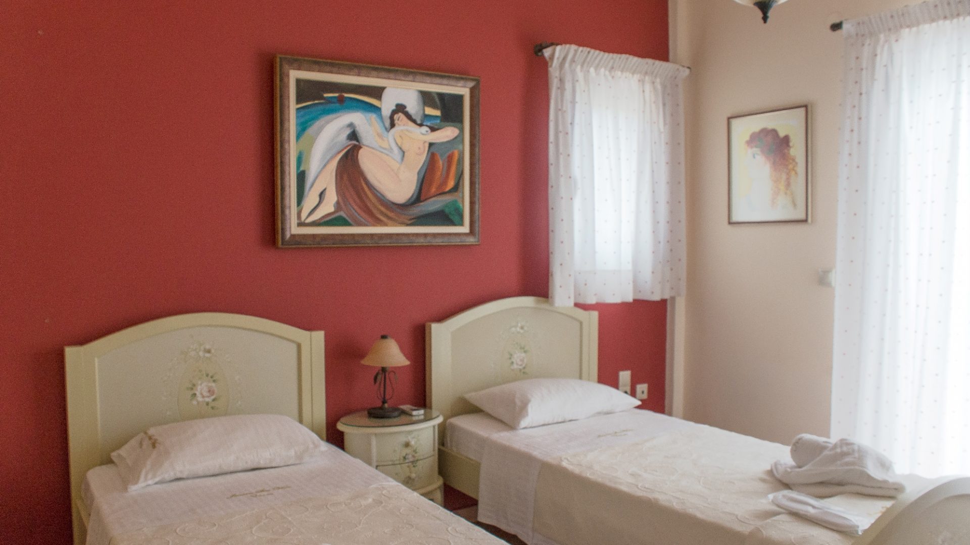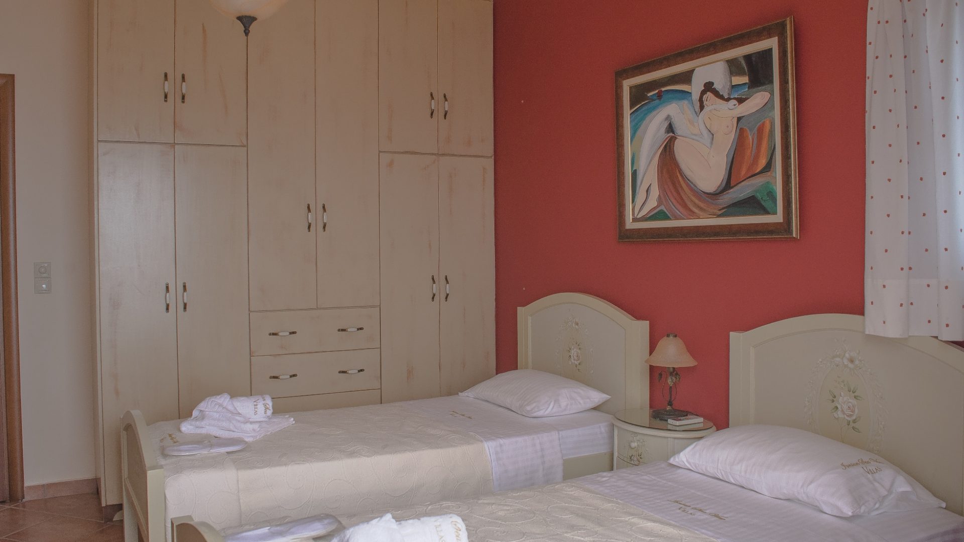 Bedroom with 2 single beds, powder room, bedside table and television.