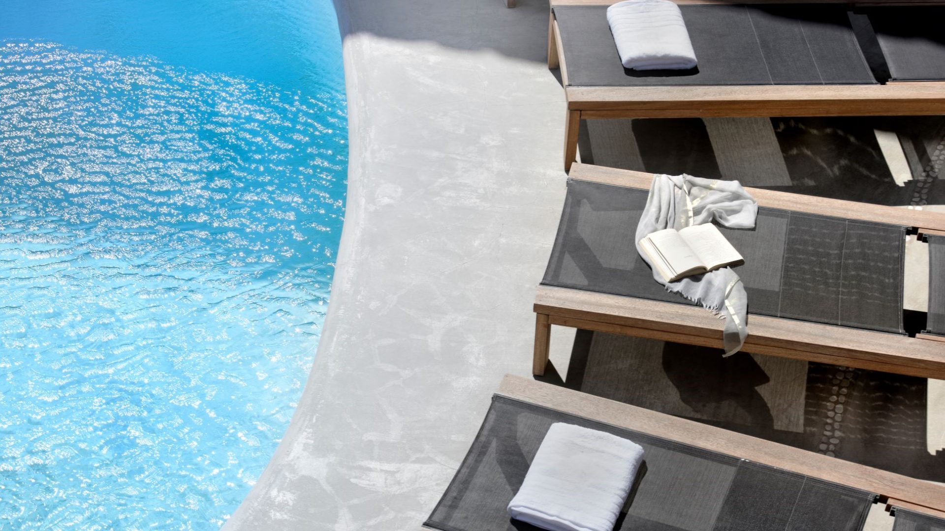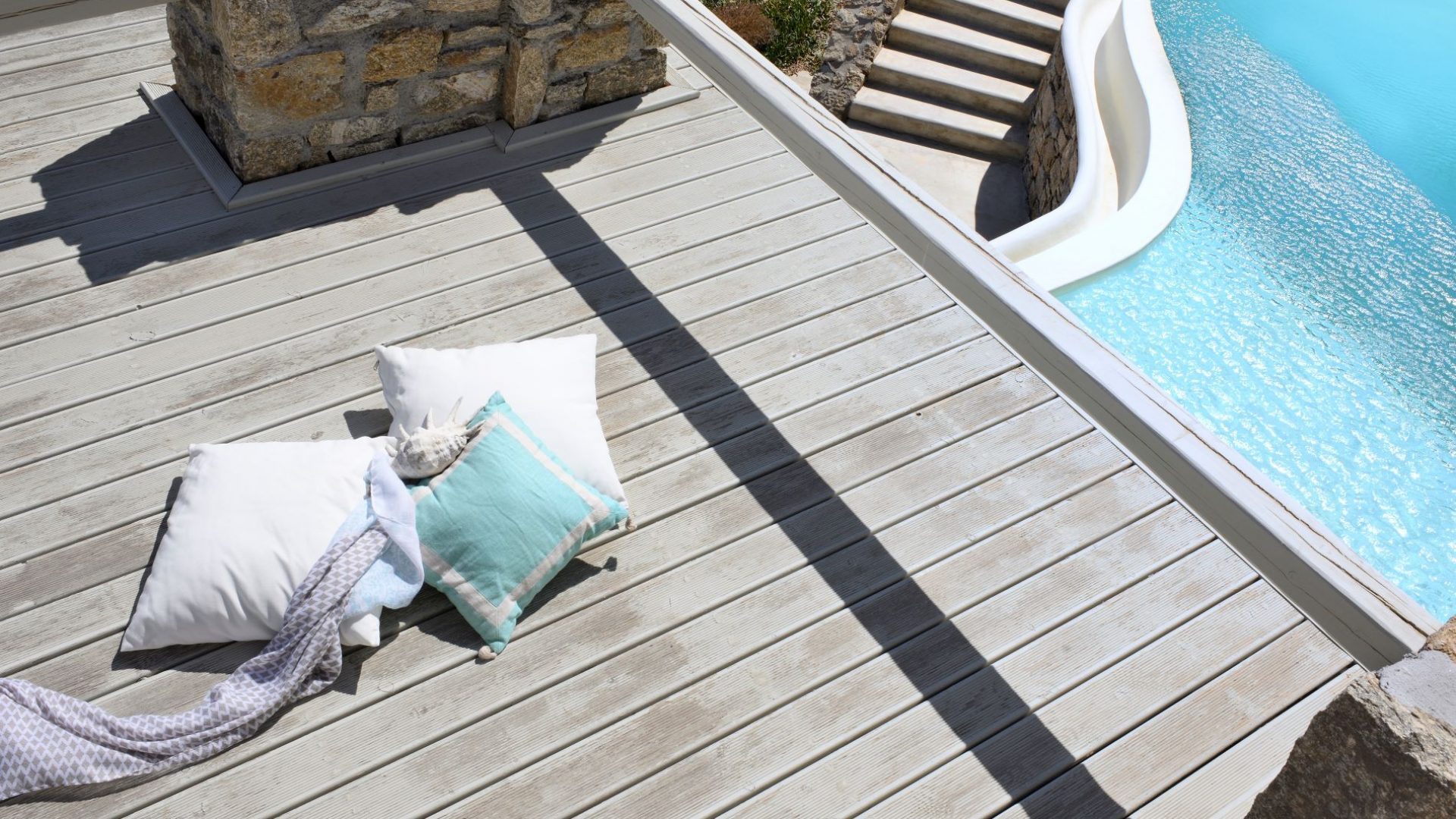Placed in front of the villa is a private lagoon-like infinity swimming pool, next to a large wooden shaded pergola.