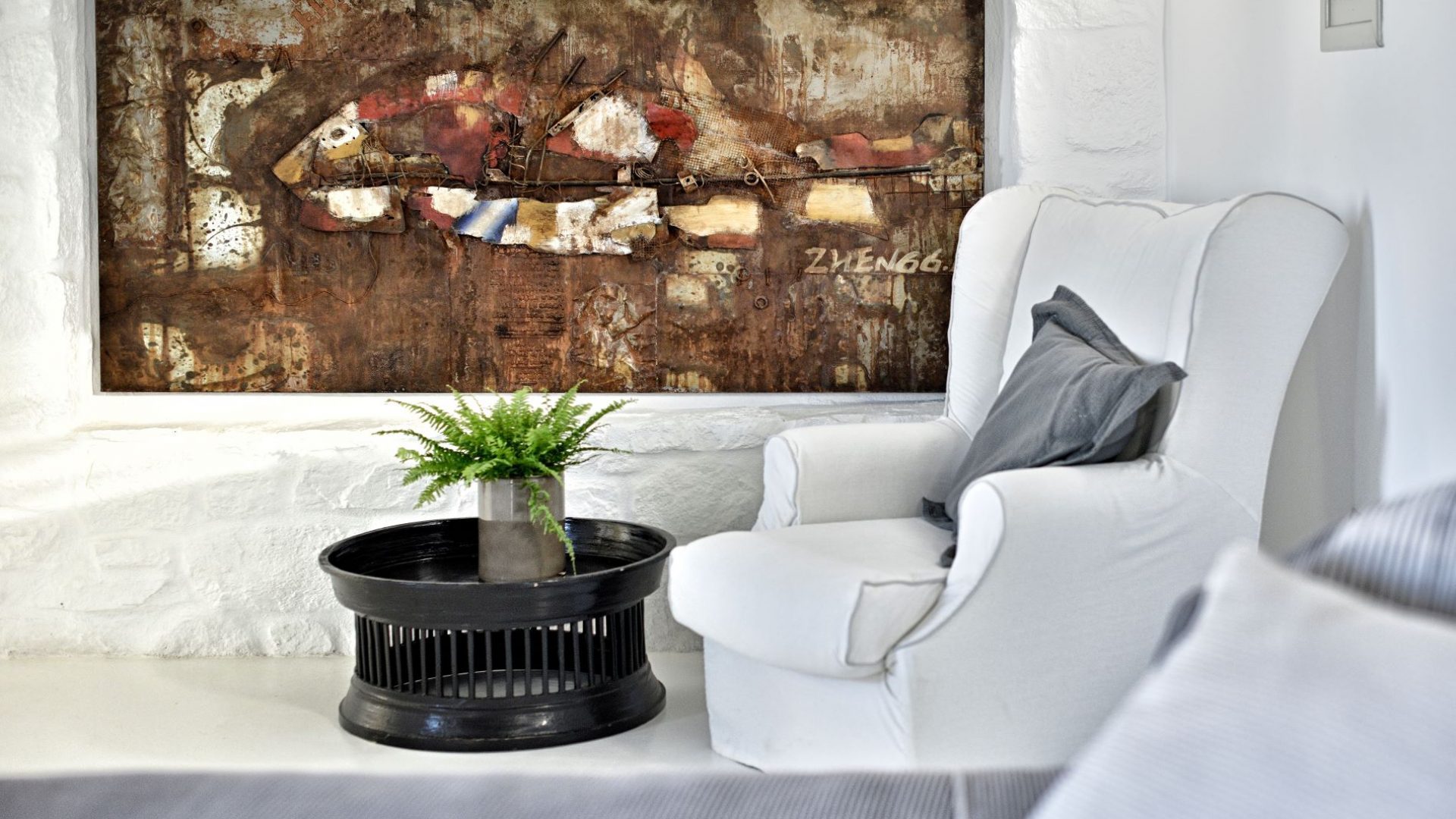 The villa’s charming interior is a combination of minimal architecture with provincial beach house elements. A fully equipped open-plan kitchen with modern appliances gives onto a living-sitting space directly accessing the water-front swimming pool and its wide terraces.