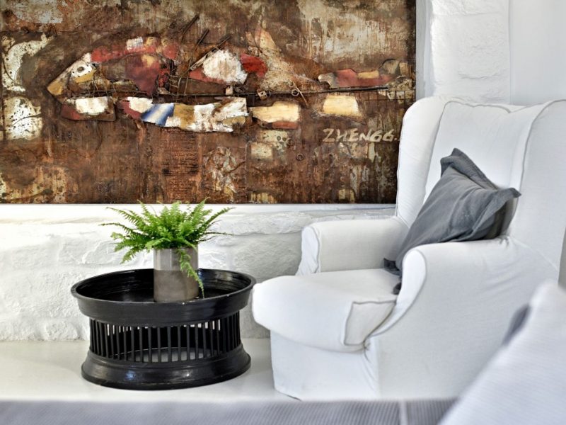 The villa’s charming interior is a combination of minimal architecture with provincial beach house elements. A fully equipped open-plan kitchen with modern appliances gives onto a living-sitting space directly accessing the water-front swimming pool and its wide terraces.