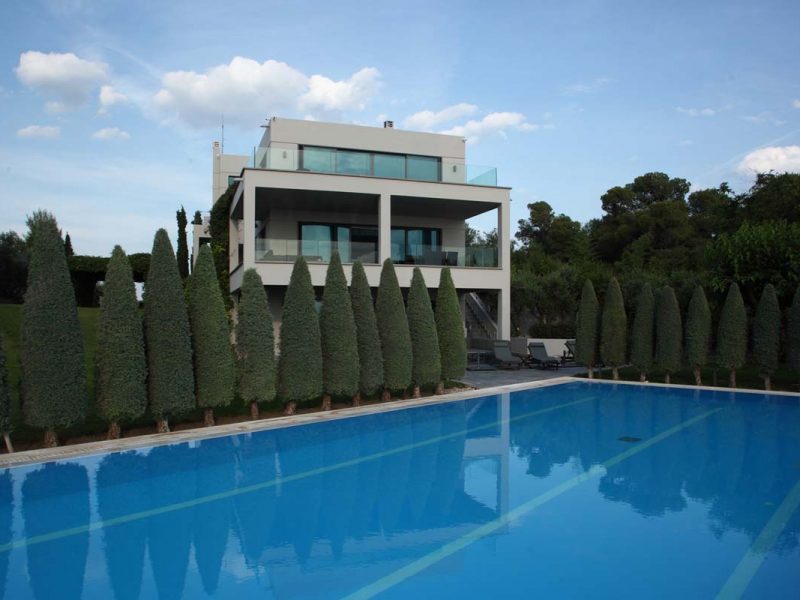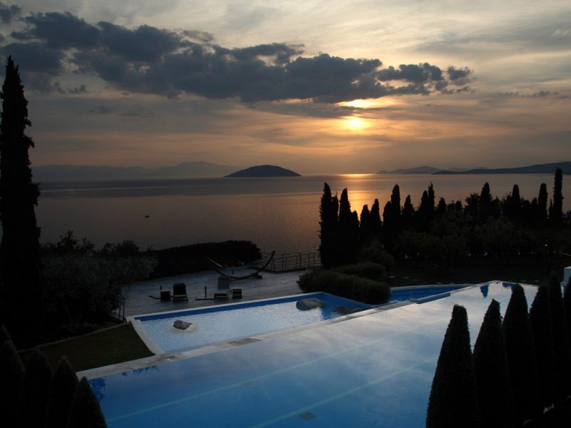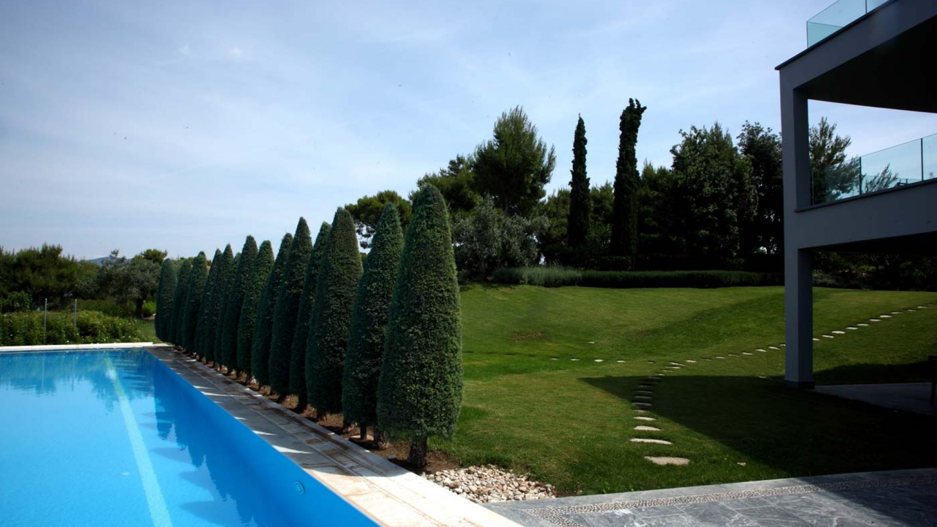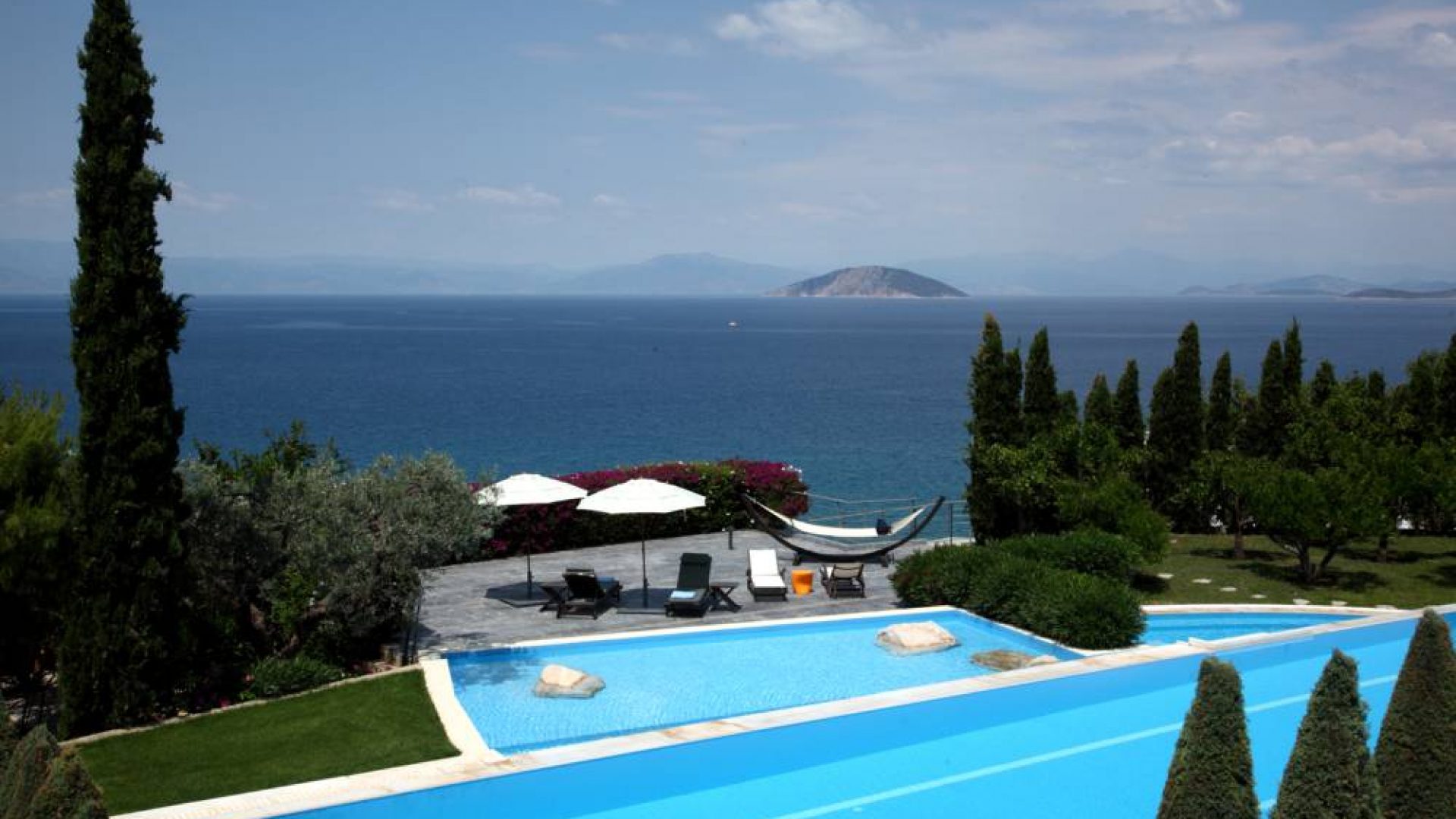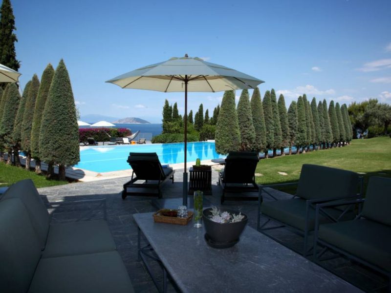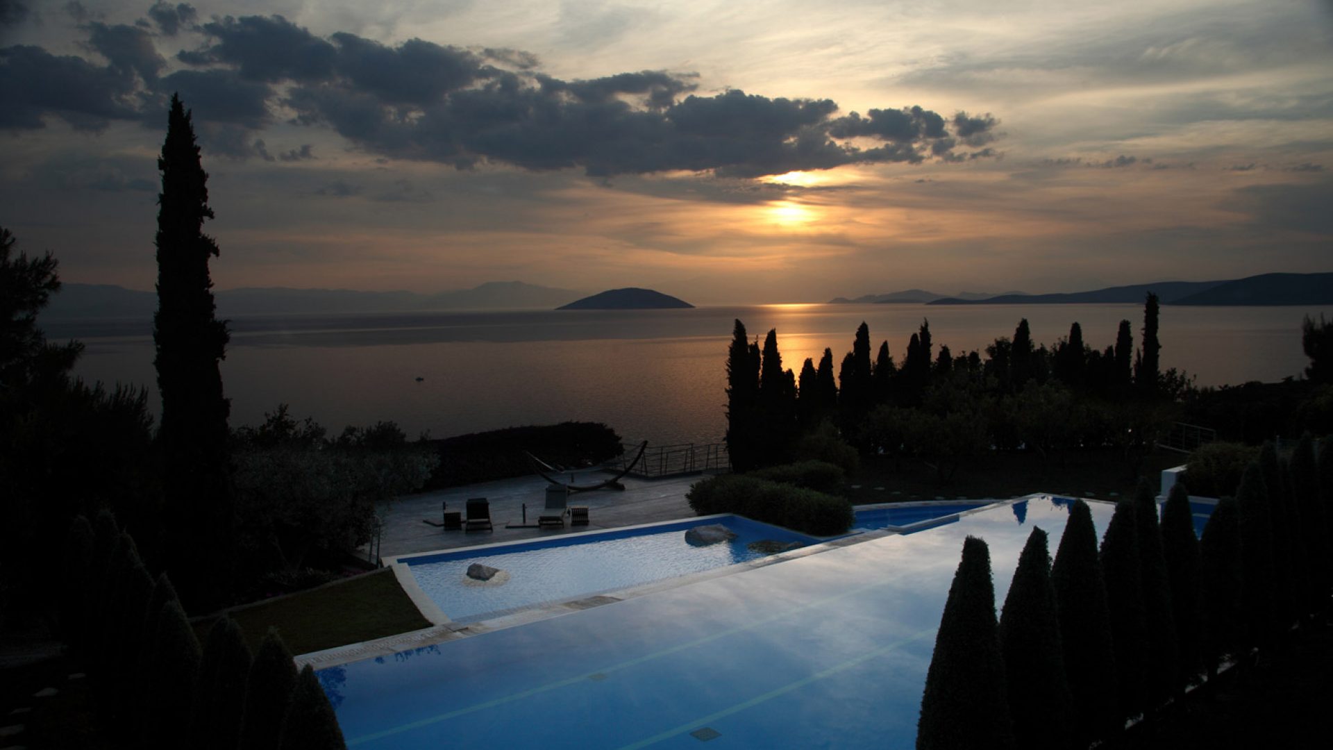 The luxury villa is simply presented to the highest of standards (the villa is 750m2 including terraces) and set in mature and fragrant grounds. 2 1/2 hours’ drive from Athens Int. Airport and a 35-minute flight to its private helicopter landing pad