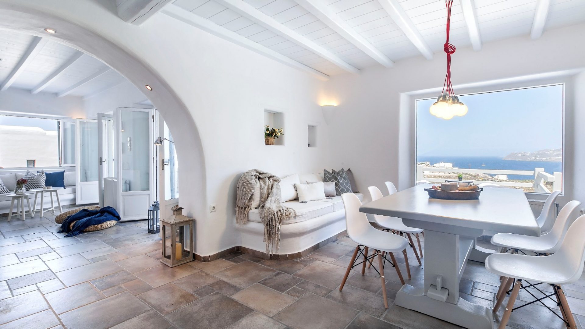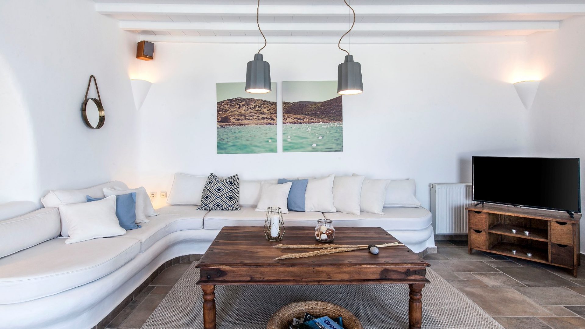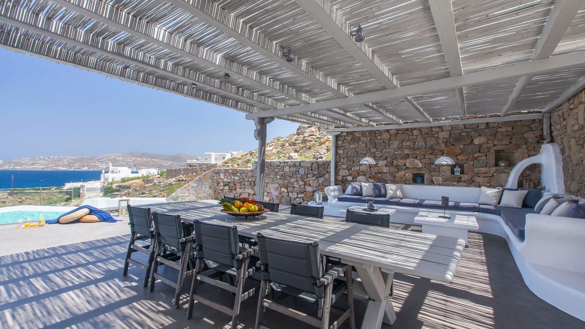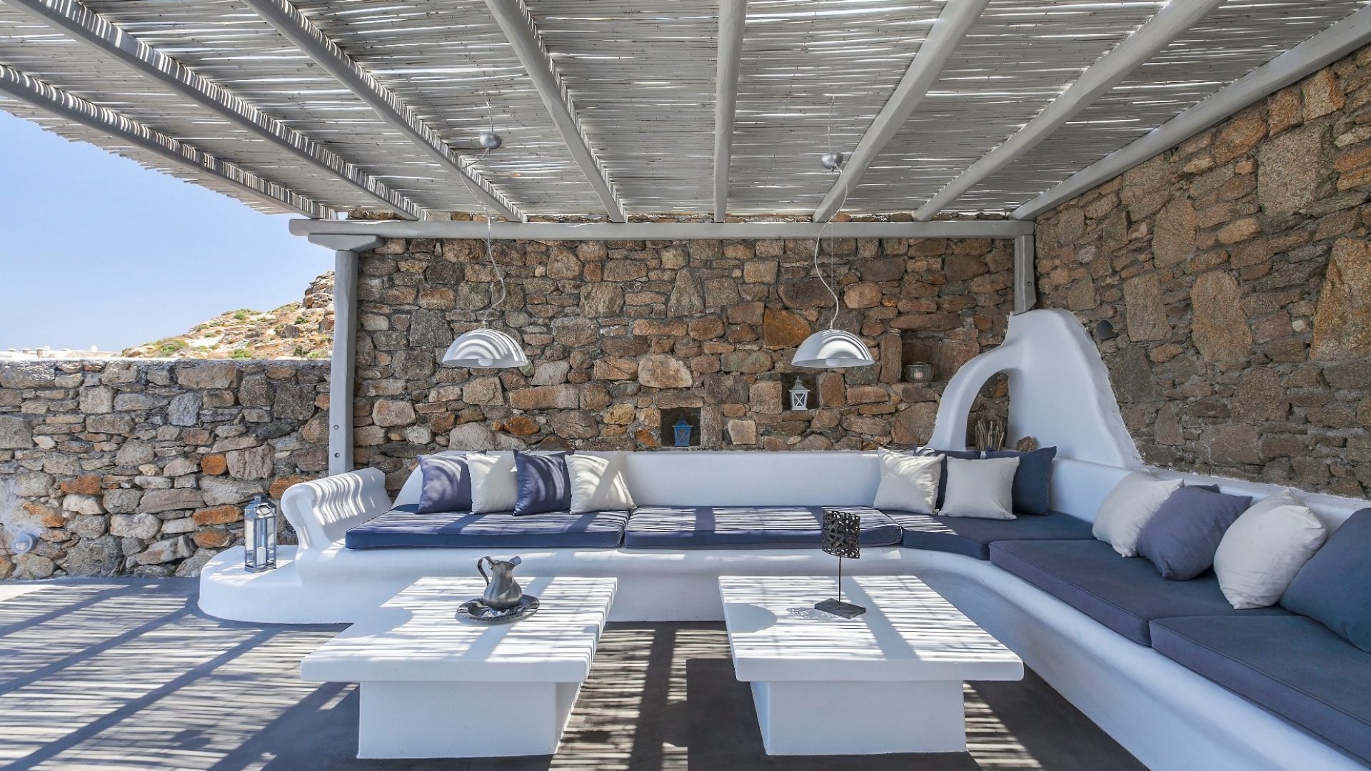 Ornos beach is only a five-minute drive from the villa…lovely! Lovelier so is the fact that after a fun-filled day out exploring the island, one can take an evening dip in the pool and rest on the inviting plush sun-beds. Villa Doria offers beautiful exterior landscaping complete with breathtaking pool resting at the crest of the Villa’s grounds, unobstructed sea views, shaded dining area as well as wooden deck with lounge areas. Yours to spoil your senses!