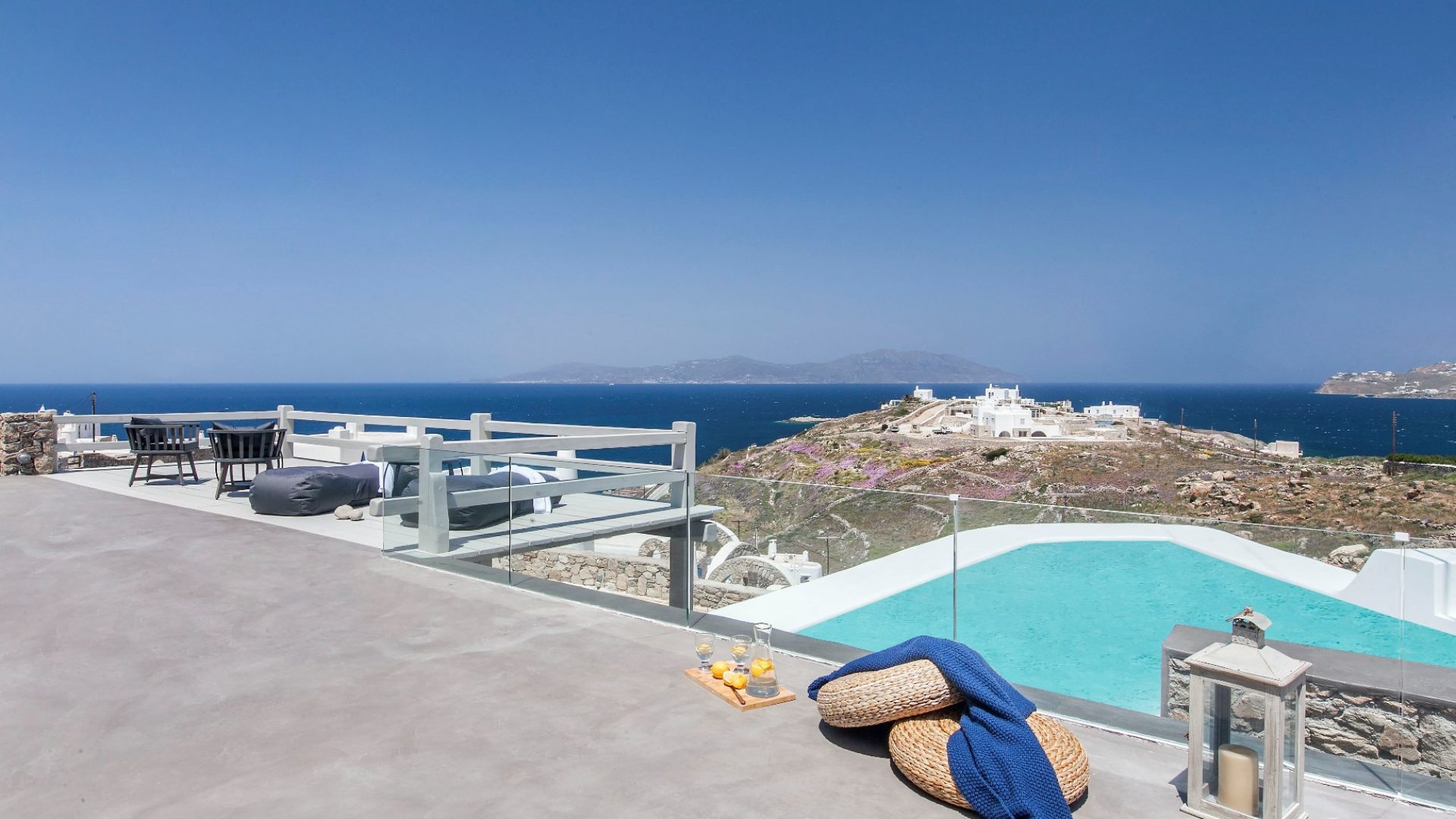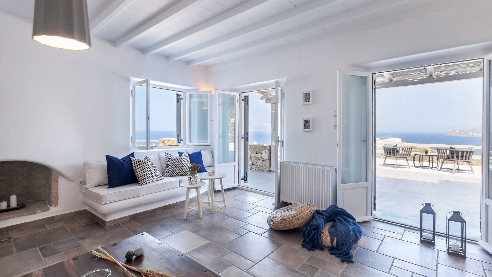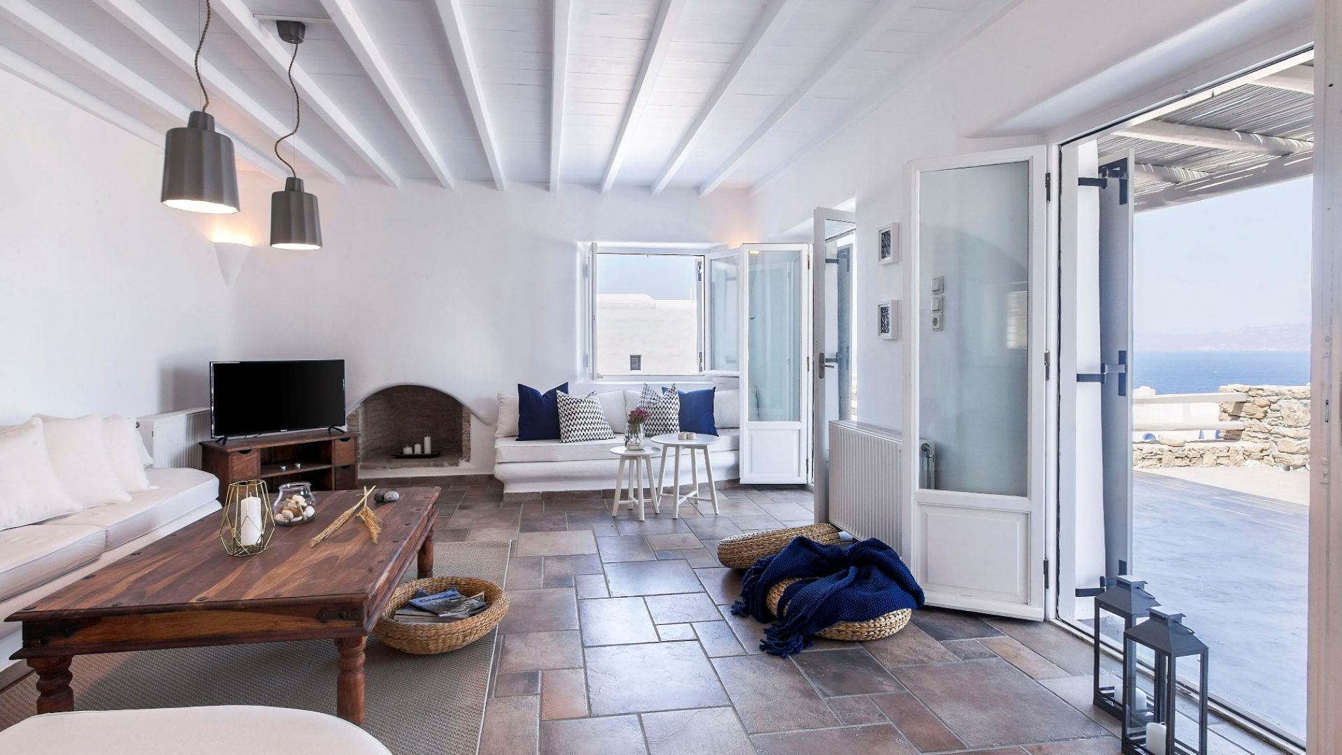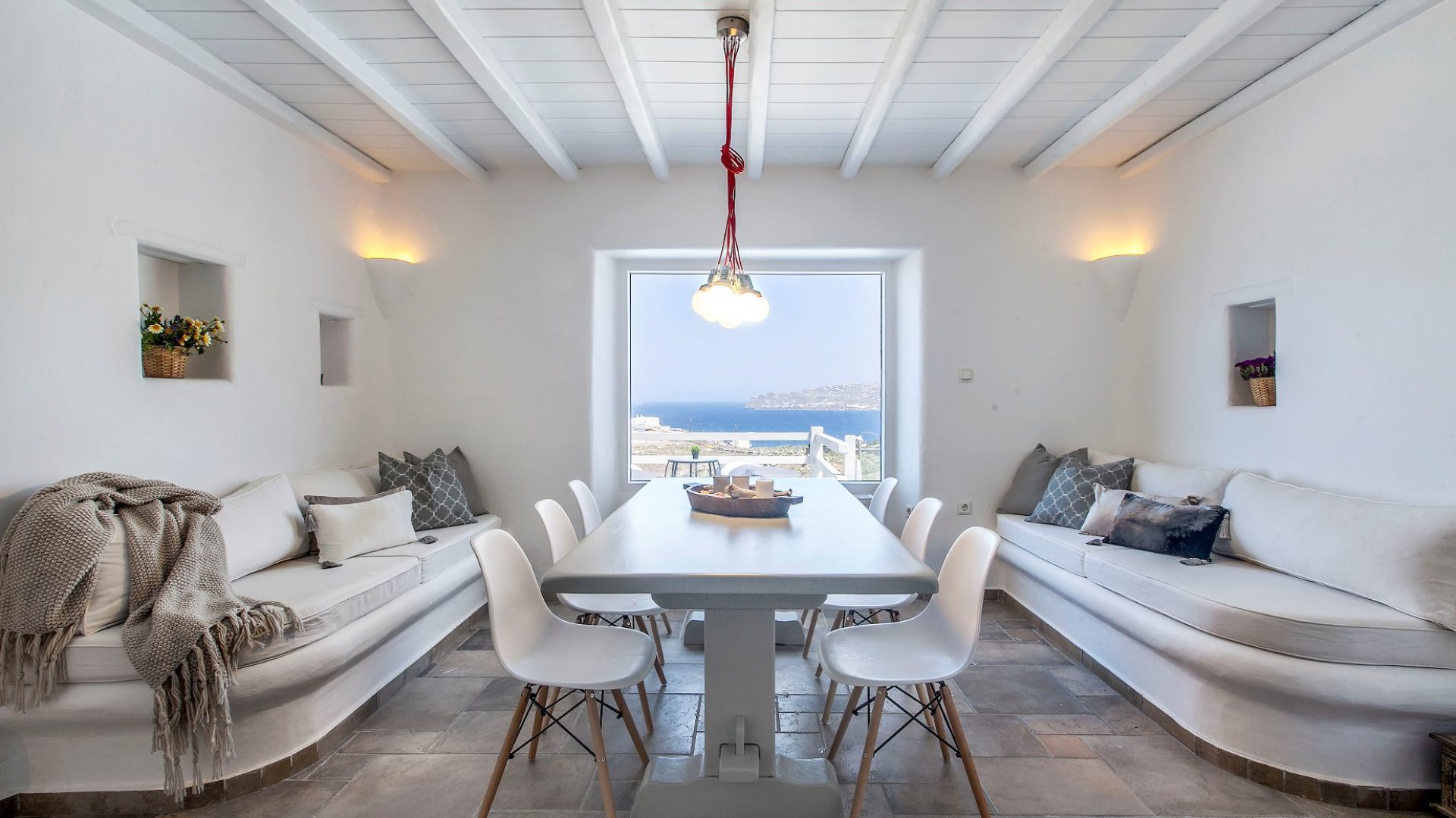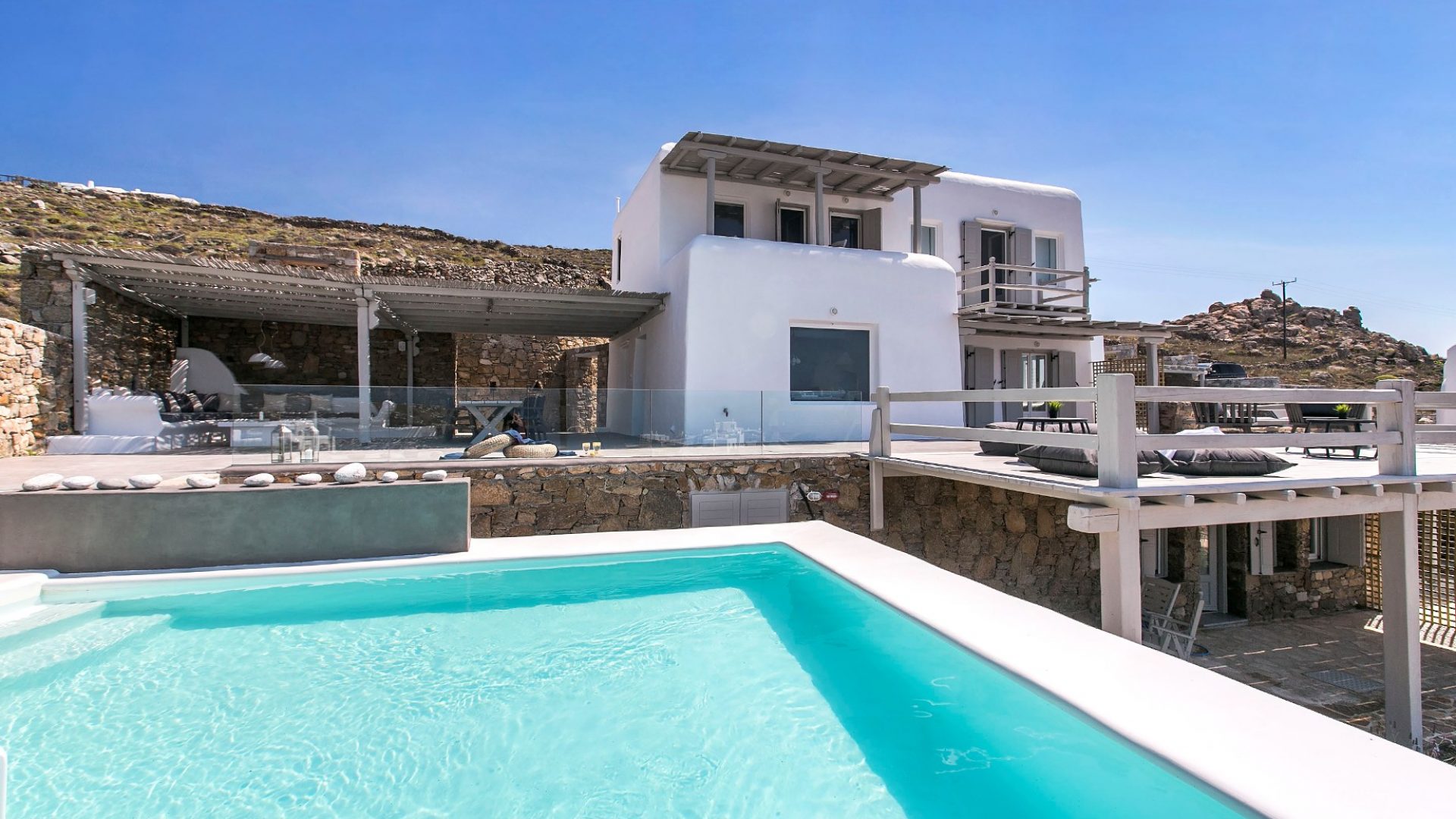 Ornos beach is only a five-minute drive from the villa…lovely! Lovelier so is the fact that after a fun-filled day out exploring the island, one can take an evening dip in the pool and rest on the inviting plush sun-beds. Villa Doria offers beautiful exterior landscaping complete with breathtaking pool resting at the crest of the Villa’s grounds, unobstructed sea views, shaded dining area as well as wooden deck with lounge areas. Yours to spoil your senses!