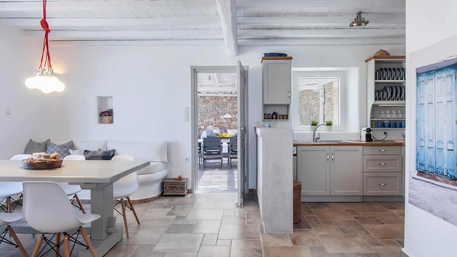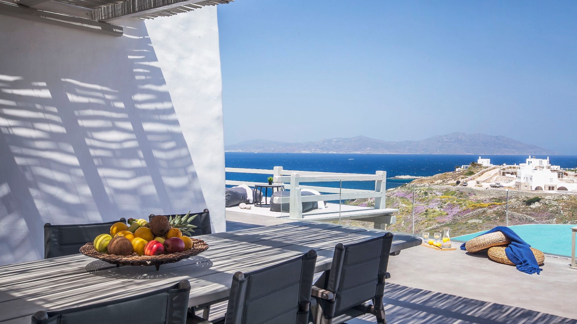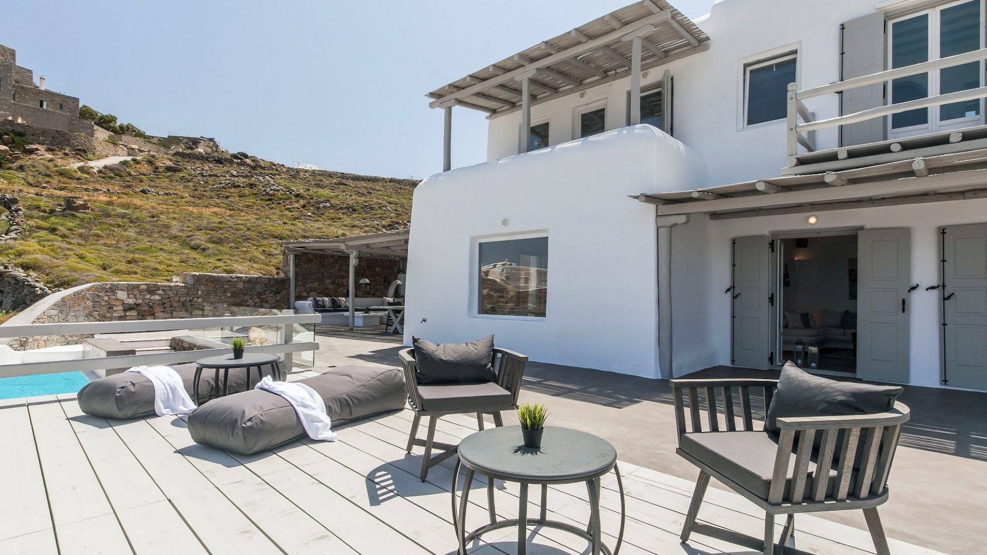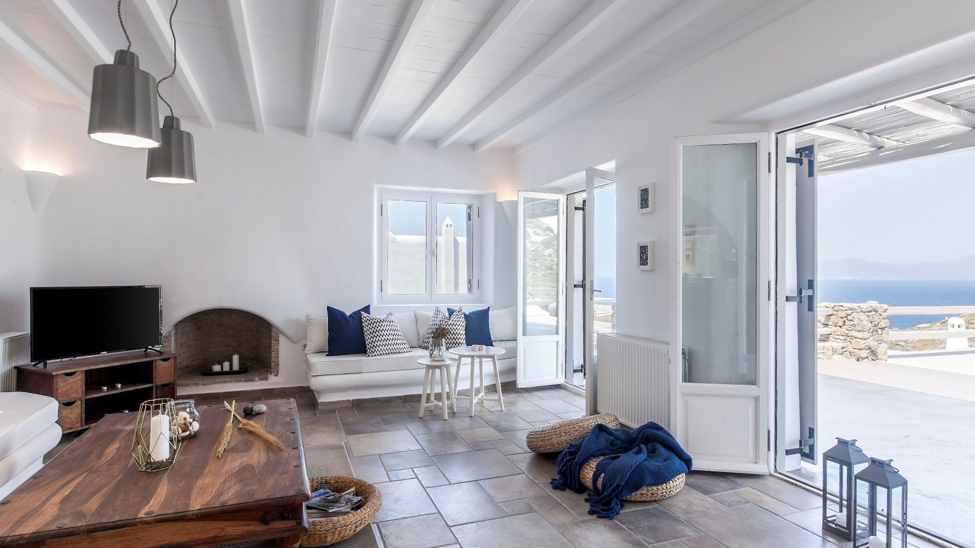 Ornos beach is only a five-minute drive from the villa…lovely! Lovelier so is the fact that after a fun-filled day out exploring the island, one can take an evening dip in the pool and rest on the inviting plush sun-beds. Villa Doria offers beautiful exterior landscaping complete with breathtaking pool resting at the crest of the Villa’s grounds, unobstructed sea views, shaded dining area as well as wooden deck with lounge areas. Yours to spoil your senses!