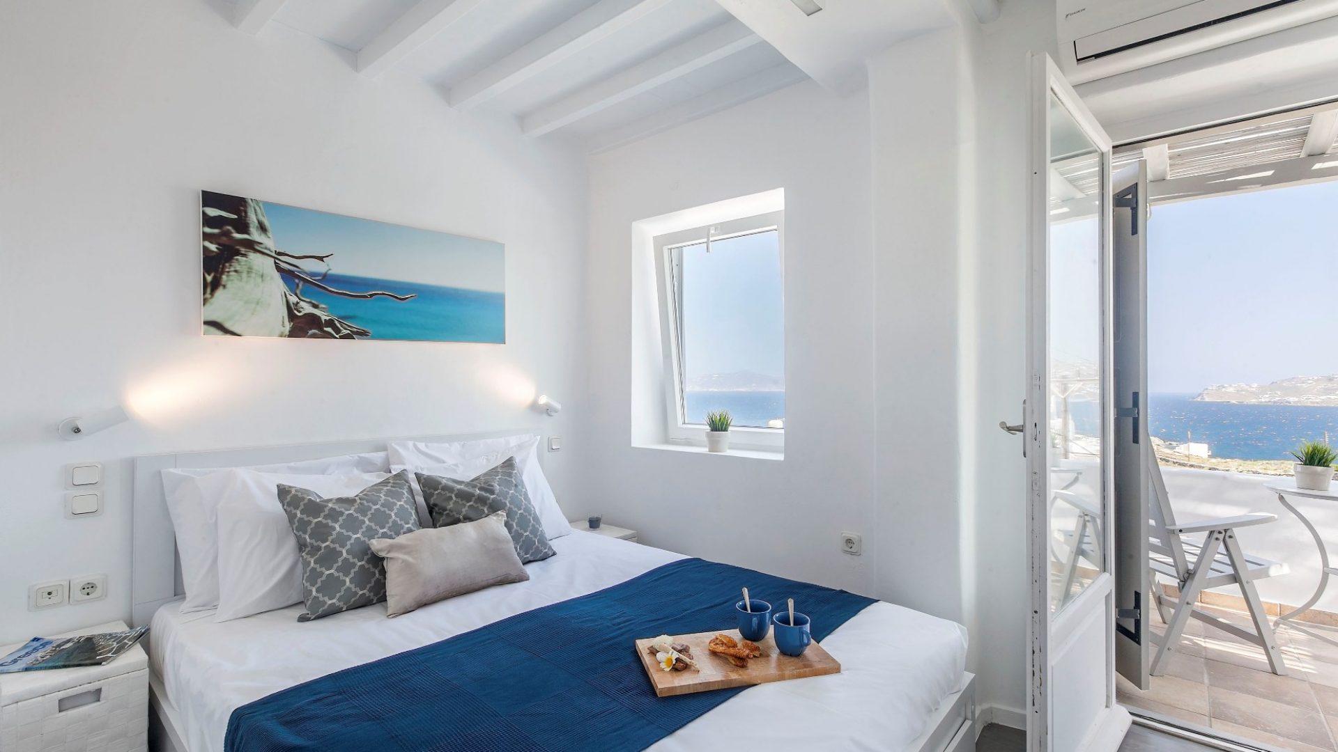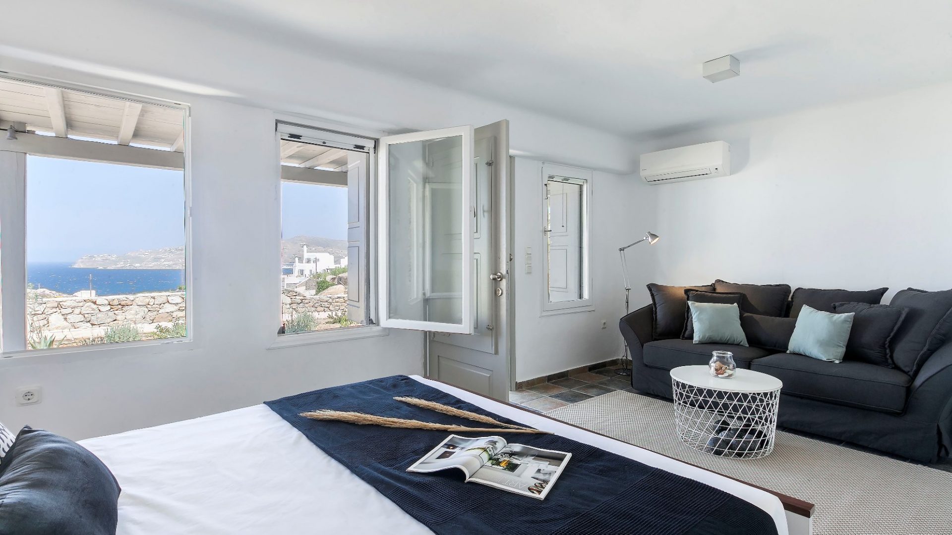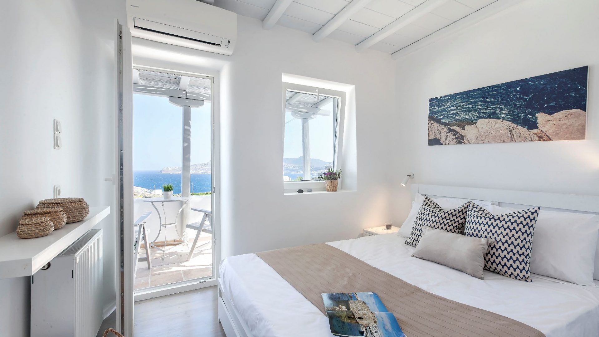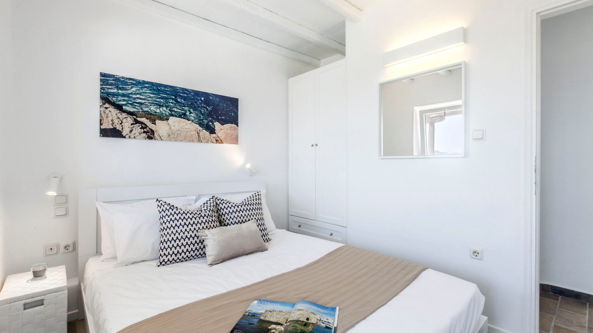 Ornos beach is only a five-minute drive from the villa…lovely! Lovelier so is the fact that after a fun-filled day out exploring the island, one can take an evening dip in the pool and rest on the inviting plush sun-beds. Villa Doria offers beautiful exterior landscaping complete with breathtaking pool resting at the crest of the Villa’s grounds, unobstructed sea views, shaded dining area as well as wooden deck with lounge areas. Yours to spoil your senses!