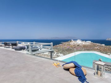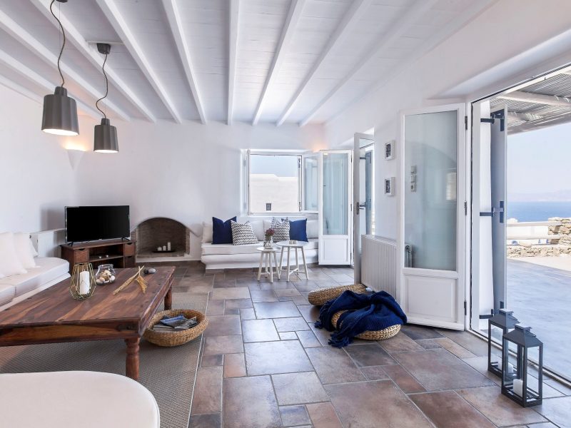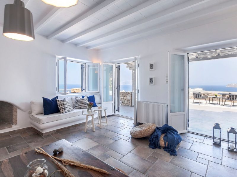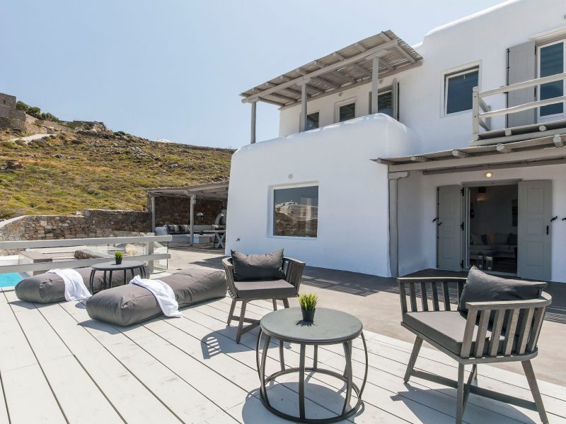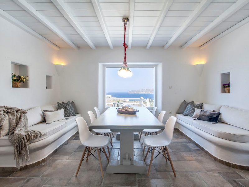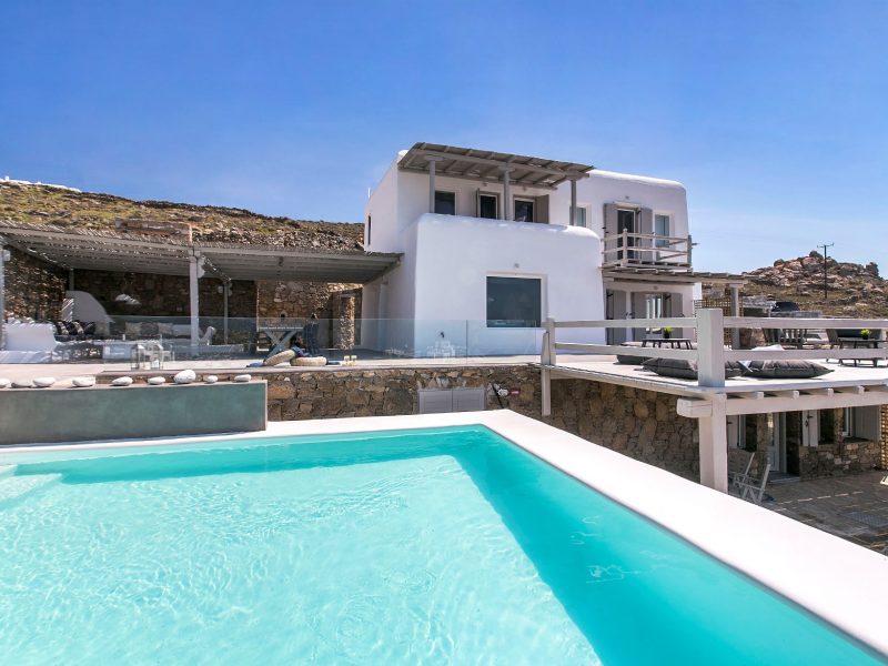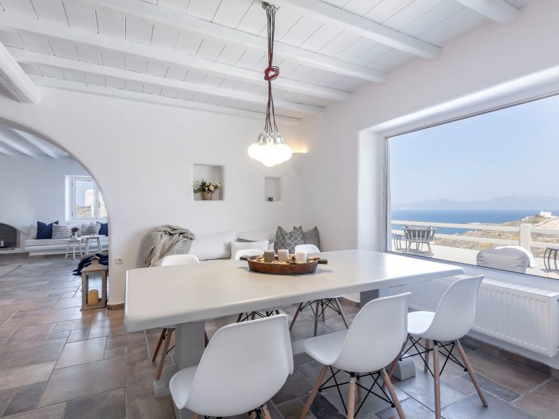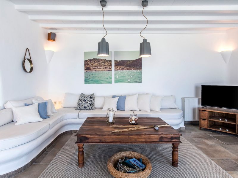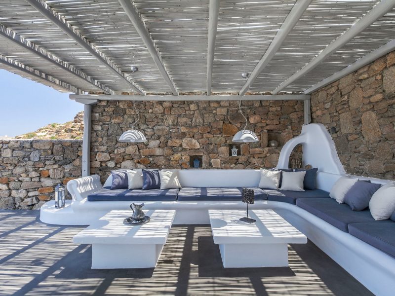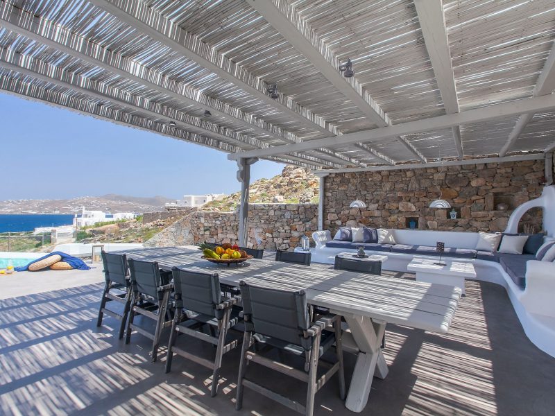 Ornos beach is only a five-minute drive from the villa…lovely! Lovelier so is the fact that after a fun-filled day out exploring the island, one can take an evening dip in the pool and rest on the inviting plush sun-beds. Villa Doria offers beautiful exterior landscaping complete with breathtaking pool resting at the crest of the Villa’s grounds, unobstructed sea views, shaded dining area as well as wooden deck with lounge areas. Yours to spoil your senses!