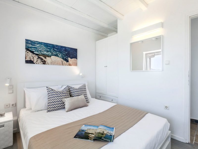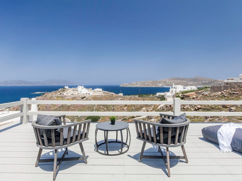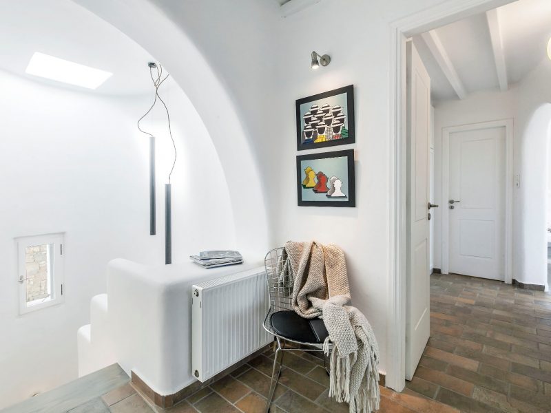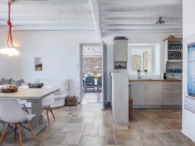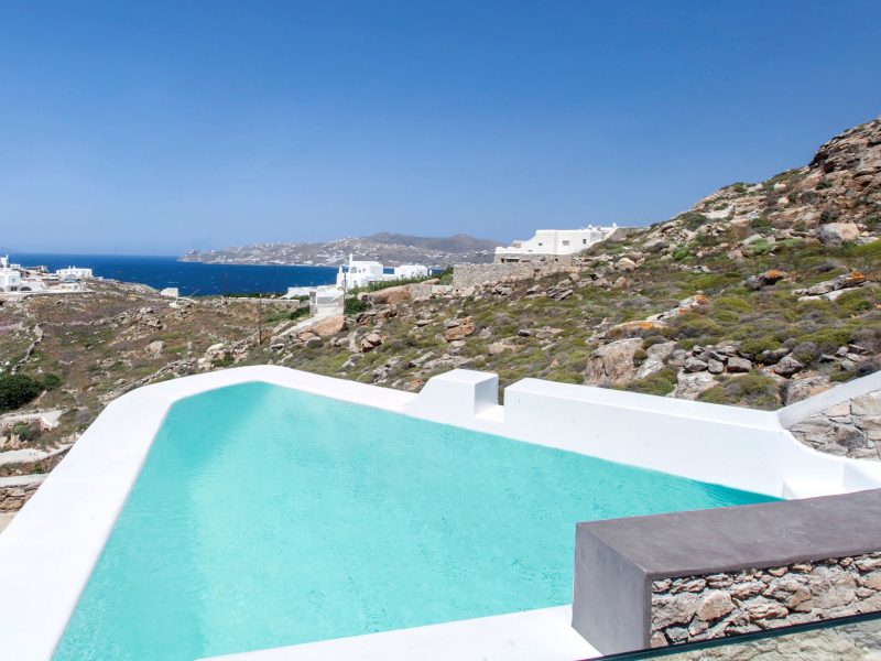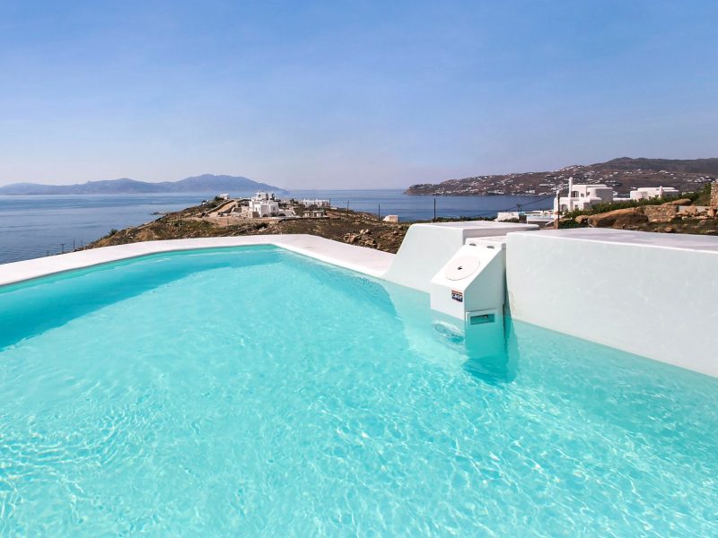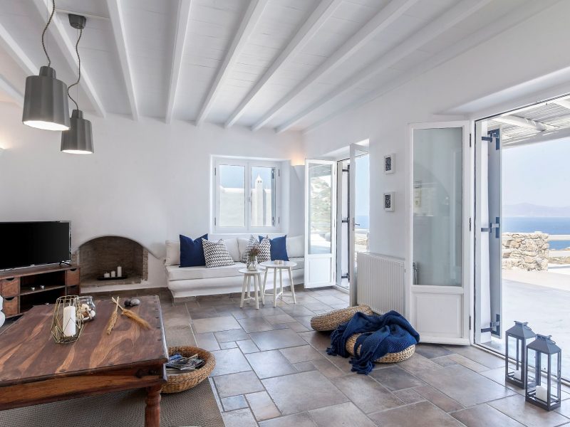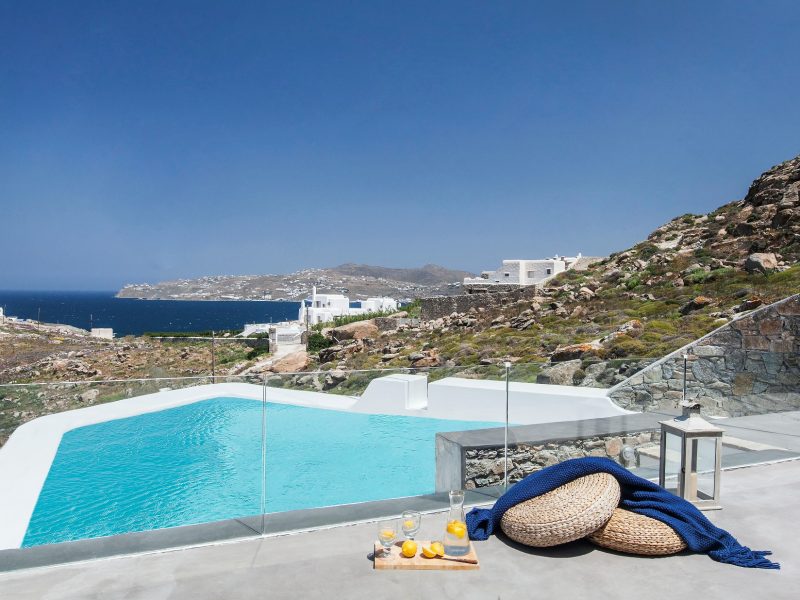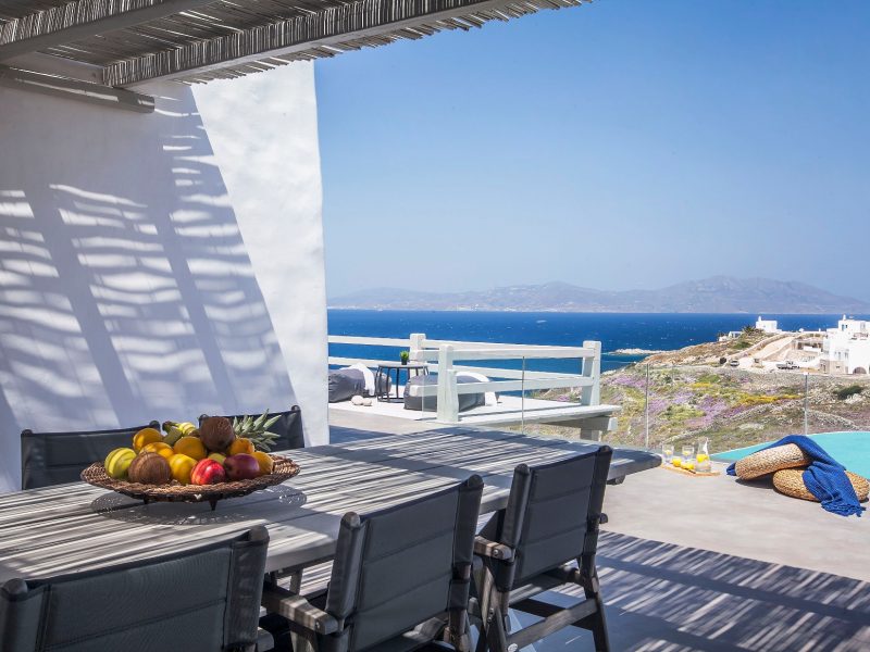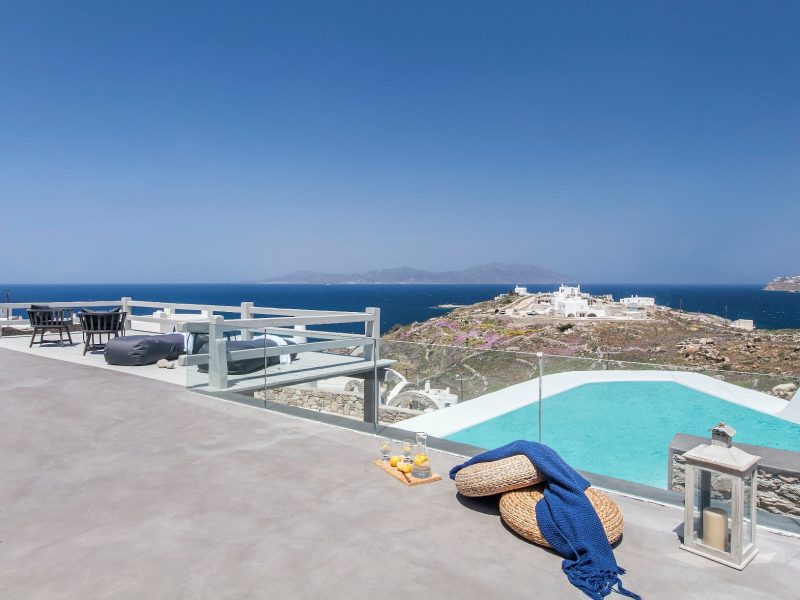 Ornos beach is only a five-minute drive from the villa…lovely! Lovelier so is the fact that after a fun-filled day out exploring the island, one can take an evening dip in the pool and rest on the inviting plush sun-beds. Villa Doria offers beautiful exterior landscaping complete with breathtaking pool resting at the crest of the Villa’s grounds, unobstructed sea views, shaded dining area as well as wooden deck with lounge areas. Yours to spoil your senses!