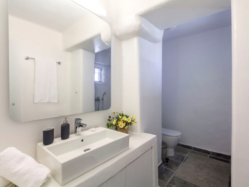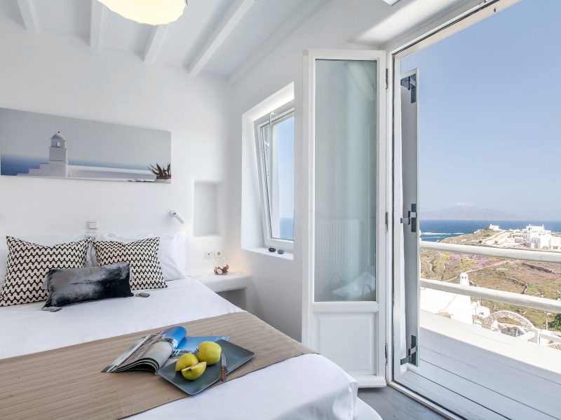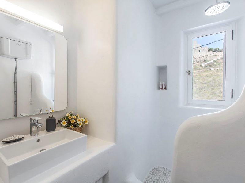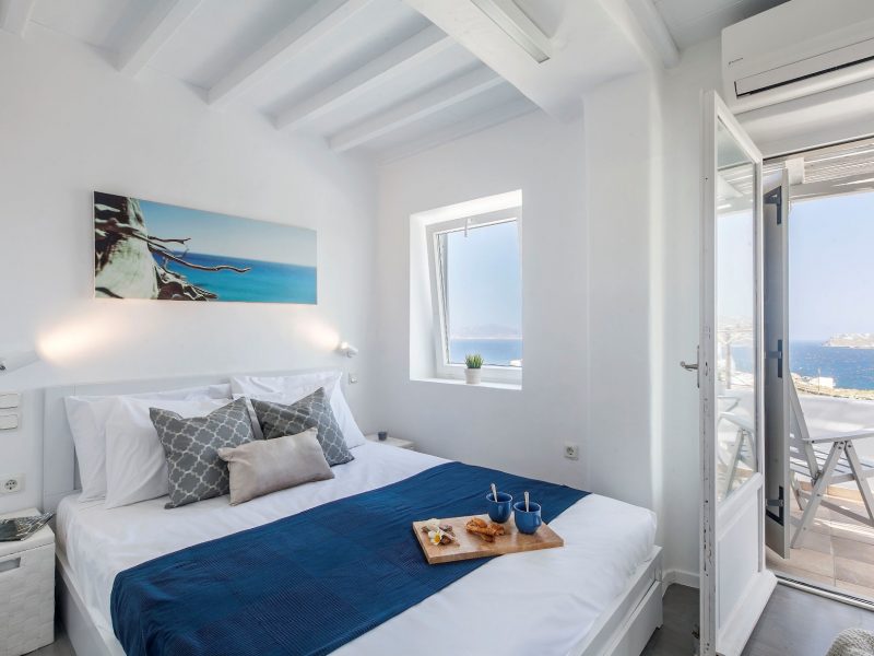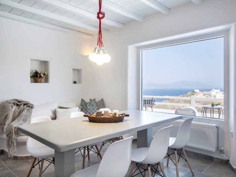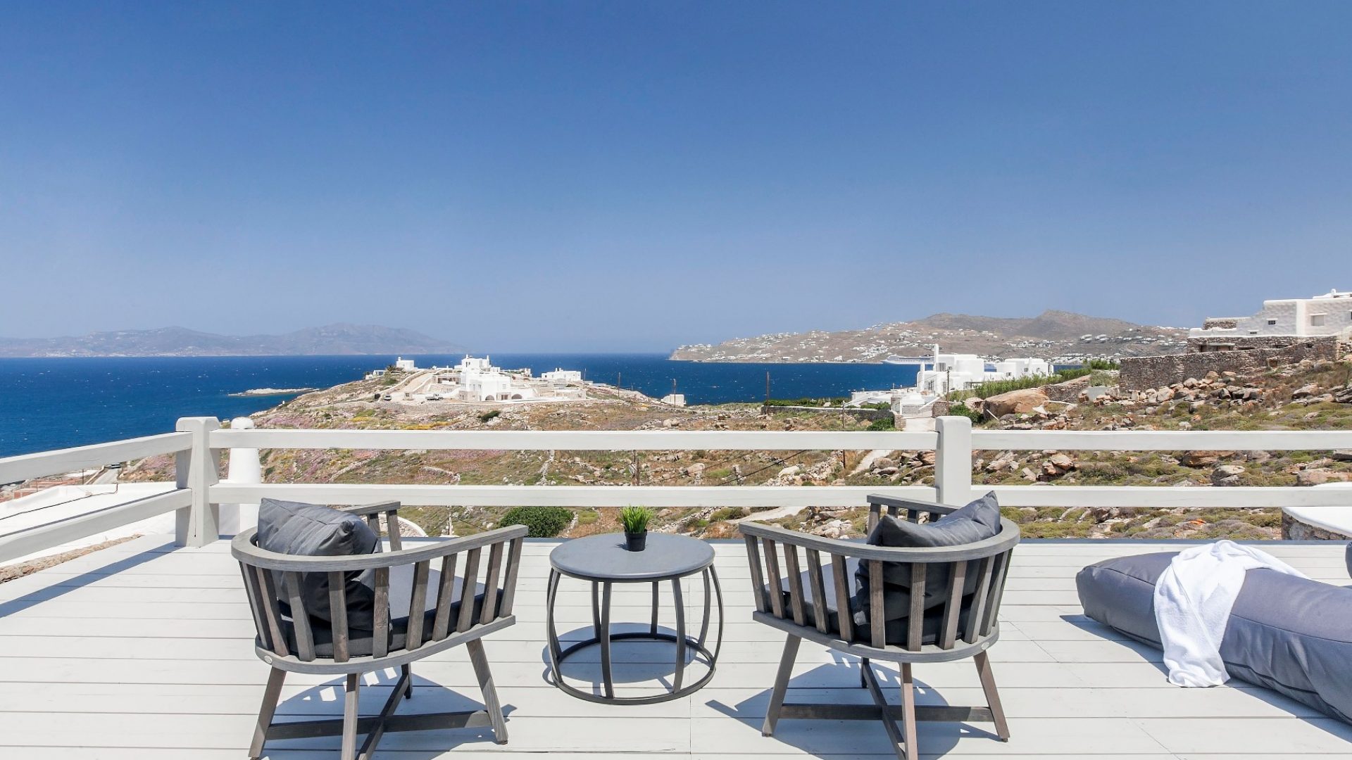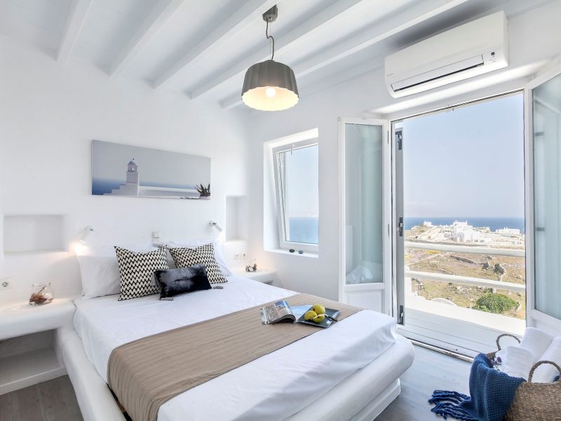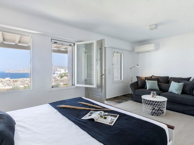 Ornos beach is only a five-minute drive from the villa…lovely! Lovelier so is the fact that after a fun-filled day out exploring the island, one can take an evening dip in the pool and rest on the inviting plush sun-beds. Villa Doria offers beautiful exterior landscaping complete with breathtaking pool resting at the crest of the Villa’s grounds, unobstructed sea views, shaded dining area as well as wooden deck with lounge areas. Yours to spoil your senses!
