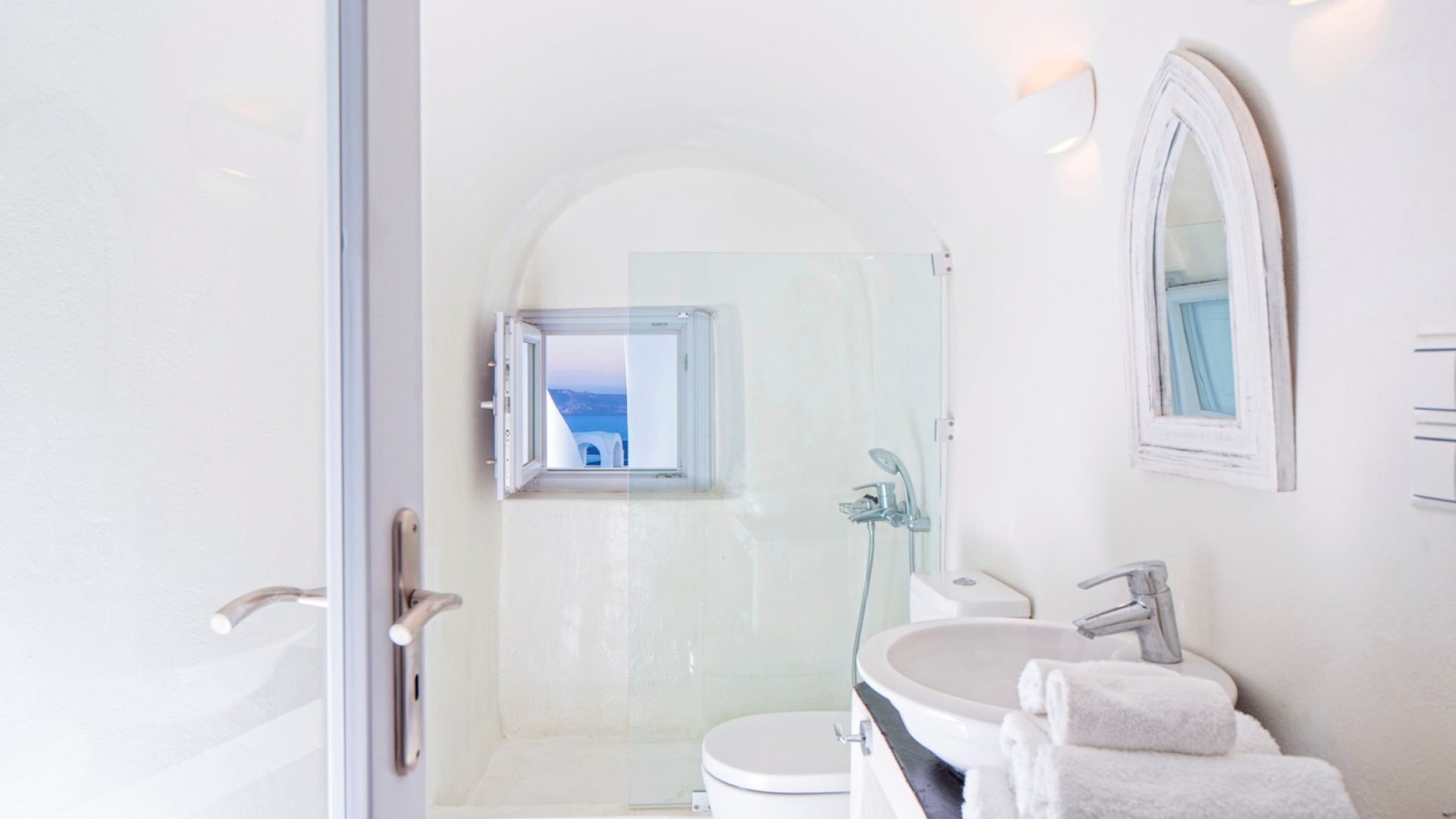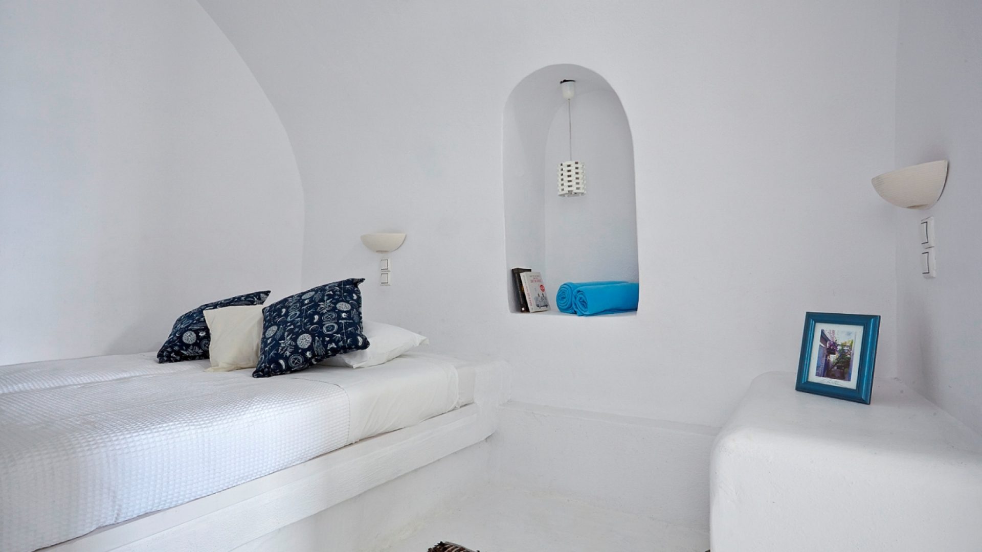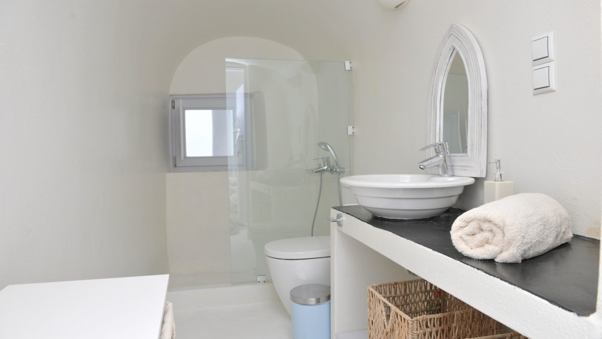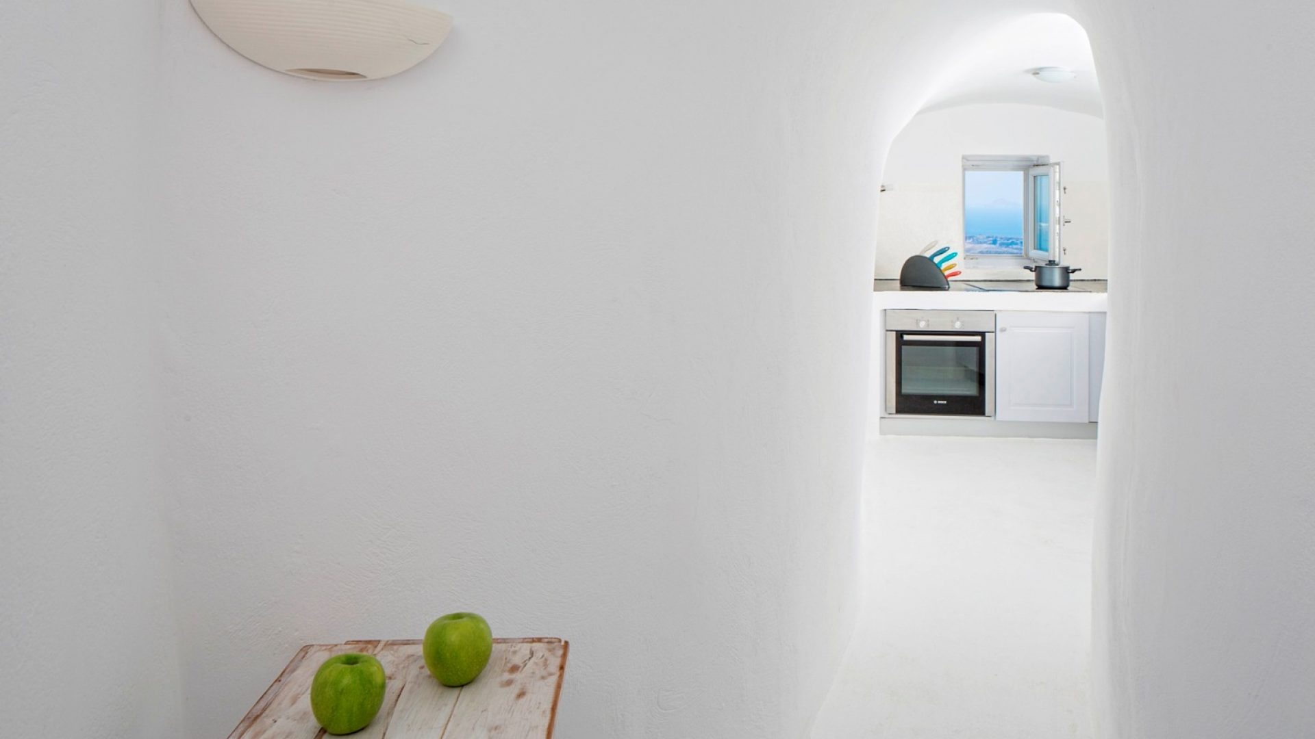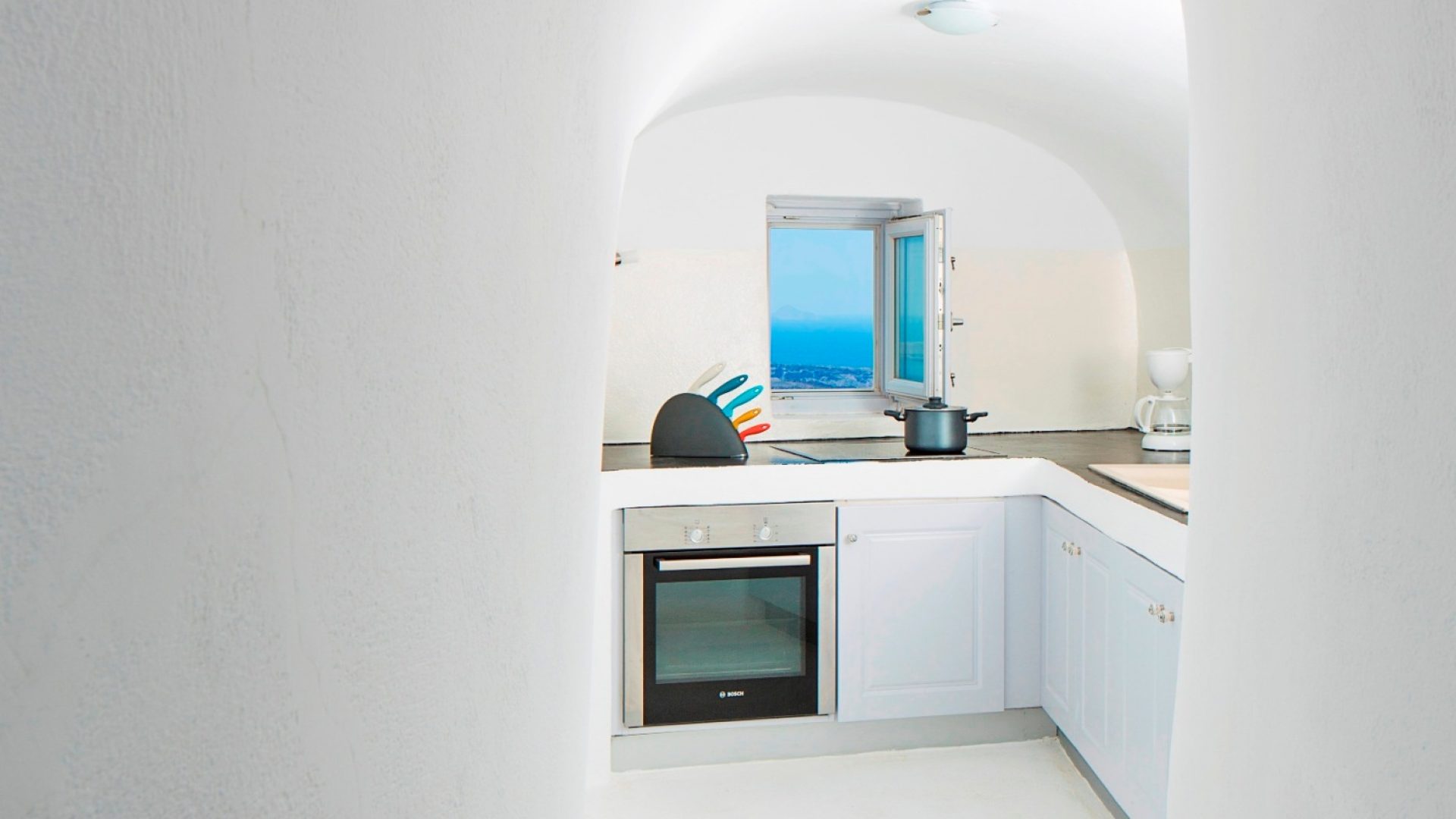 Enter the lower floor cave house – if you can take your eyes off the view that is! –which offers fresh white interiors with the continuous flow from living space to bedroom creating a quietly cool and friendly atmosphere.  This floor boasts a spacious double bedroom with a gorgeous en-suite bathroom with his and hers vanities.  Ideally a cave house for two, there is additional sleeping room for extra guests on the banquette style couch, which is serviced by a second bathroom just off the lounge. For those who love to cook, the piece-de-resistance of this villa will most definitely be the kitchen – an uninterrupted Caldera view from your stove top. A private sun-drenched terrace with soul-stirring views and outdoor Jacuzzi – plunge pool complete the picture.