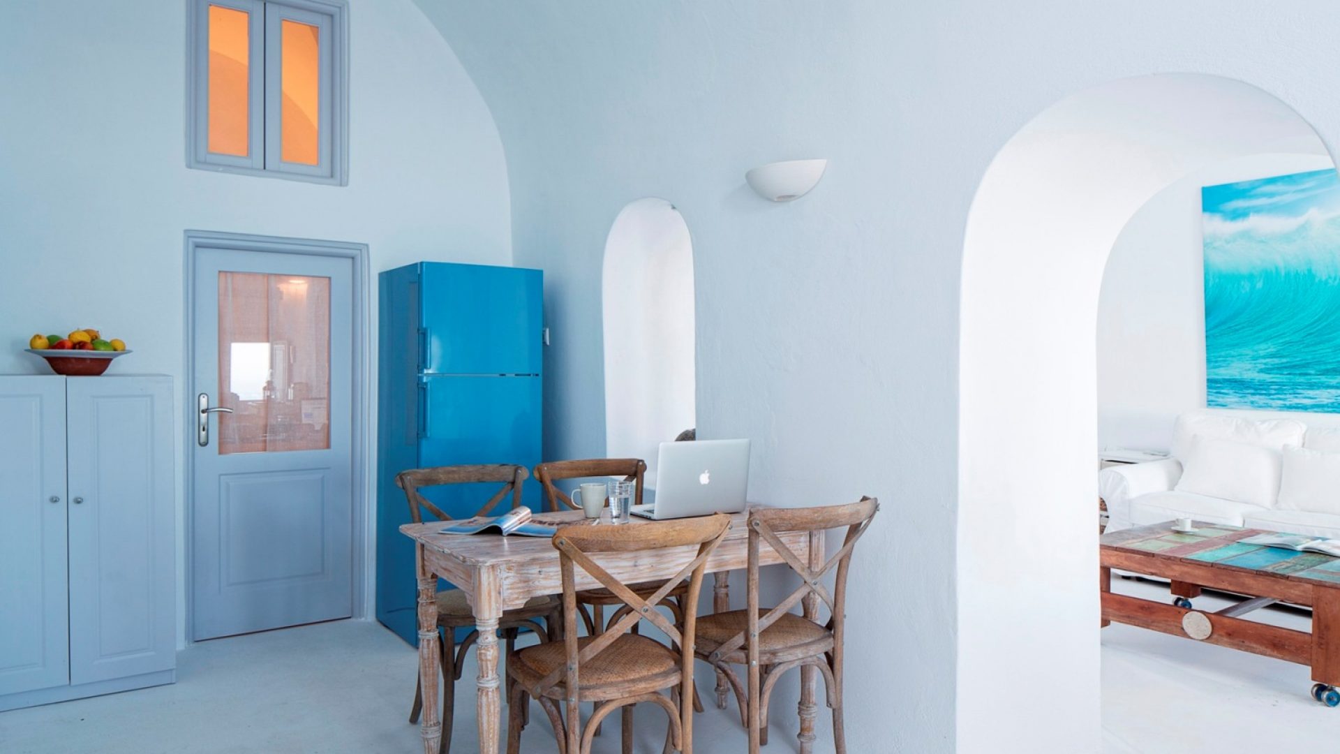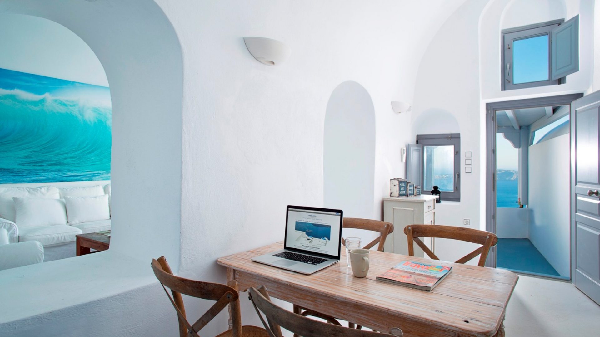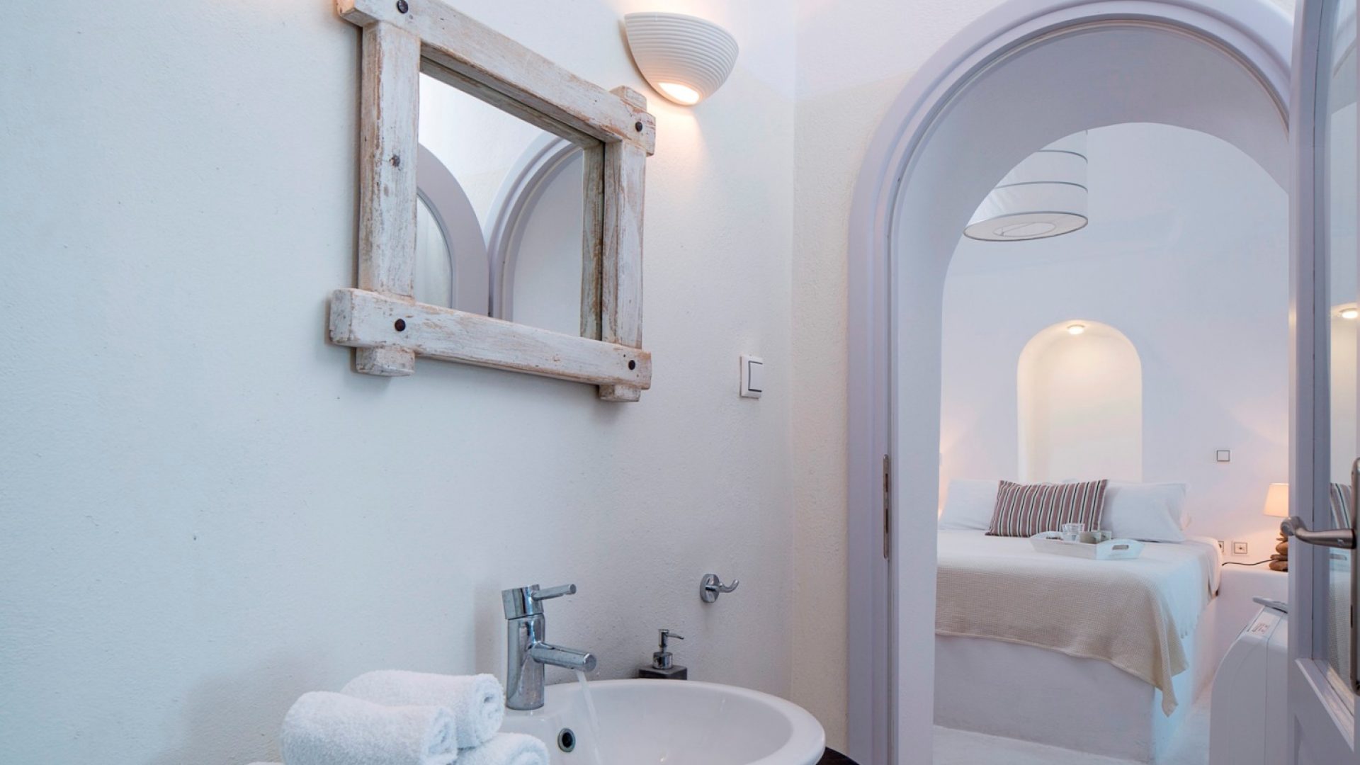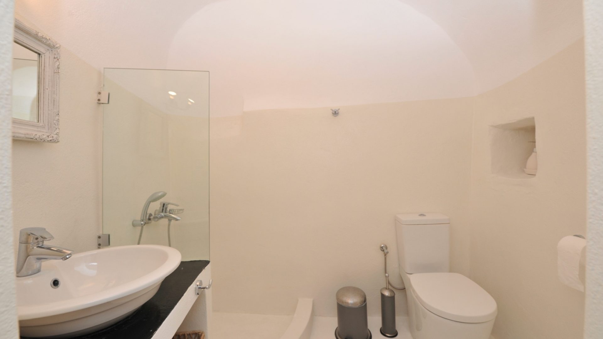 Enter the lower floor cave house – if you can take your eyes off the view that is! –which offers fresh white interiors with the continuous flow from living space to bedroom creating a quietly cool and friendly atmosphere.  This floor boasts a spacious double bedroom with a gorgeous en-suite bathroom with his and hers vanities.  Ideally a cave house for two, there is additional sleeping room for extra guests on the banquette style couch, which is serviced by a second bathroom just off the lounge. For those who love to cook, the piece-de-resistance of this villa will most definitely be the kitchen – an uninterrupted Caldera view from your stove top. A private sun-drenched terrace with soul-stirring views and outdoor Jacuzzi – plunge pool complete the picture.