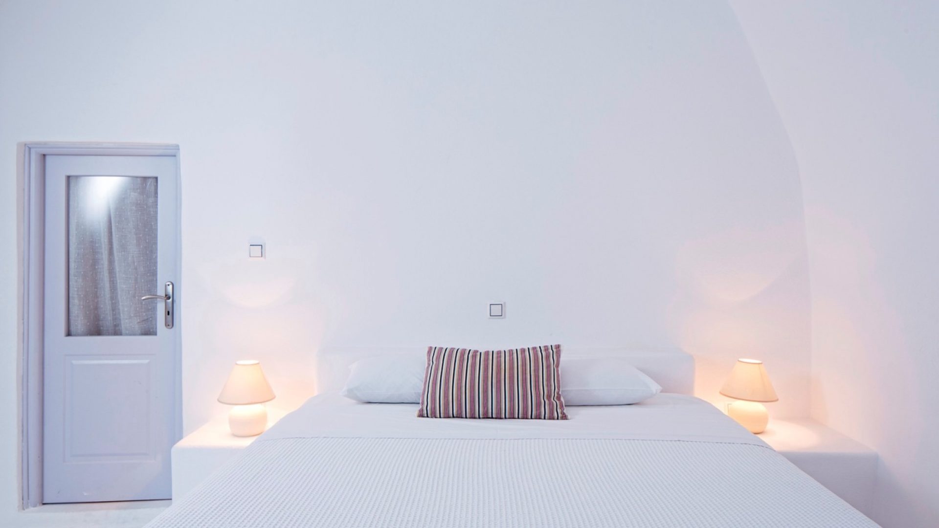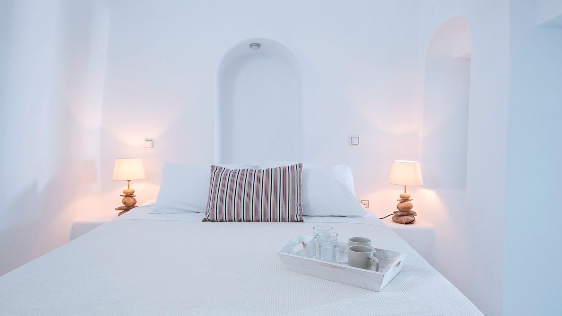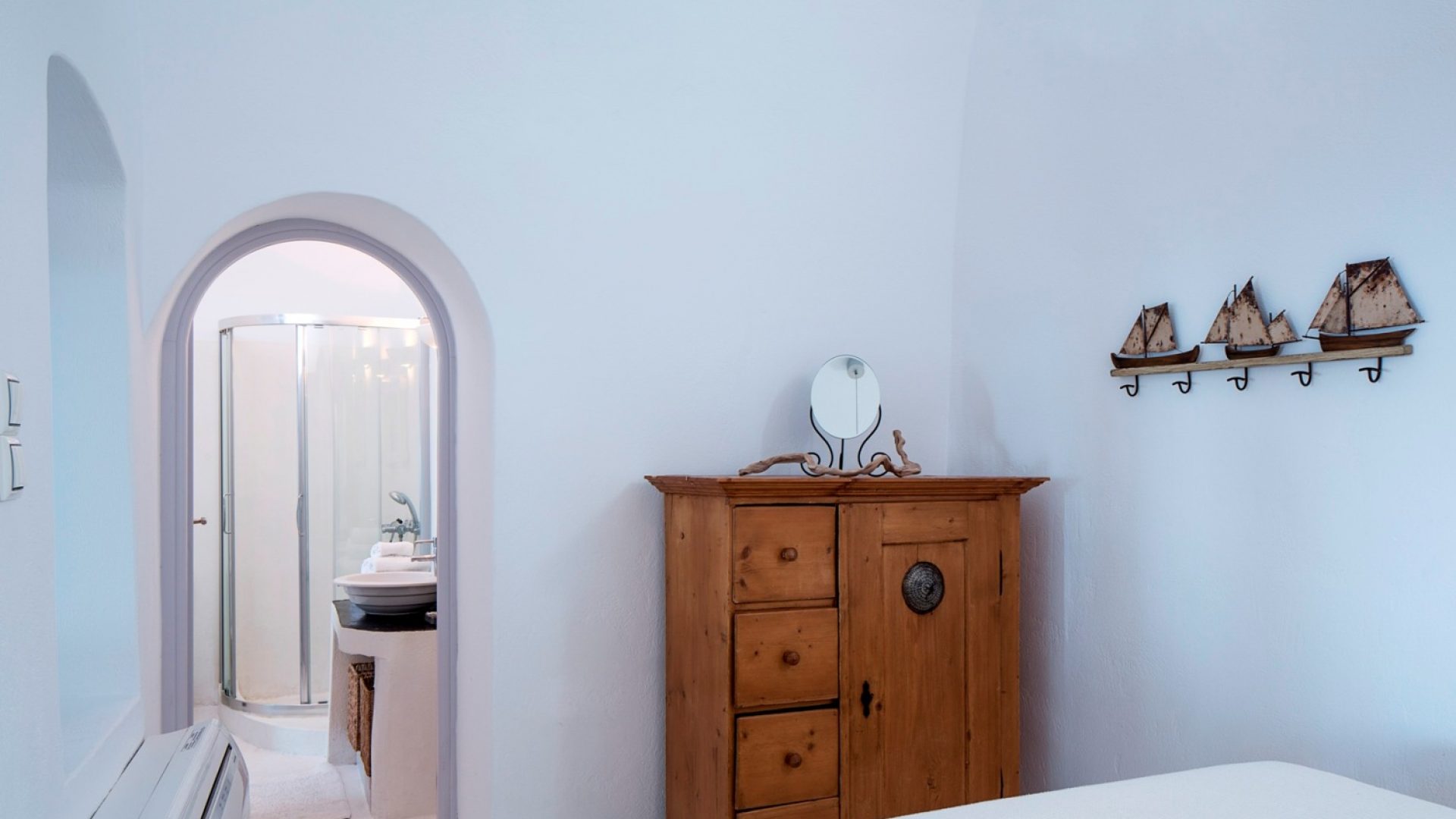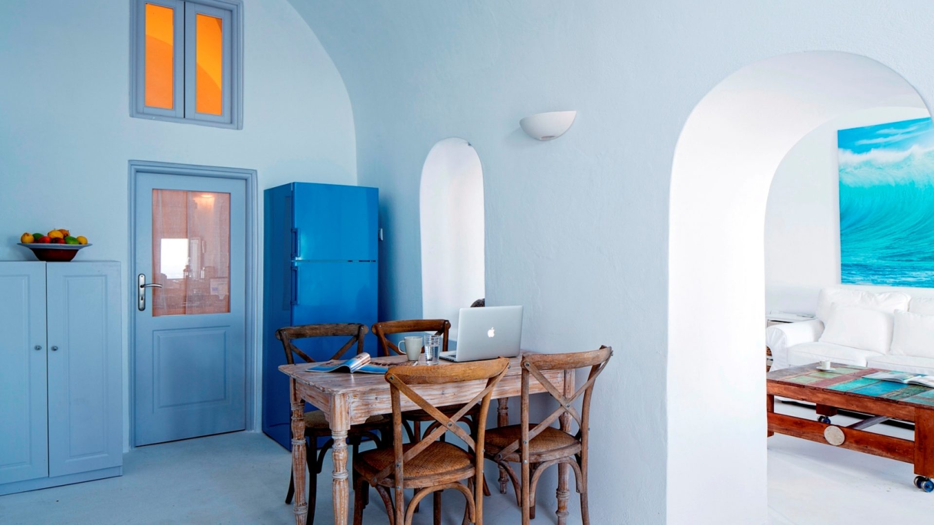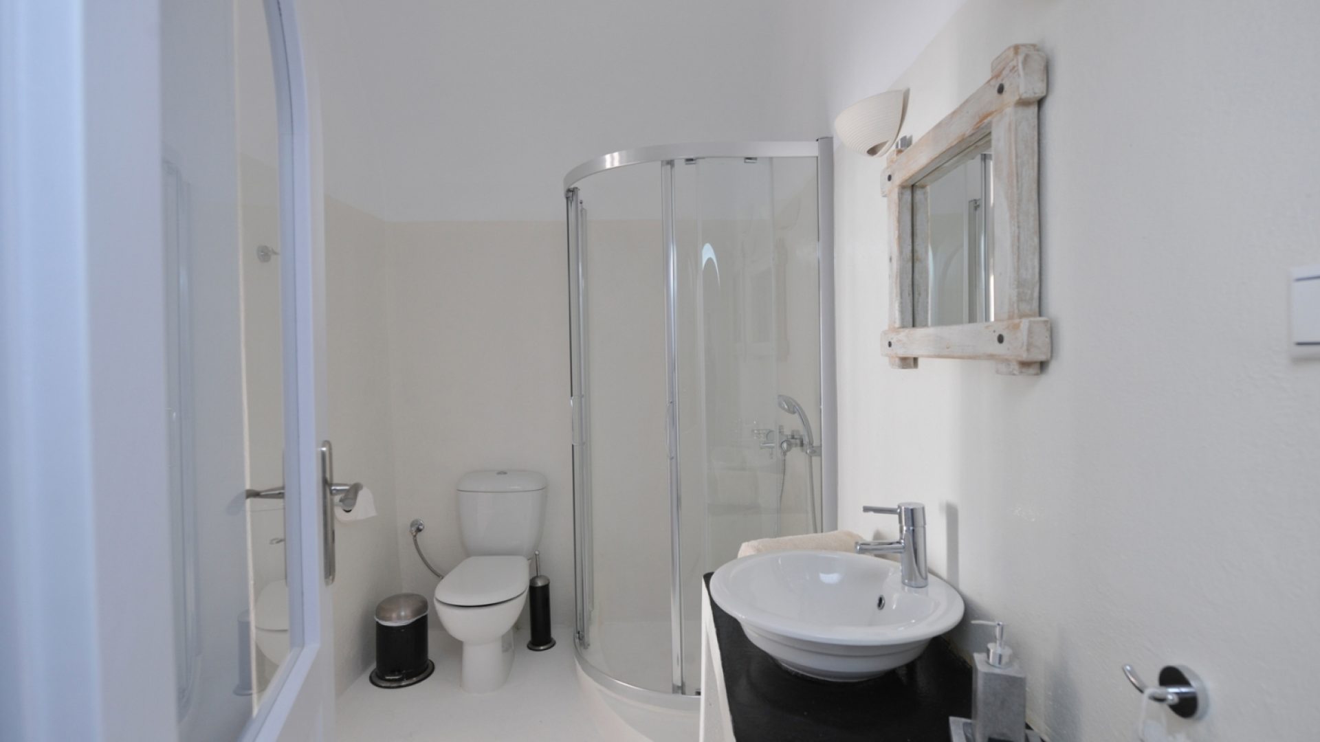 Enter the lower floor cave house – if you can take your eyes off the view that is! –which offers fresh white interiors with the continuous flow from living space to bedroom creating a quietly cool and friendly atmosphere.  This floor boasts a spacious double bedroom with a gorgeous en-suite bathroom with his and hers vanities.  Ideally a cave house for two, there is additional sleeping room for extra guests on the banquette style couch, which is serviced by a second bathroom just off the lounge. For those who love to cook, the piece-de-resistance of this villa will most definitely be the kitchen – an uninterrupted Caldera view from your stove top. A private sun-drenched terrace with soul-stirring views and outdoor Jacuzzi – plunge pool complete the picture.