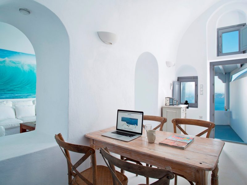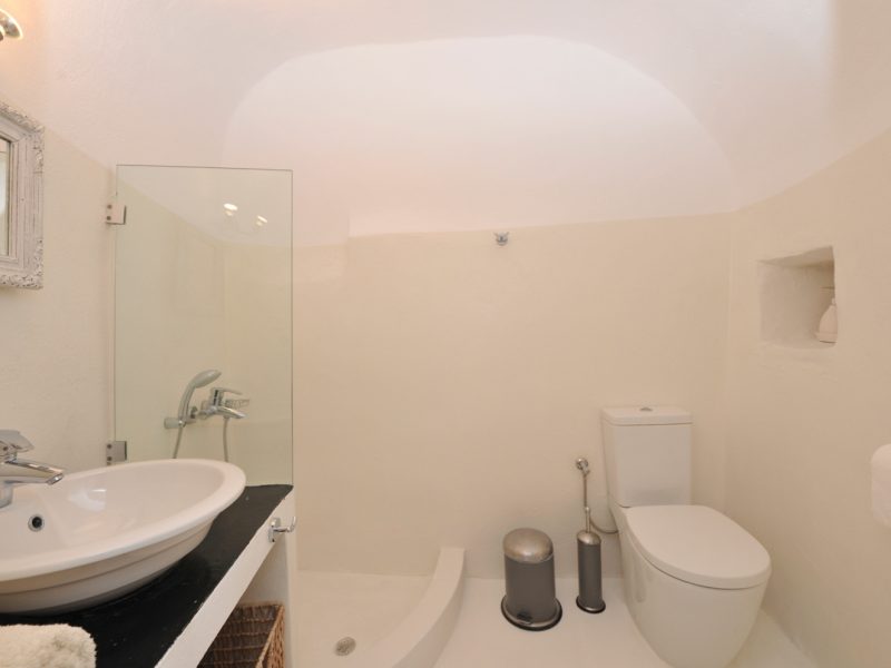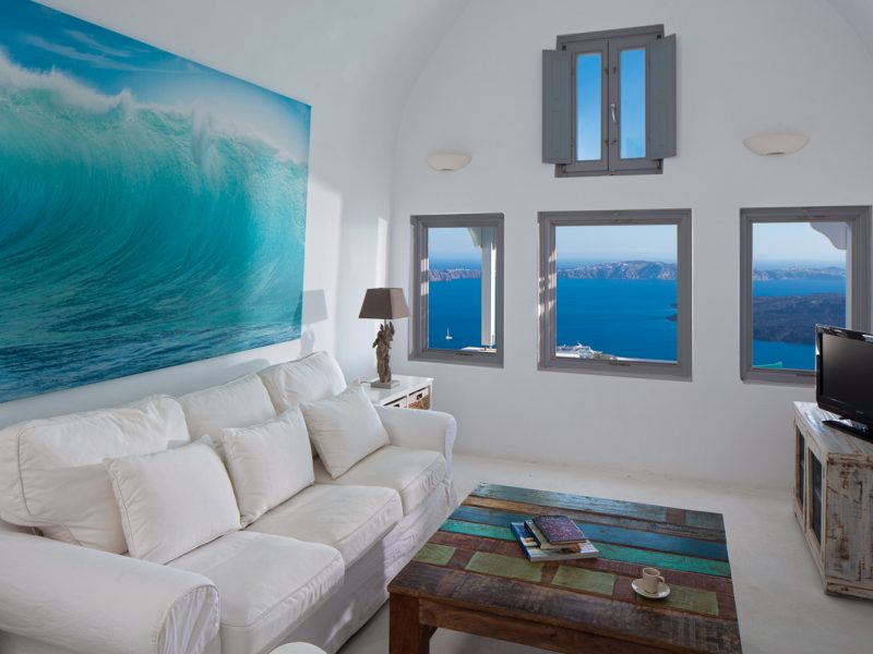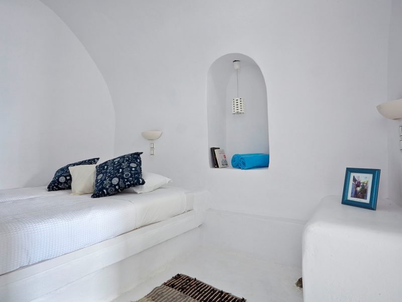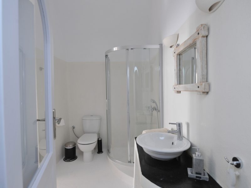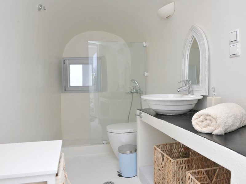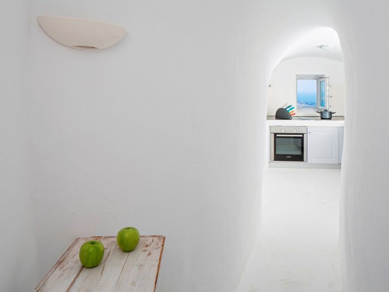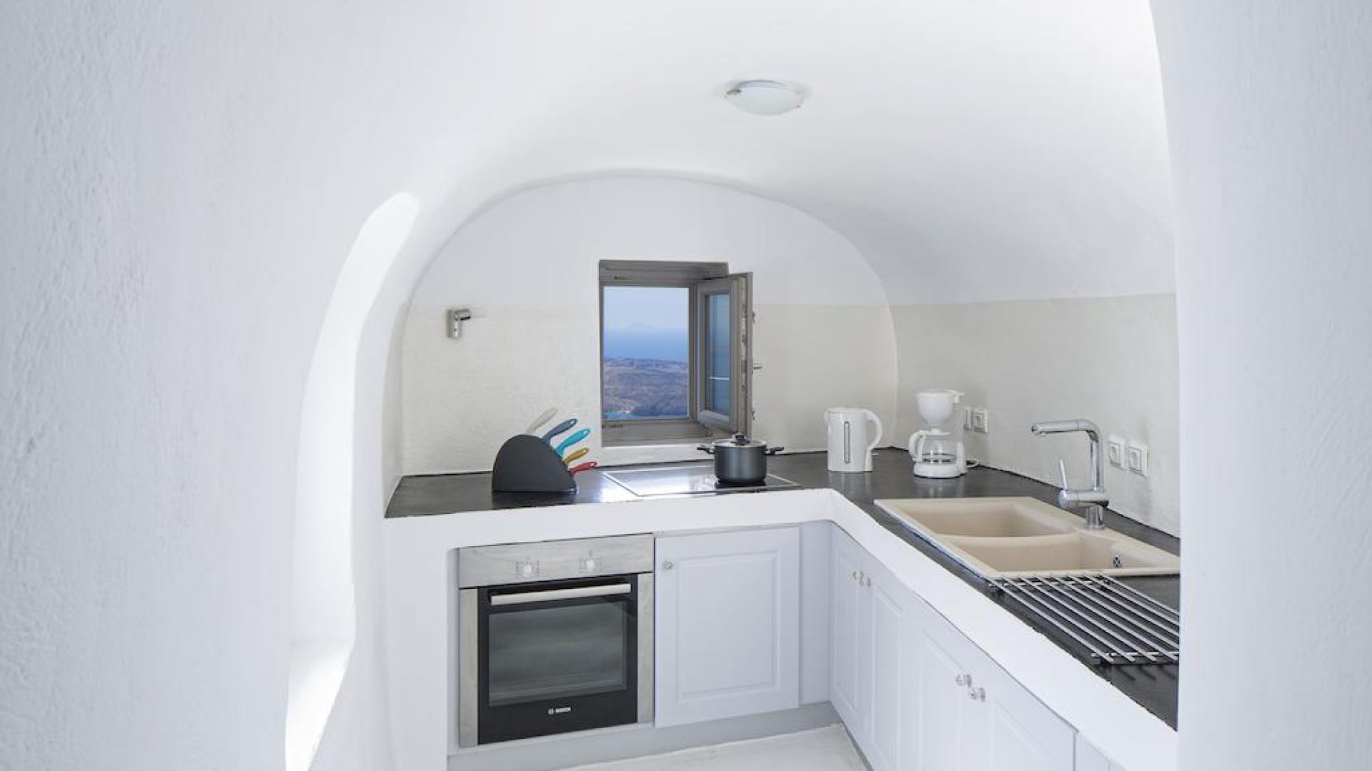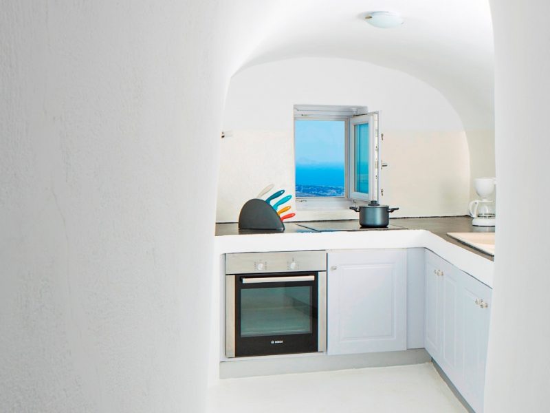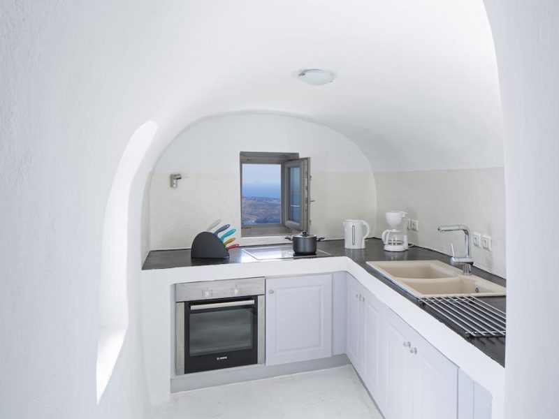 Enter the lower floor cave house – if you can take your eyes off the view that is! –which offers fresh white interiors with the continuous flow from living space to bedroom creating a quietly cool and friendly atmosphere.  This floor boasts a spacious double bedroom with a gorgeous en-suite bathroom with his and hers vanities.  Ideally a cave house for two, there is additional sleeping room for extra guests on the banquette style couch, which is serviced by a second bathroom just off the lounge. For those who love to cook, the piece-de-resistance of this villa will most definitely be the kitchen – an uninterrupted Caldera view from your stove top. A private sun-drenched terrace with soul-stirring views and outdoor Jacuzzi – plunge pool complete the picture.