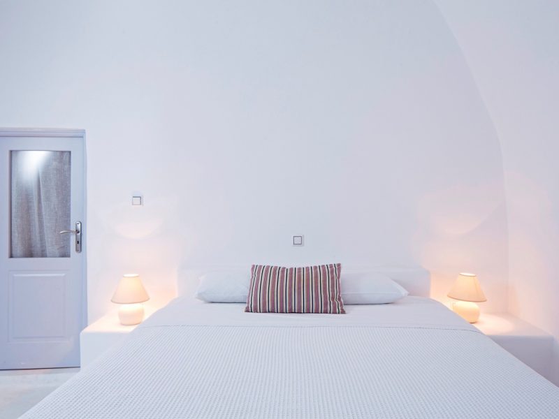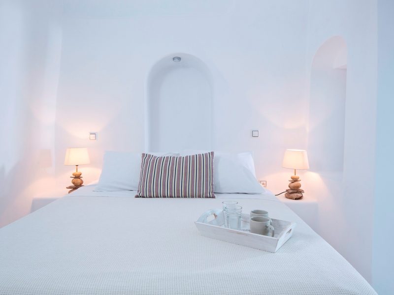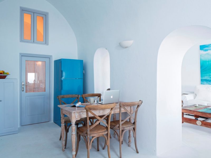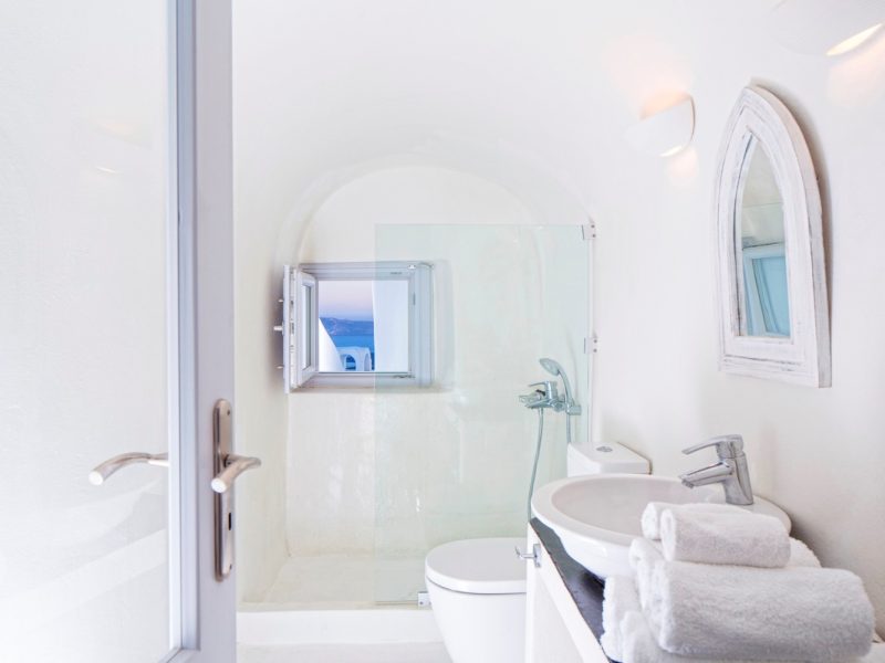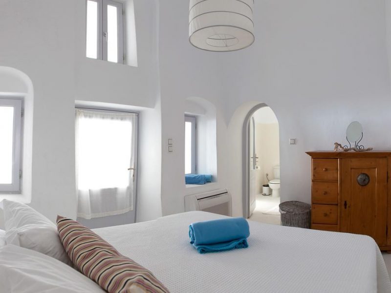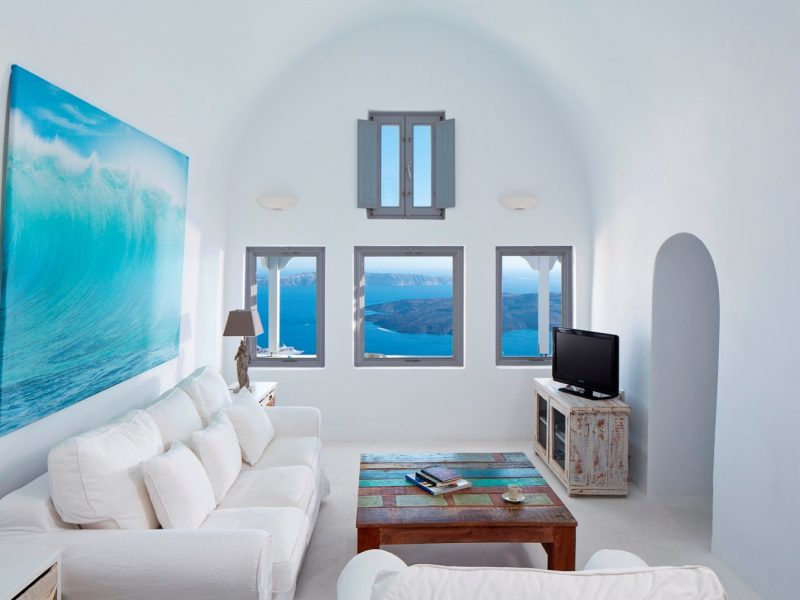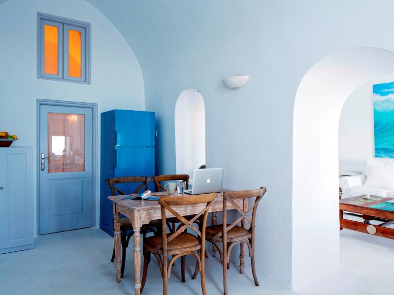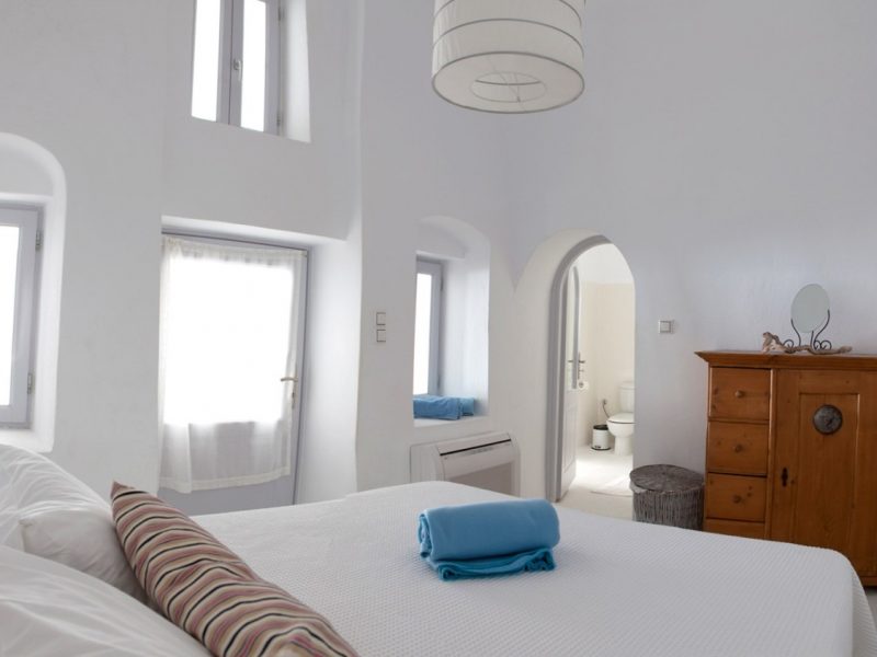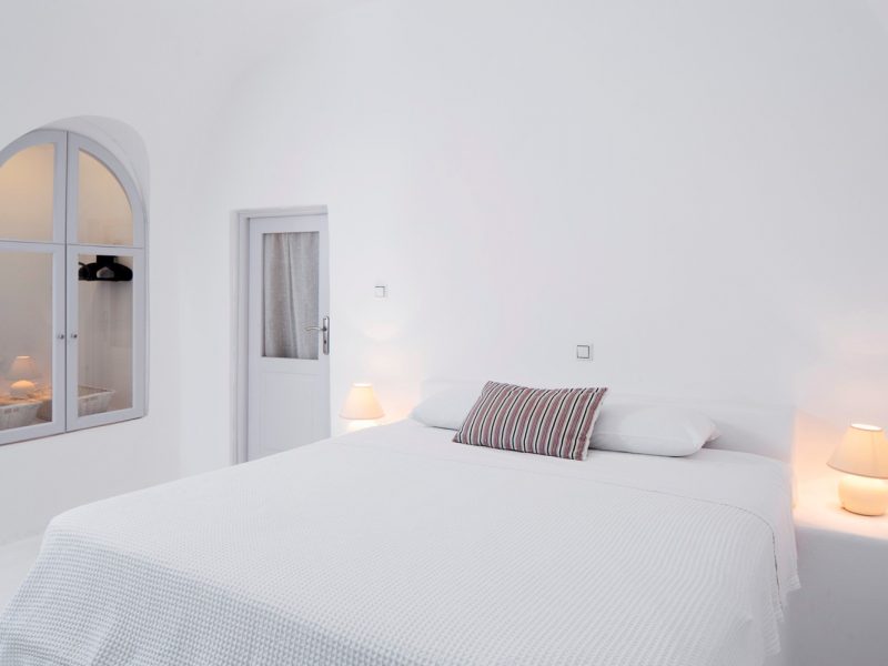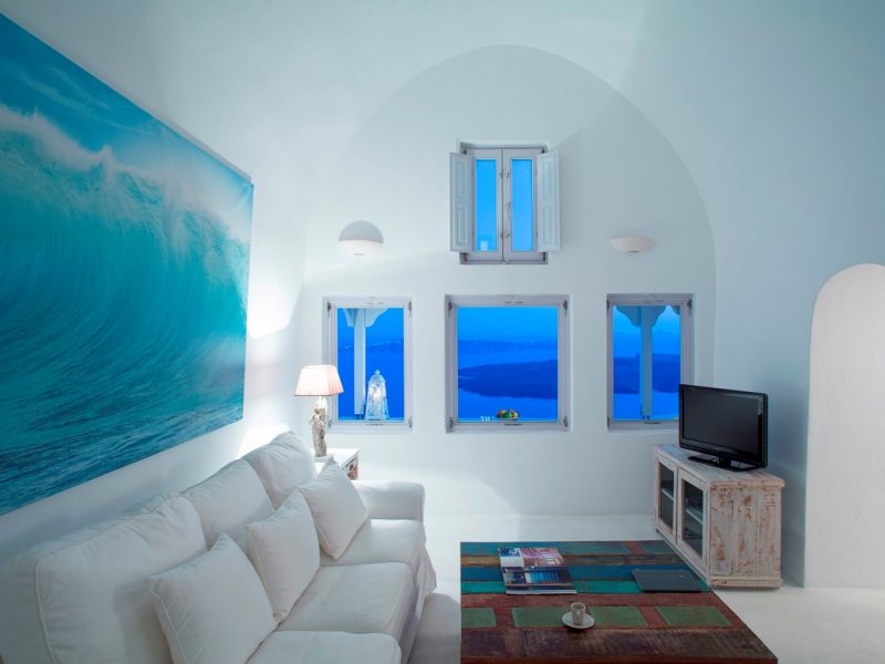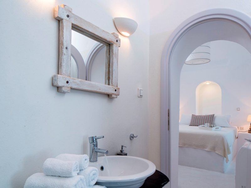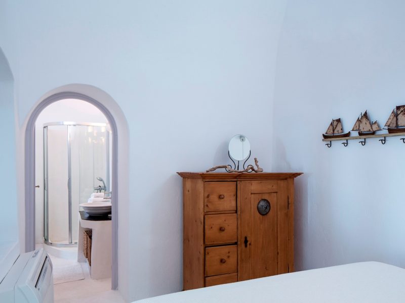 Enter the lower floor cave house – if you can take your eyes off the view that is! –which offers fresh white interiors with the continuous flow from living space to bedroom creating a quietly cool and friendly atmosphere.  This floor boasts a spacious double bedroom with a gorgeous en-suite bathroom with his and hers vanities.  Ideally a cave house for two, there is additional sleeping room for extra guests on the banquette style couch, which is serviced by a second bathroom just off the lounge. For those who love to cook, the piece-de-resistance of this villa will most definitely be the kitchen – an uninterrupted Caldera view from your stove top. A private sun-drenched terrace with soul-stirring views and outdoor Jacuzzi – plunge pool complete the picture.