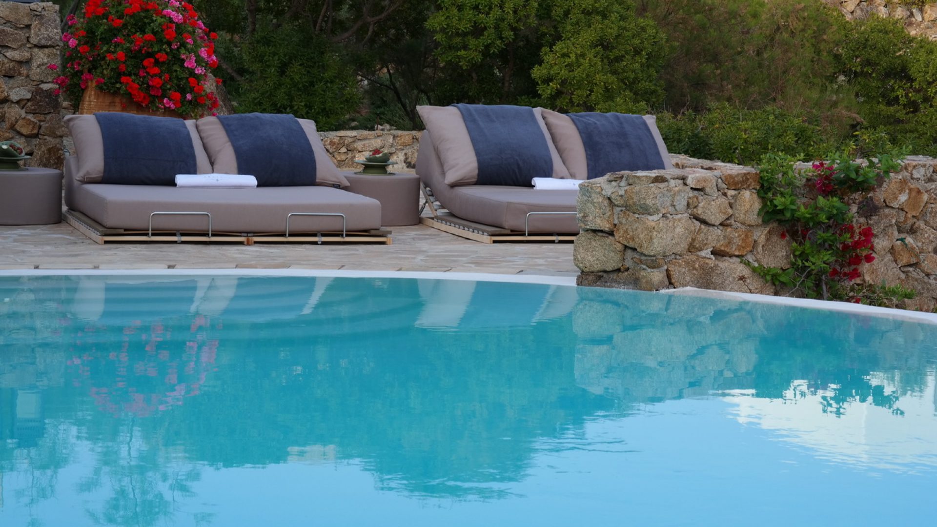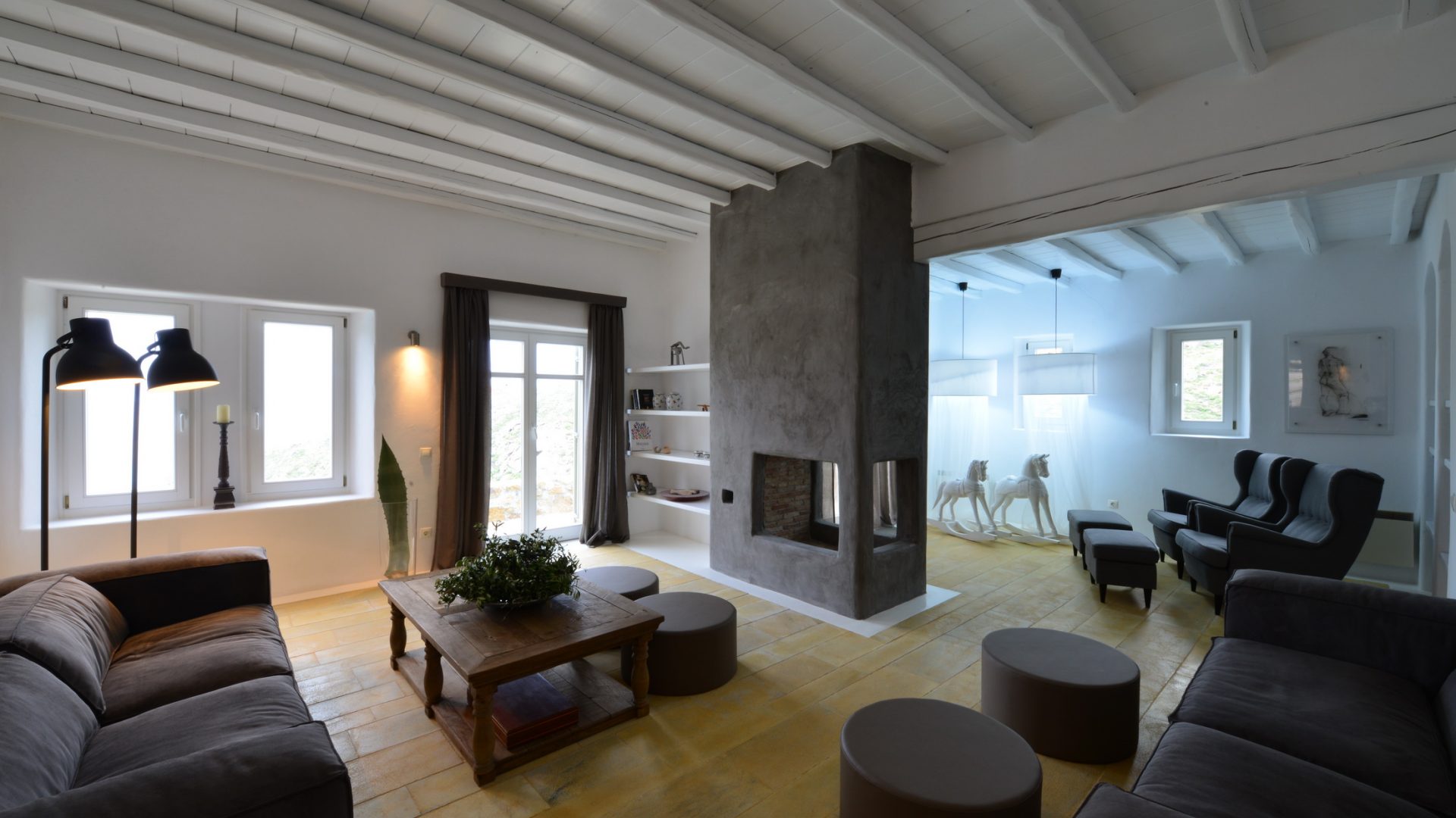 The large swimming pool is located at the center of the outside terrace, with swings hanging above to make you feel that you are flying over Agrari bay. Huge sun loungers are fitted around the pool while the bar by the lower pool terrace can accommodate you with cocktails of your desire. There is also an alfresco wood fire BBQ and a dining area seating 12.