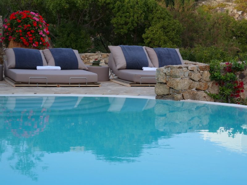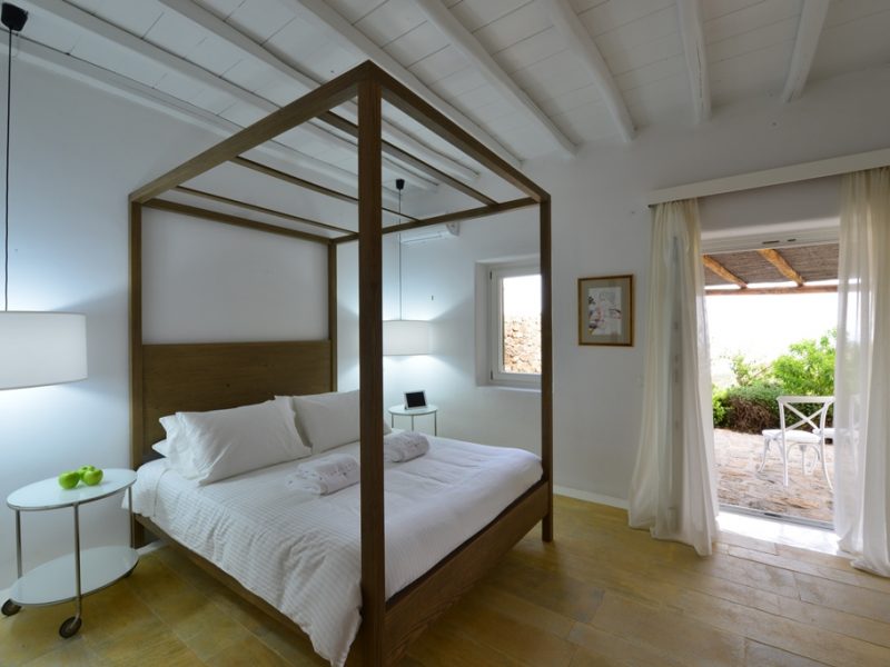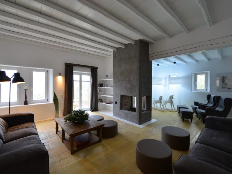 The large swimming pool is located at the center of the outside terrace, with swings hanging above to make you feel that you are flying over Agrari bay. Huge sun loungers are fitted around the pool while the bar by the lower pool terrace can accommodate you with cocktails of your desire. There is also an alfresco wood fire BBQ and a dining area seating 12.
