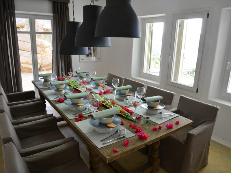 Villa Elegante consists of the main house, the guest pool house and the secret suite. The main house is built on three different levels. The ground level features the living and the dining room, with direct access to the pool and private verandas, with gorgeous views on to the Aegean Sea. This level is set with a fully equipped kitchen, next to the dining area with seating for 12.