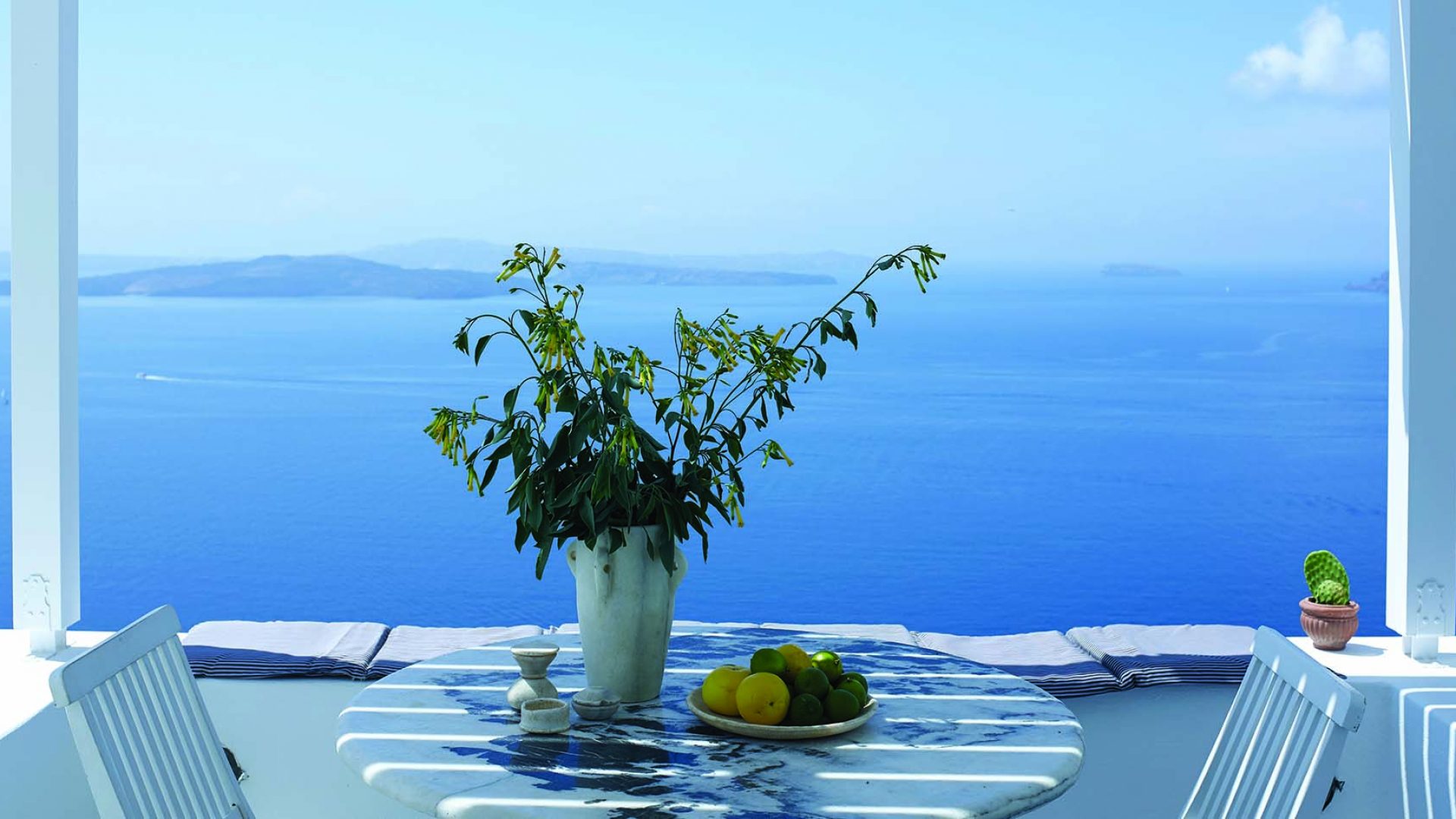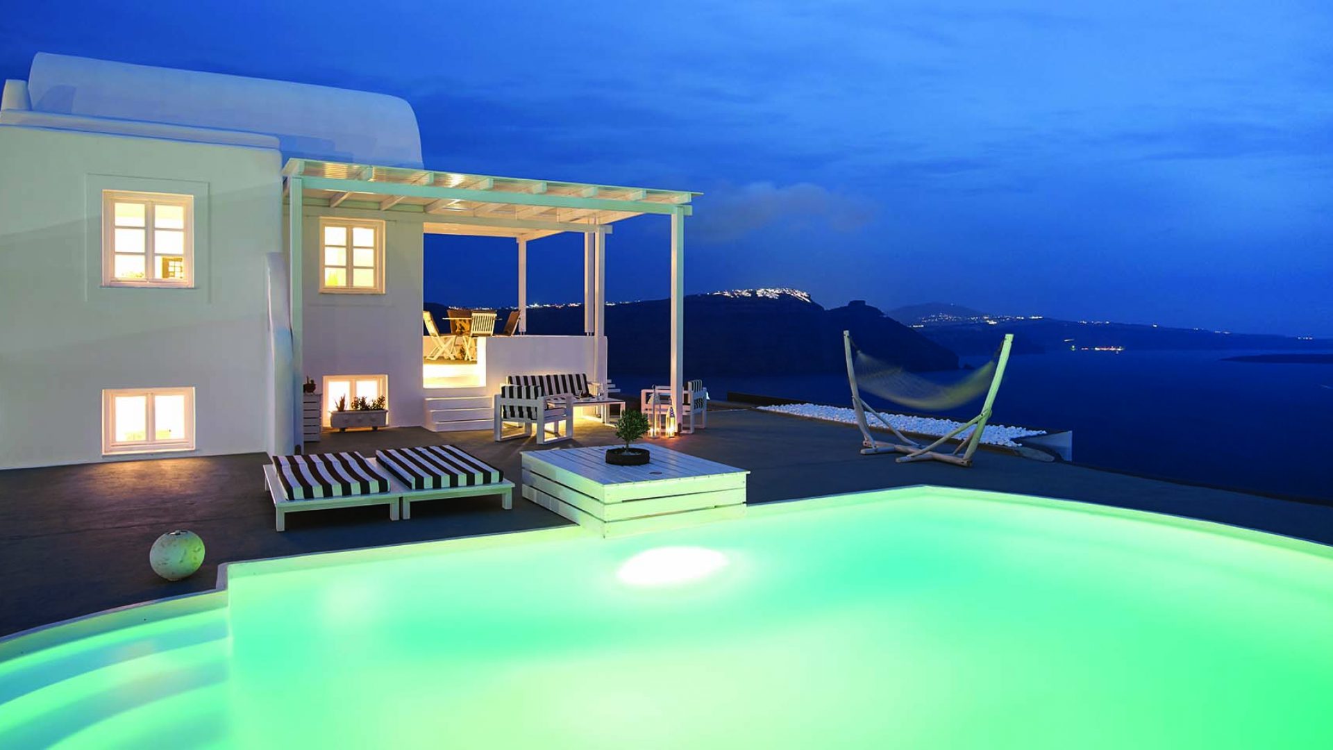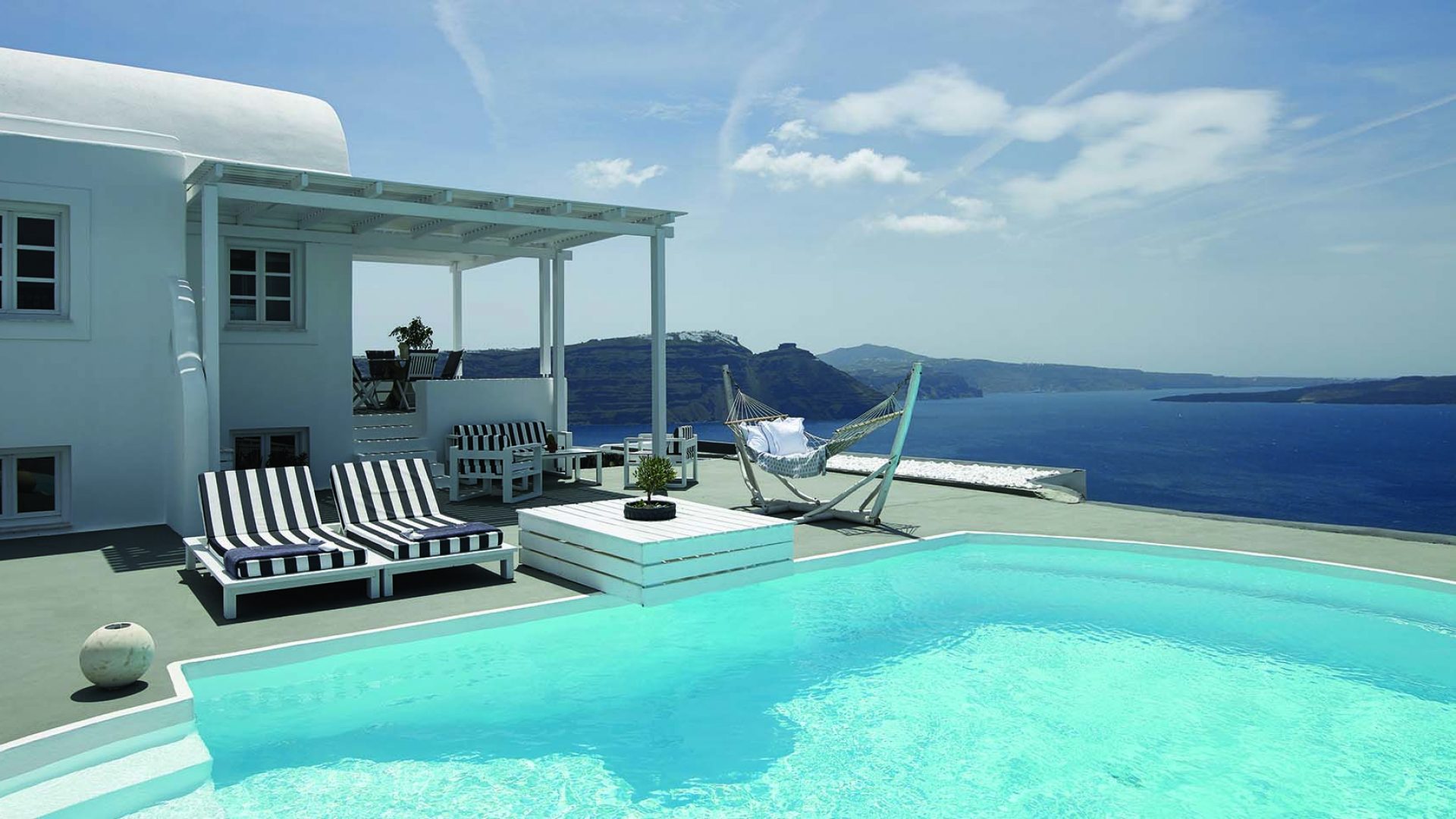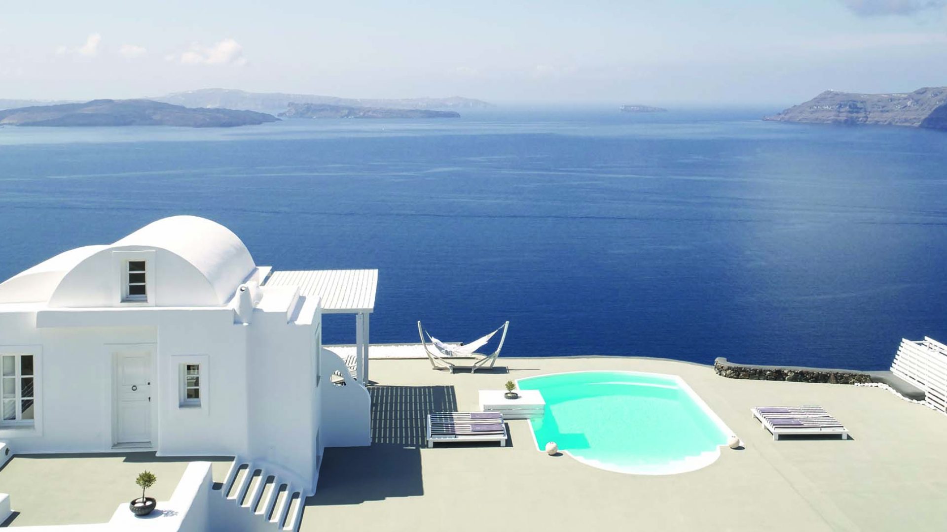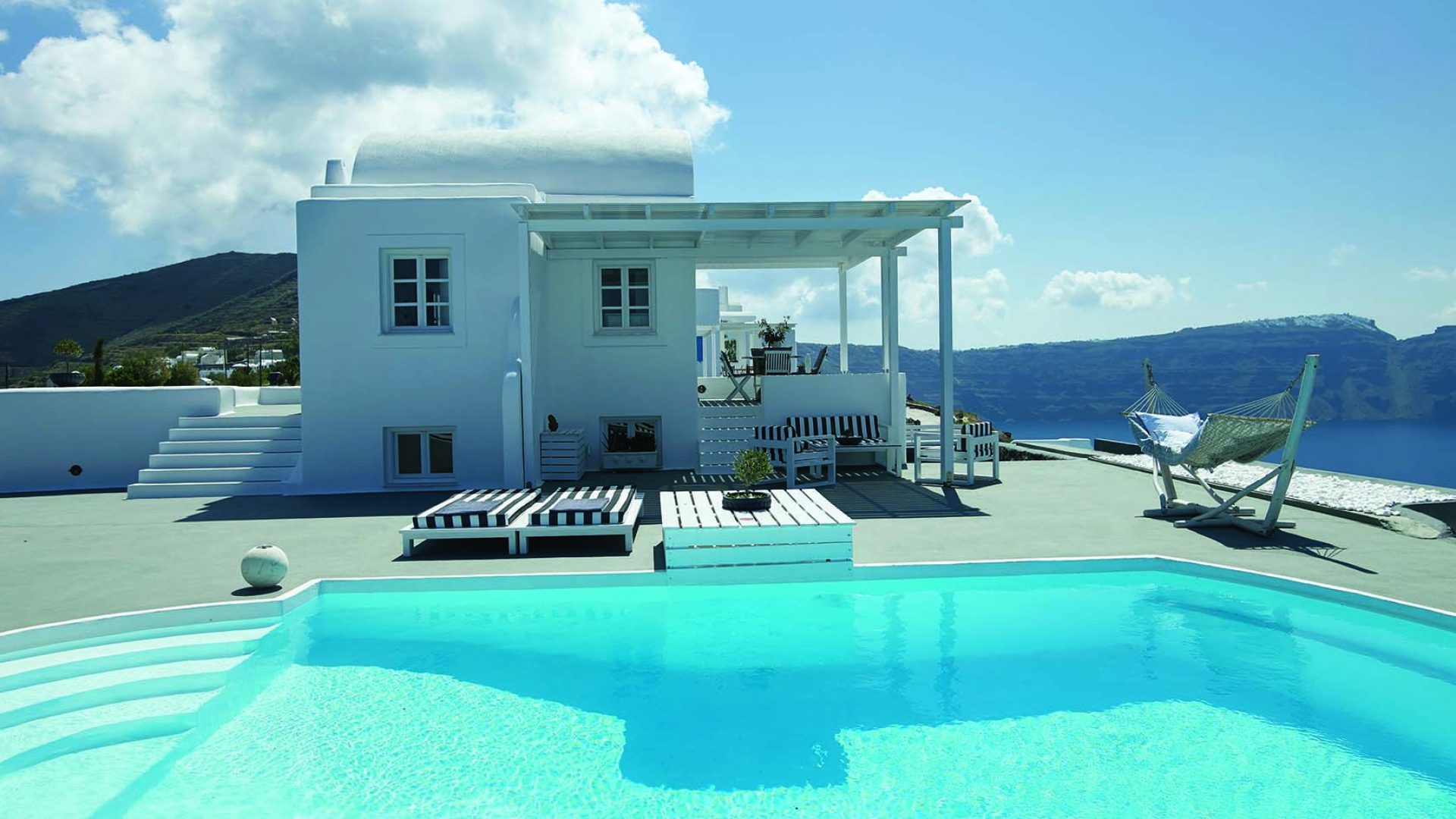 Perfectly adapted to the beauty of Santorini, the indoor decoration of the villa get inspiration from the Cycladic white and minimalism, composing a fairytale atmosphere for its guests. Designer furniture, high-end technologies, unique colorful details and exclusive services, promise to offer guests the essence of luxurious, peaceful holidays in Greece.