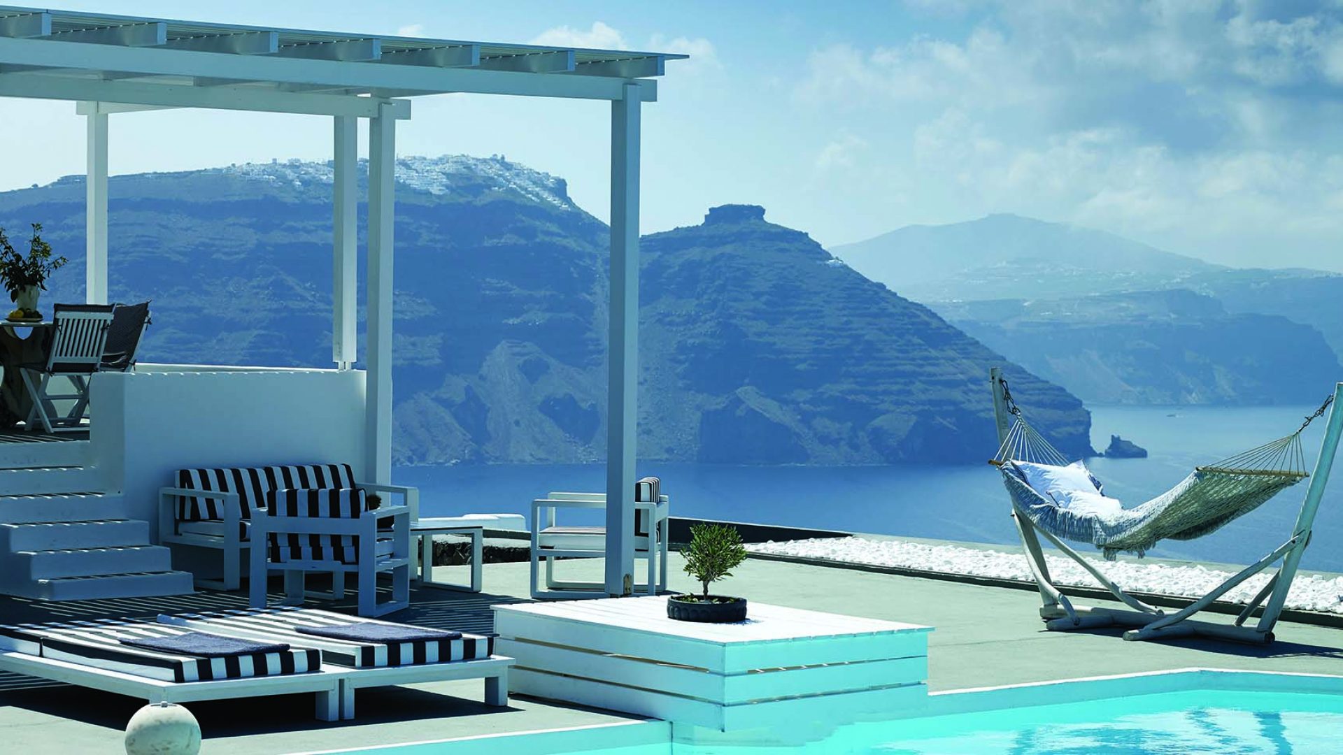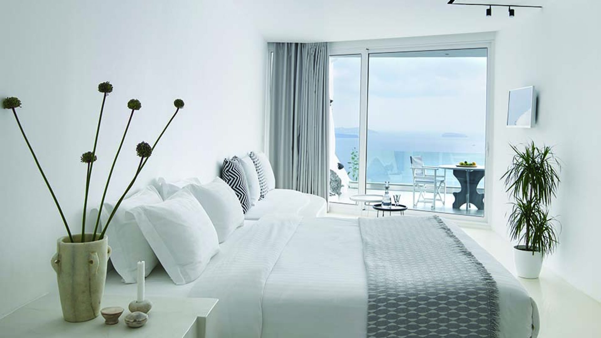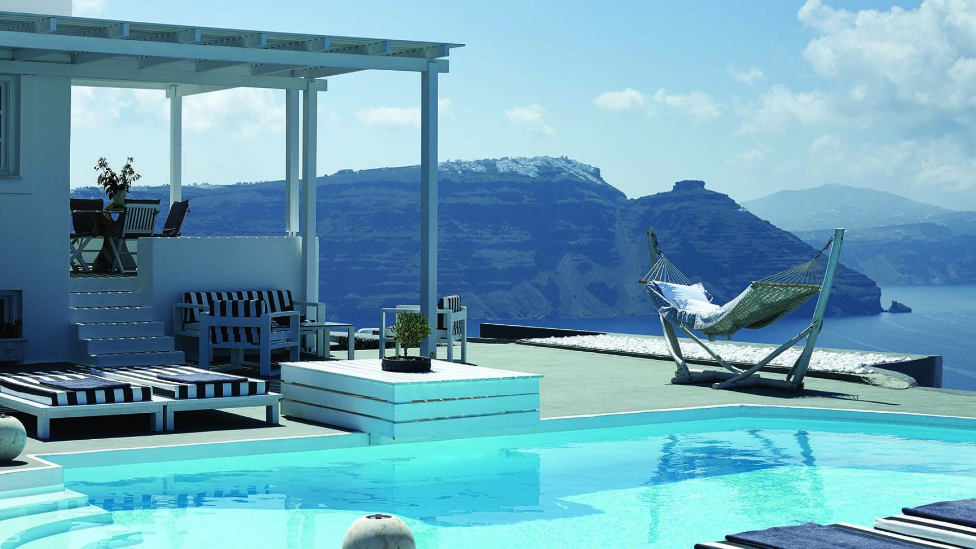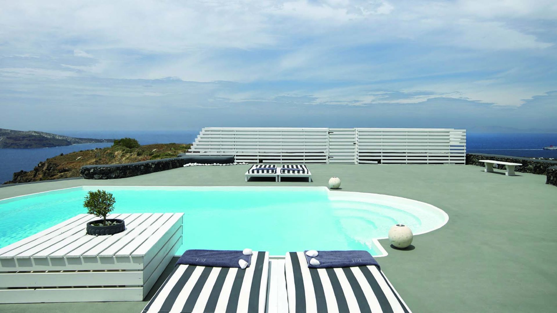 Perfectly adapted to the beauty of Santorini, the indoor decoration of the villa get inspiration from the Cycladic white and minimalism, composing a fairytale atmosphere for its guests. Designer furniture, high-end technologies, unique colorful details and exclusive services, promise to offer guests the essence of luxurious, peaceful holidays in Greece.