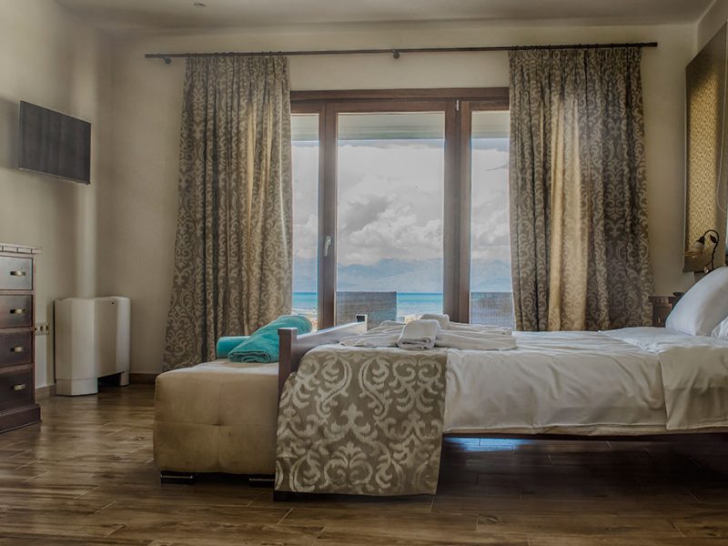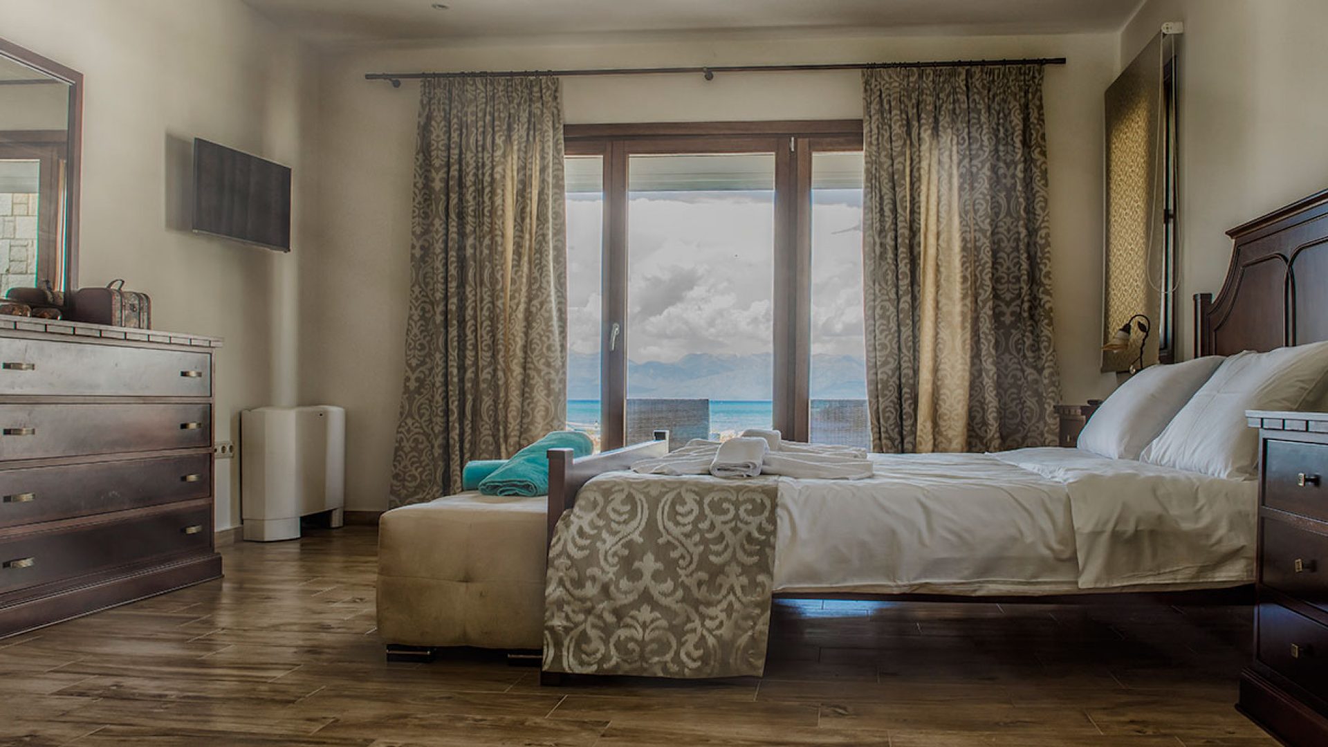 If you thought that this is the luxurious part, wait until you face the indoor spaces. Entering you will find a spacious living room with a 55” flat screen 3D cable TV and a dining room of 8 where you have a direct view to the beautiful garden and the mesmerizing sea of the Ionian.