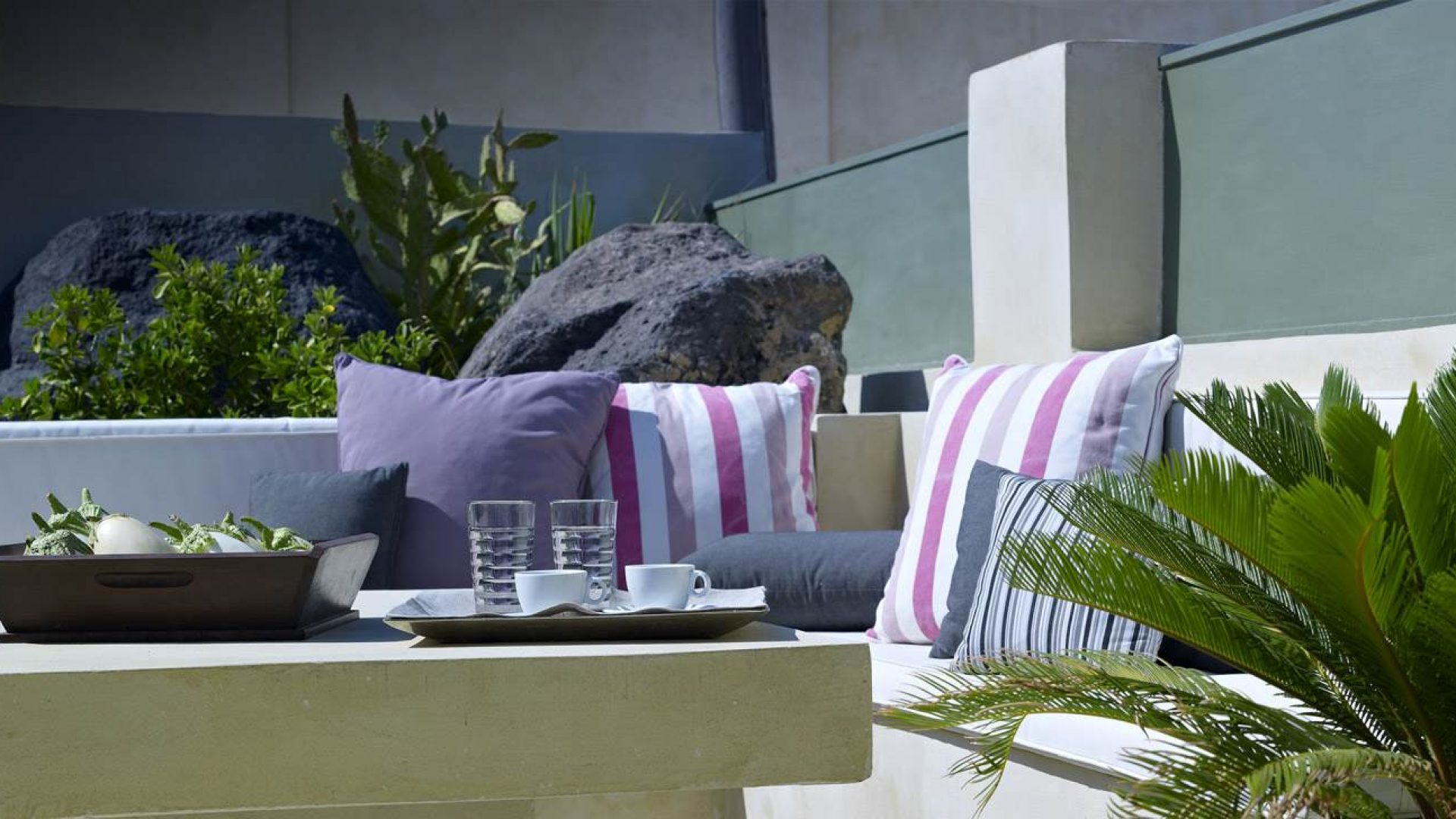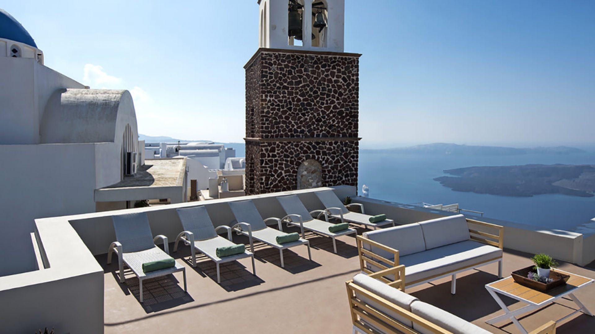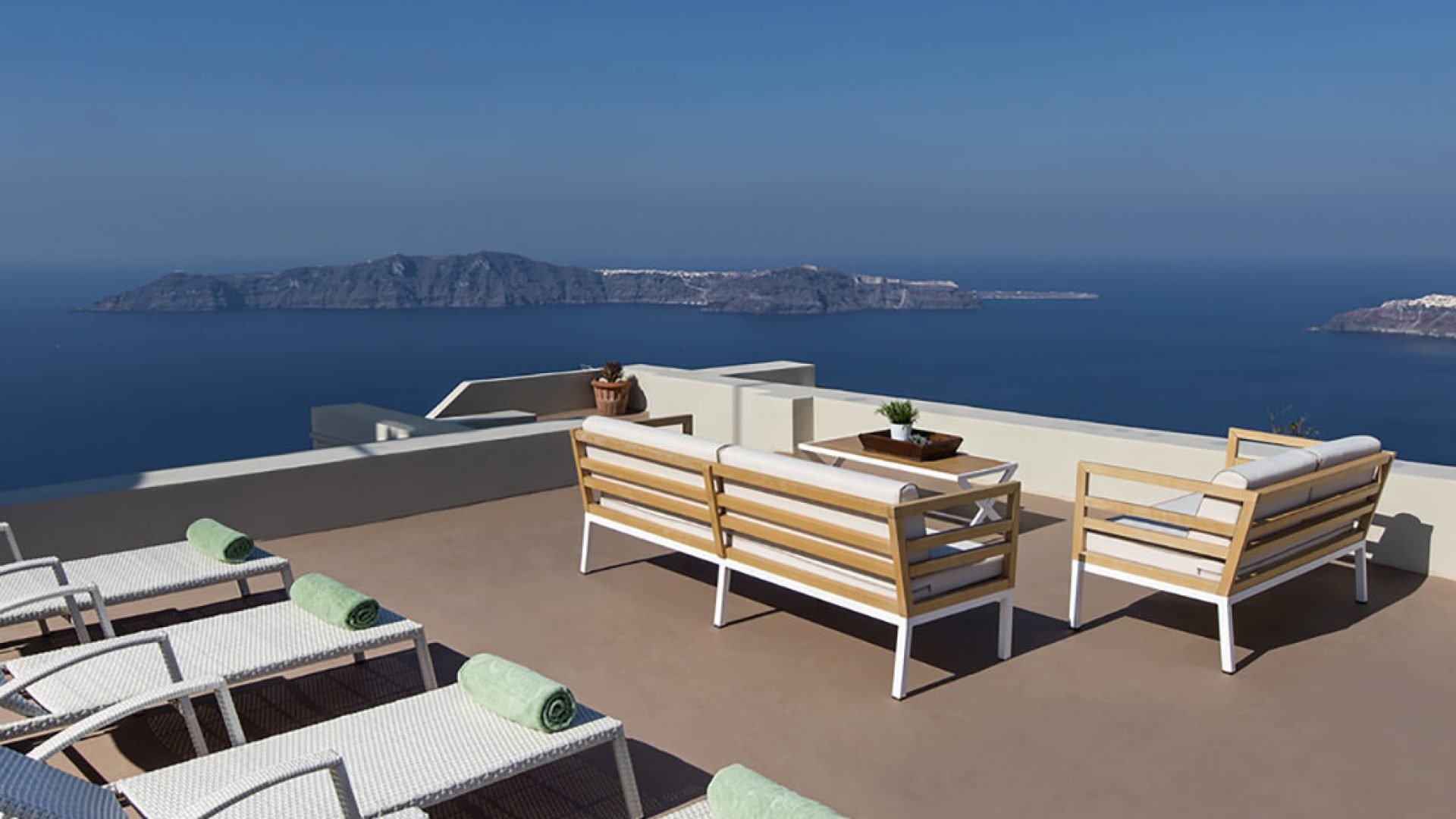 • Roof garden with sitting area and lounge chairs and panoramic view of the Santorini island.