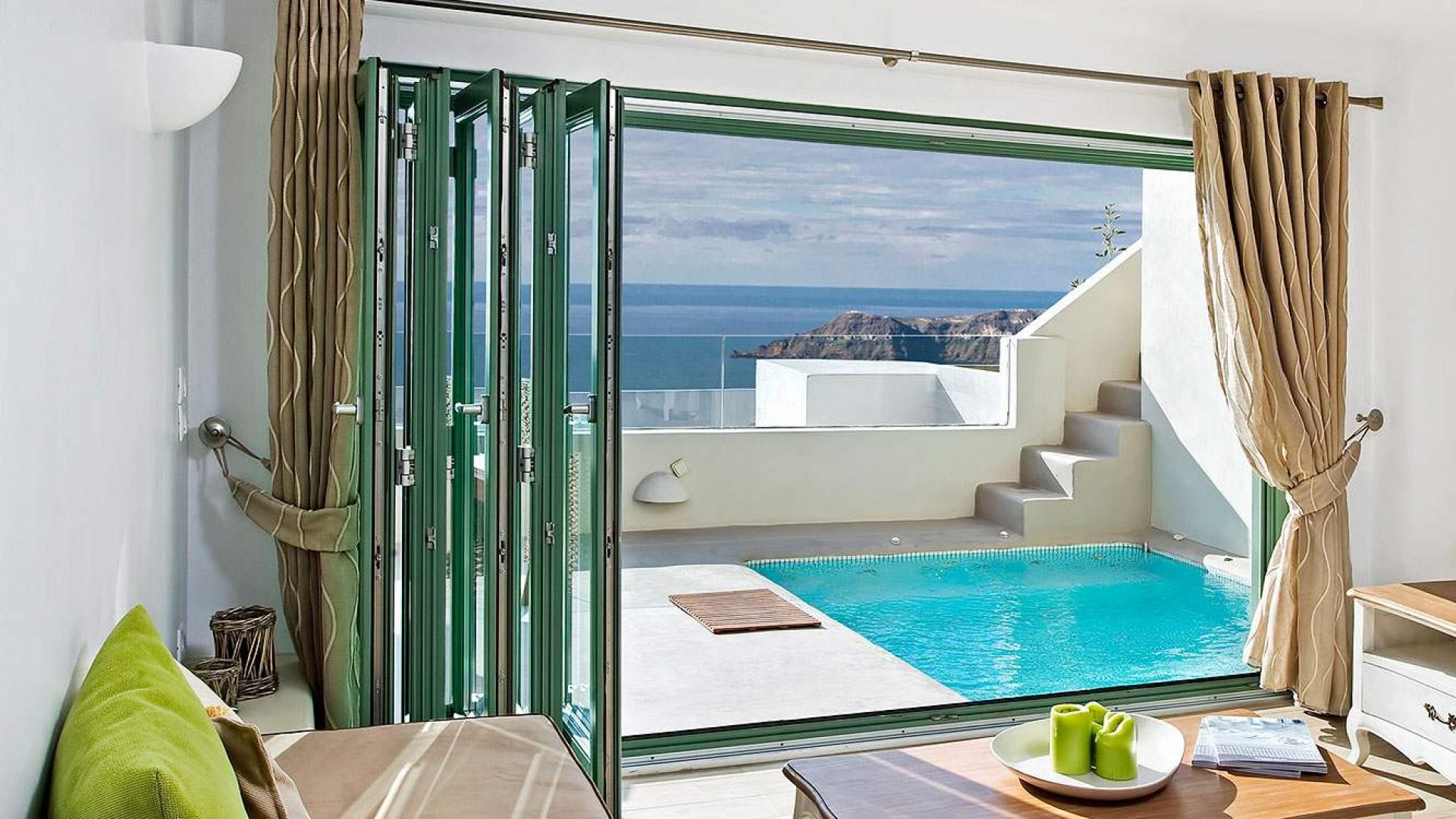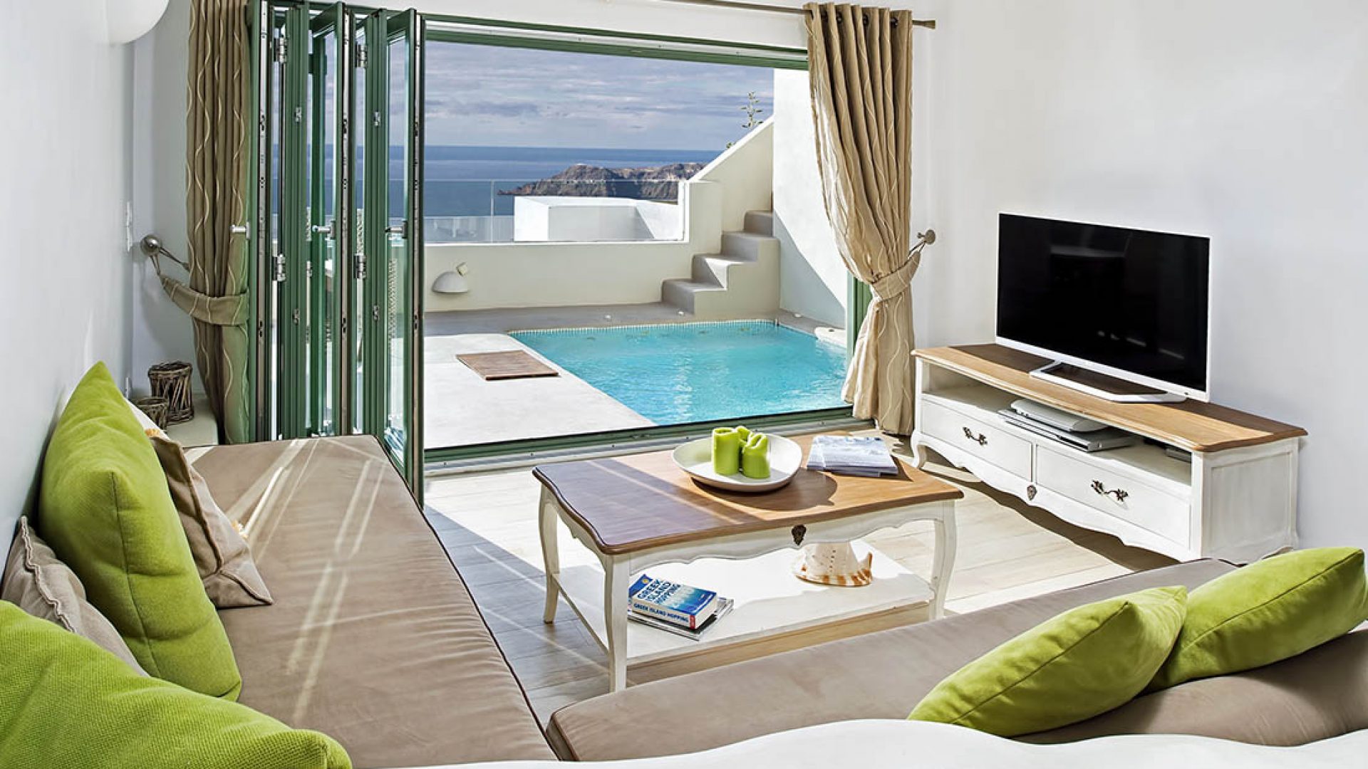The living room area with a view of the Caldera and the pool right outside your door is the perfect place to relax.