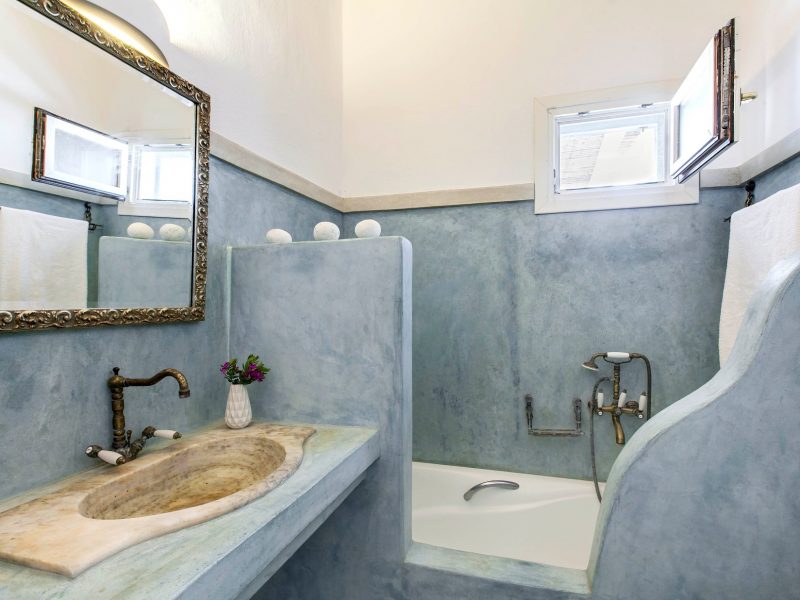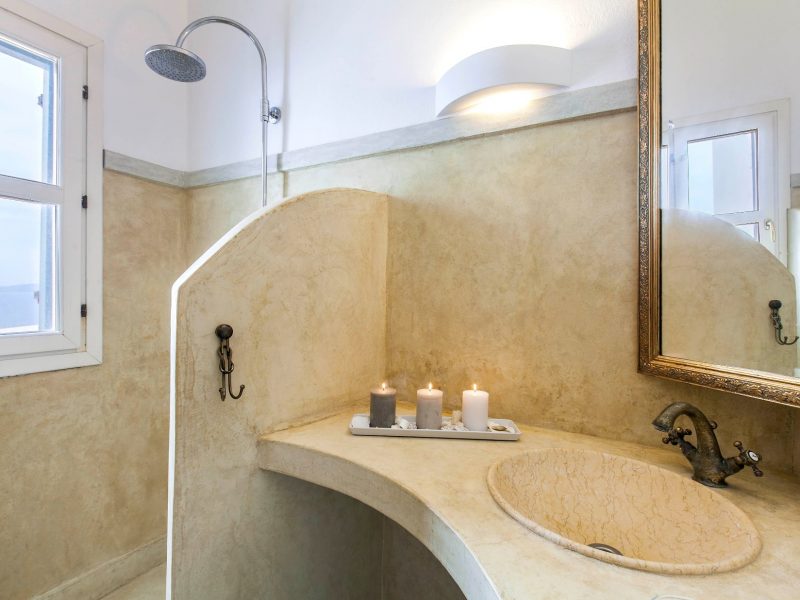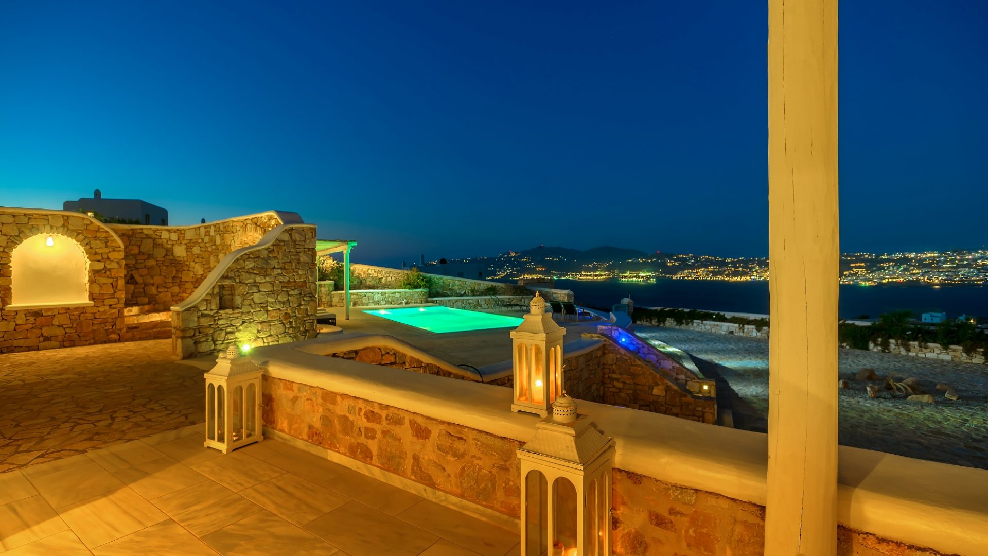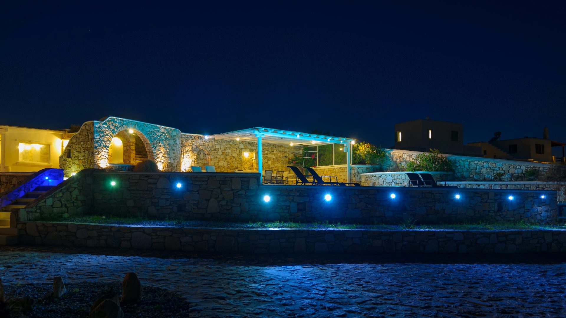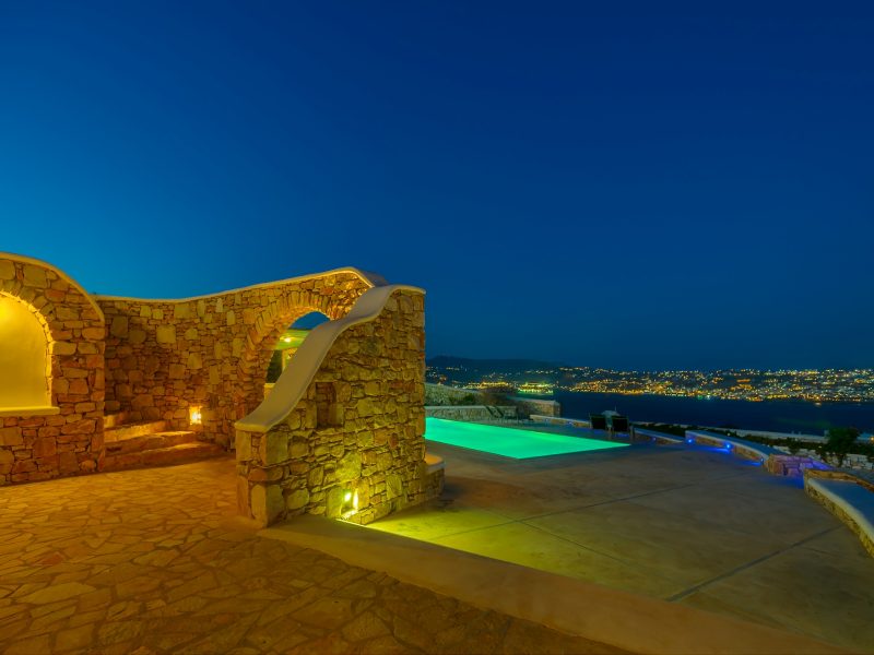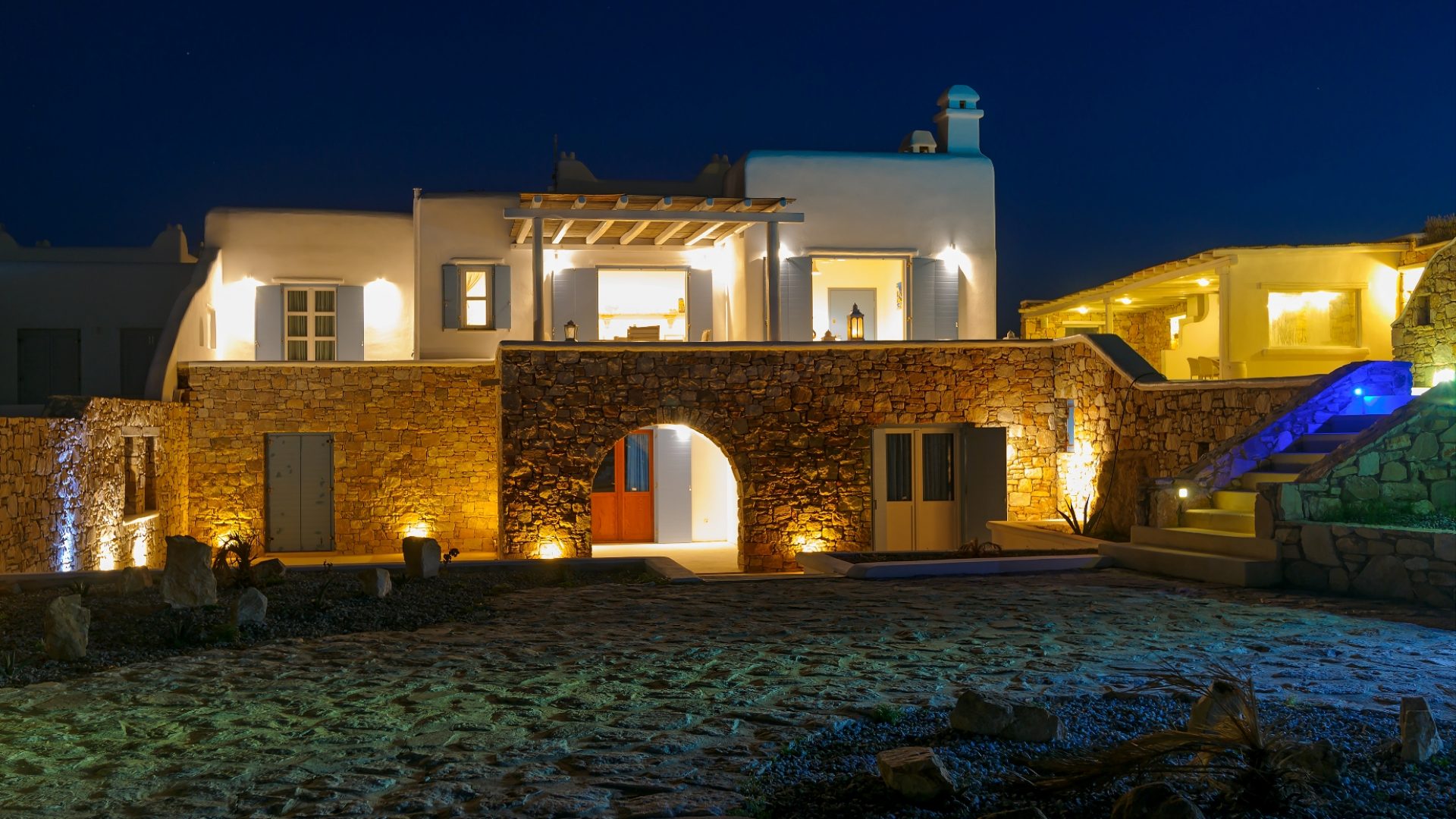 The pièce de resistance is the vast exterior with its 50m2/ 54 sq2 swimming pool and delightful shaded dining and lounge area, all inclusive of a breathtaking view of the Aegean Sea. The all-stone exterior façade is delicately light at night, providing an added touch of ambiance.