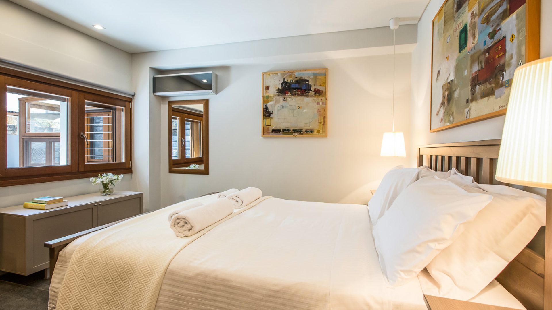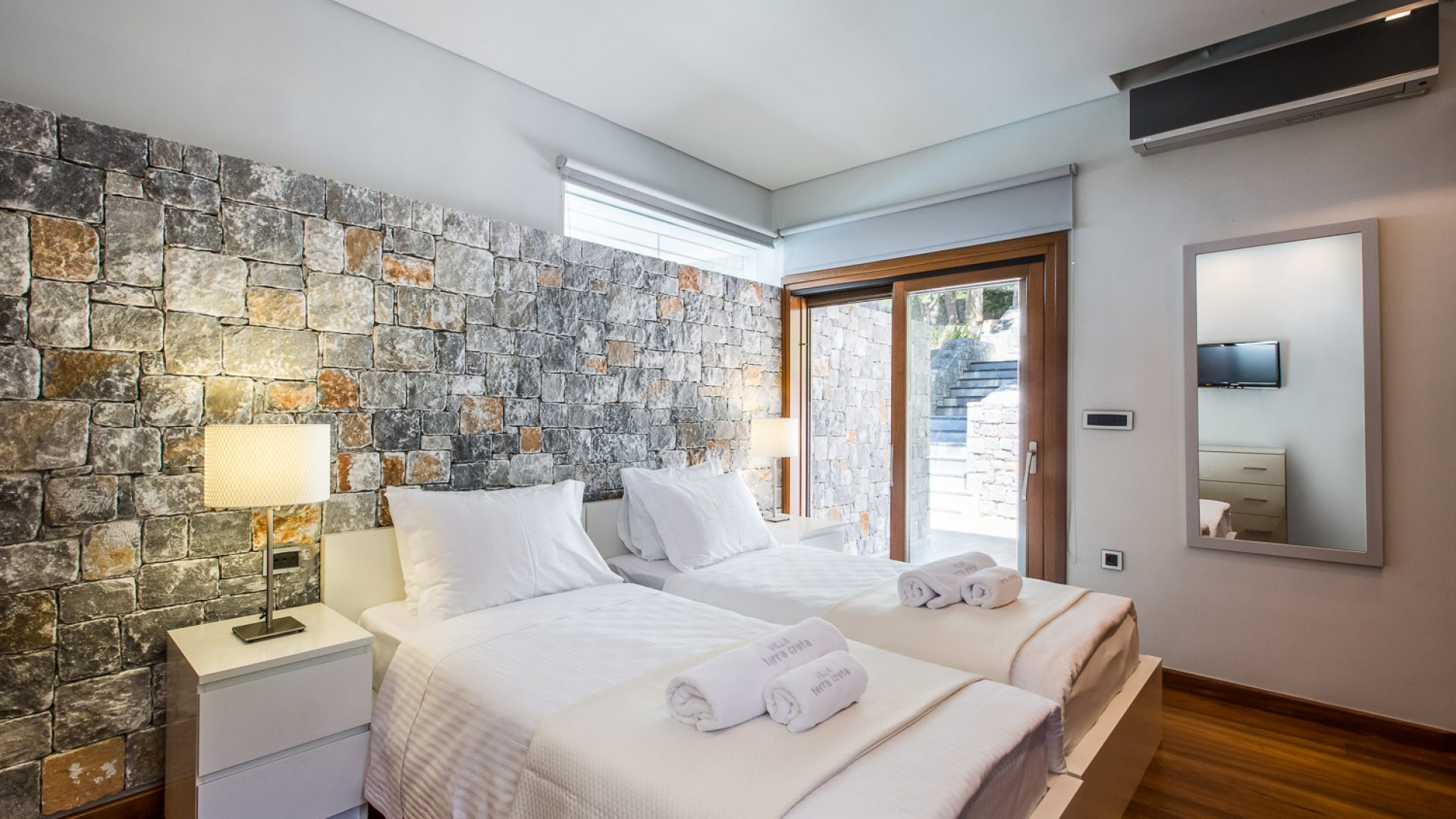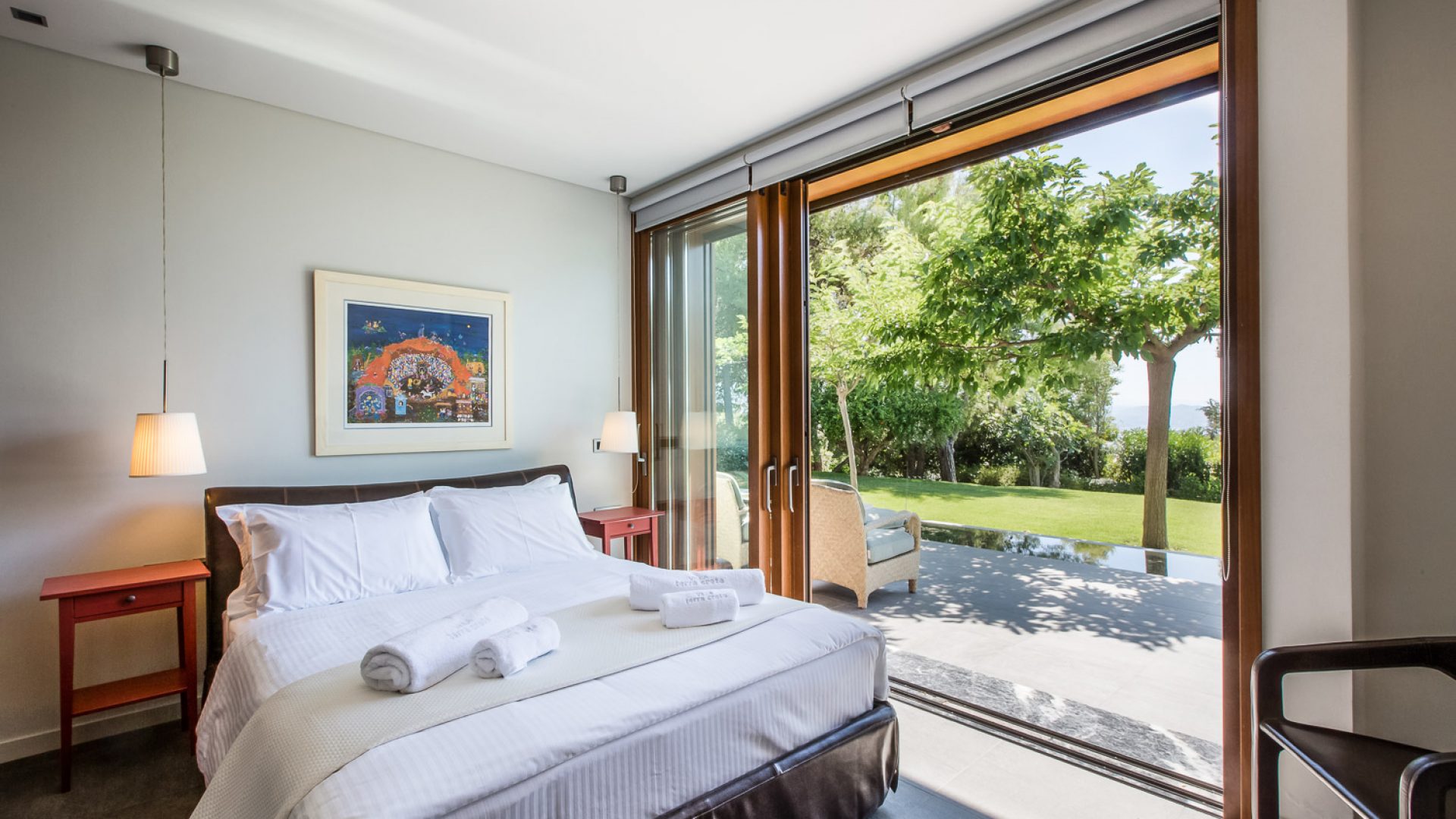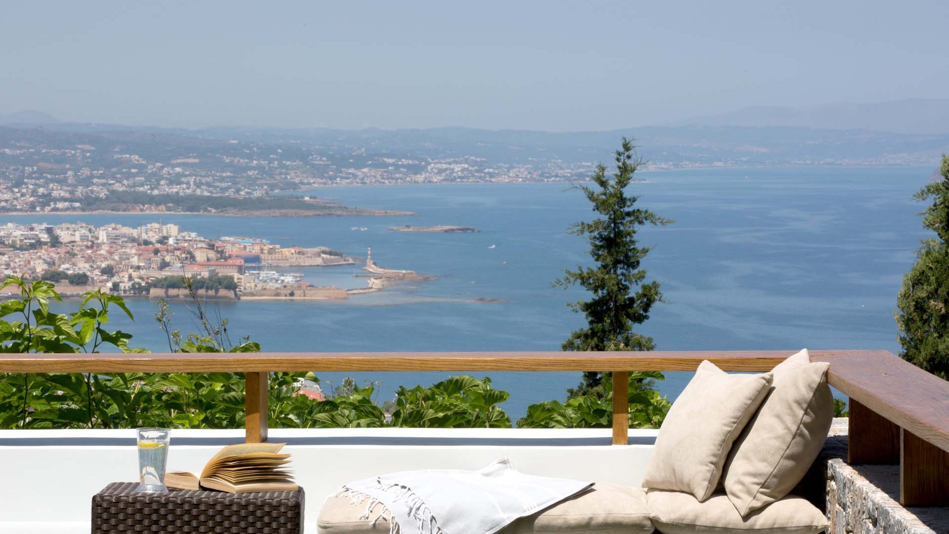 Presidential Suite takes up the majority of the upper floor and enjoys bird’s eye views of the Aegean Sea, the old harbor, Chania town and the «White mountains» through its ceiling-high glass windows.