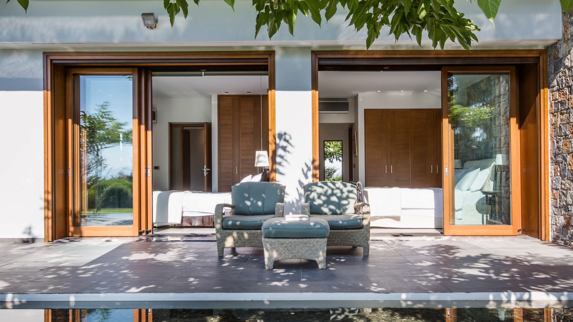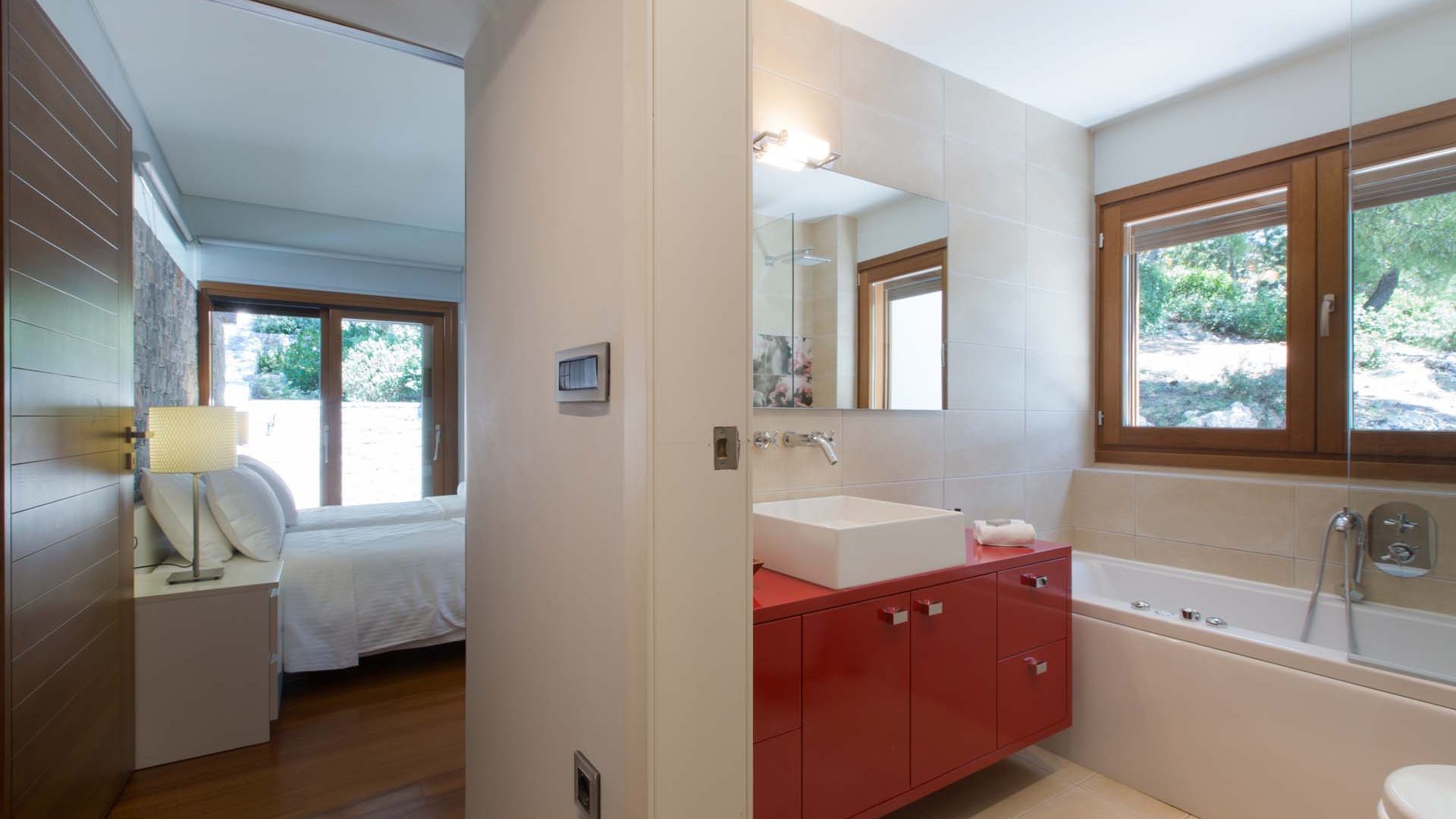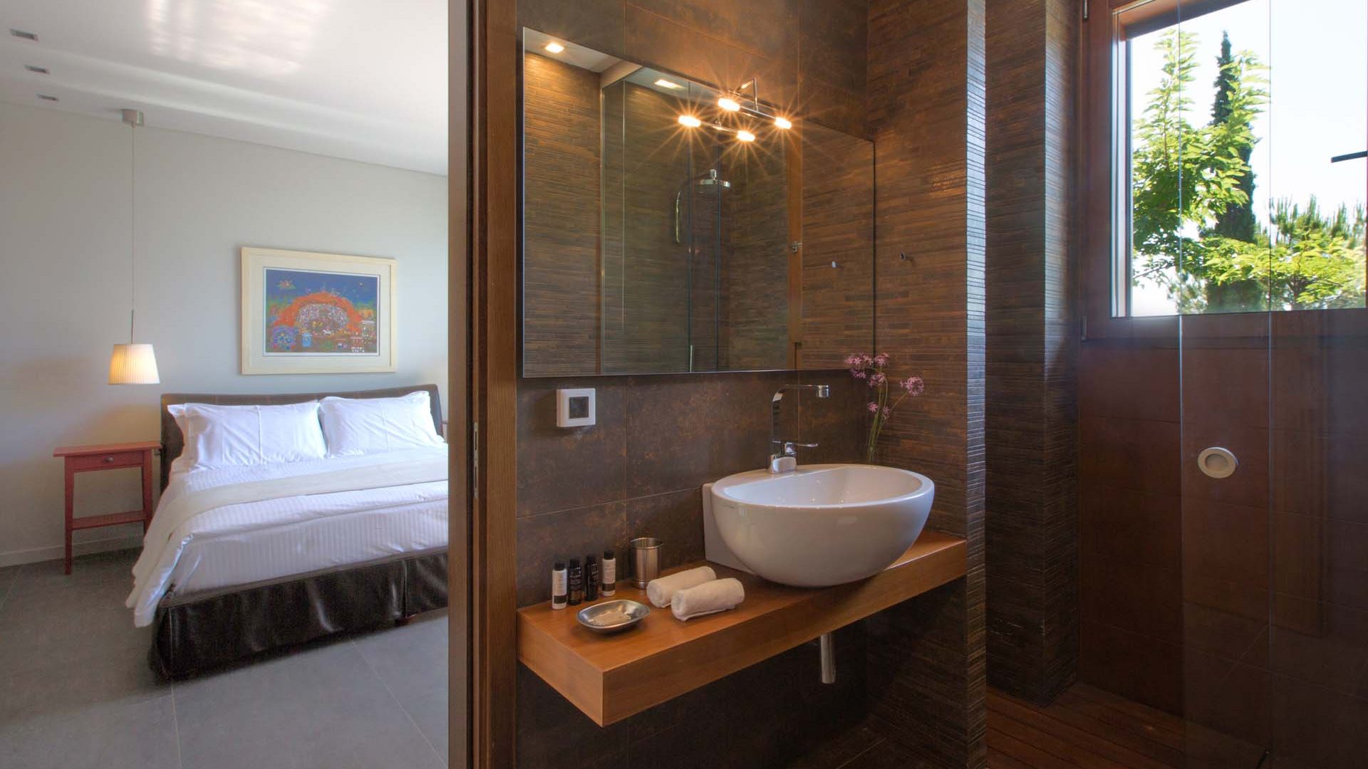 The Suite is a separate studio with 2 connecting rooms, featuring a bedroom with queen bed, an en-suite bathroom and a living room with elegant desk, providing direct access to the swimming pool area. It can accommodate two more people, with the use of a double sofa-bed.