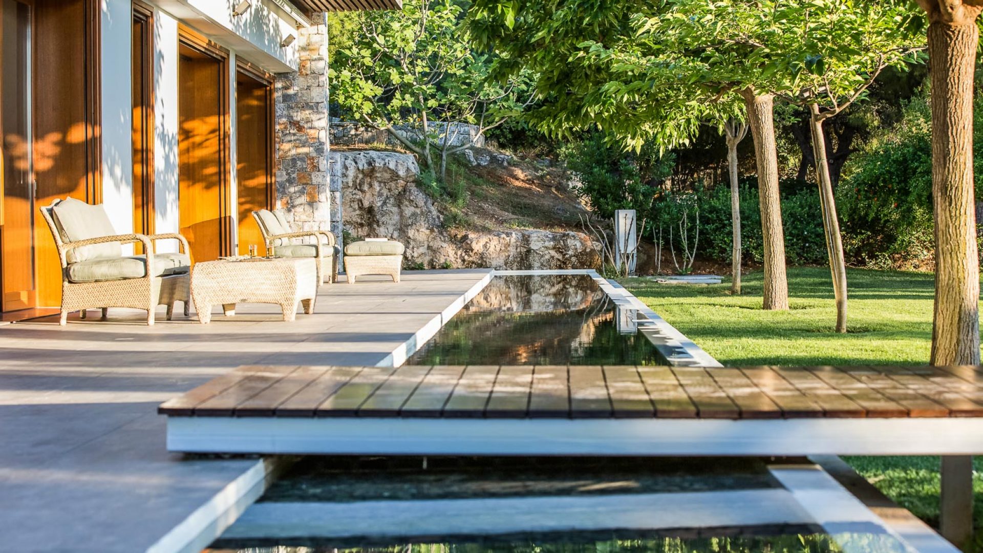 Natural elements such as wood, natural stone and water, enhance perfect harmony with surroundings: the pine forest’s green and the Aegean Sea blue! Unique features include an authentic ancient construction from Ottoman empire and a natural cave that add to its distinct charm.
