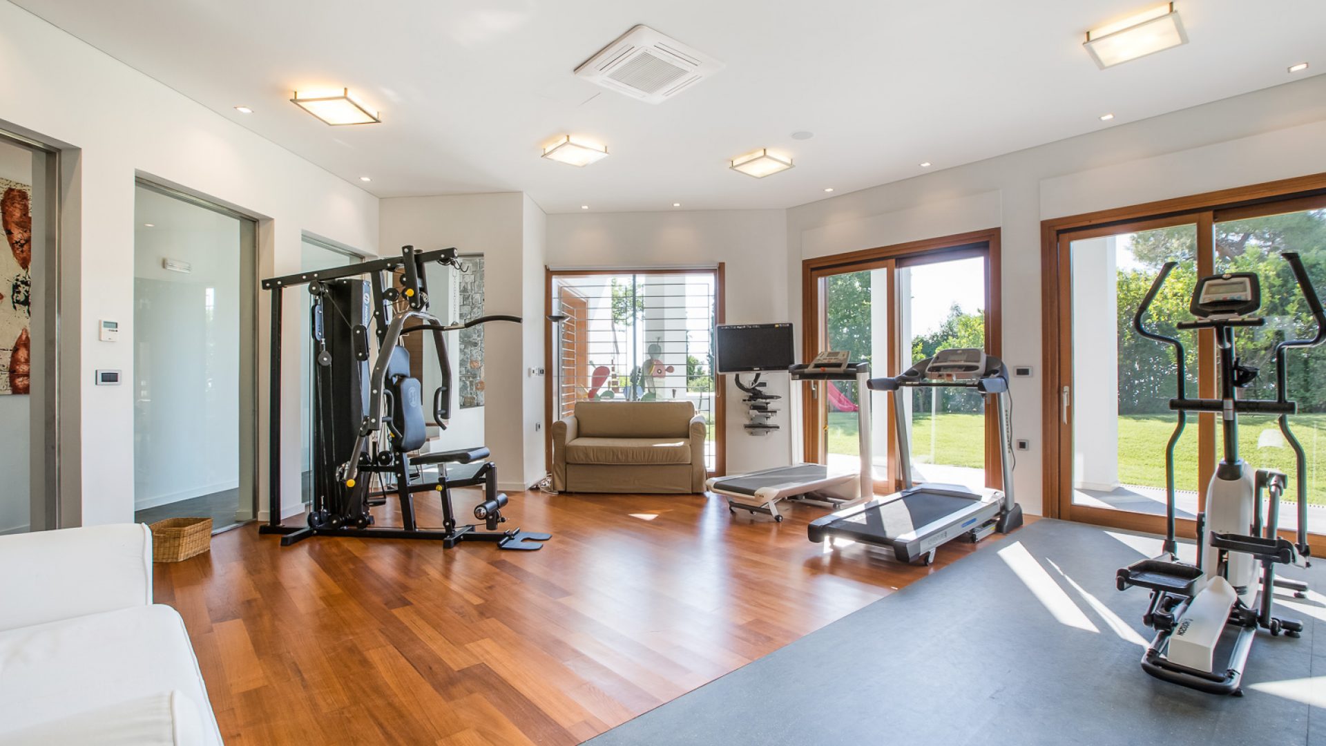 At a separate part of the Lower Ground Floor, our Guests can enjoy the fully equipped gym with all modern amenities and garden views. A large room with natural light and garden views where 5 or more people can work-out together.