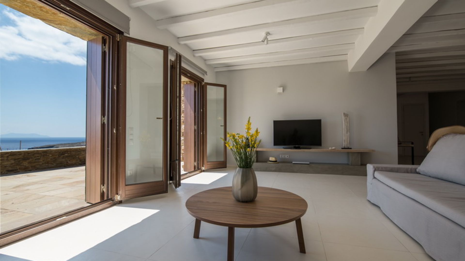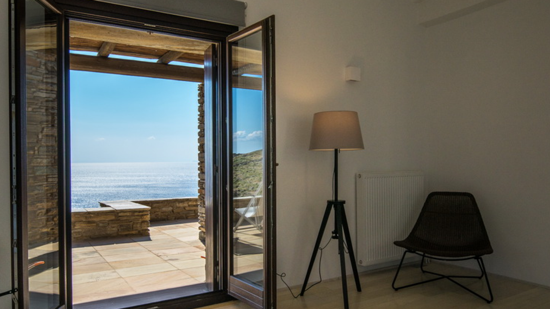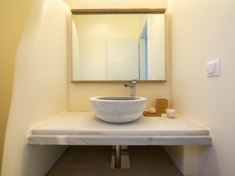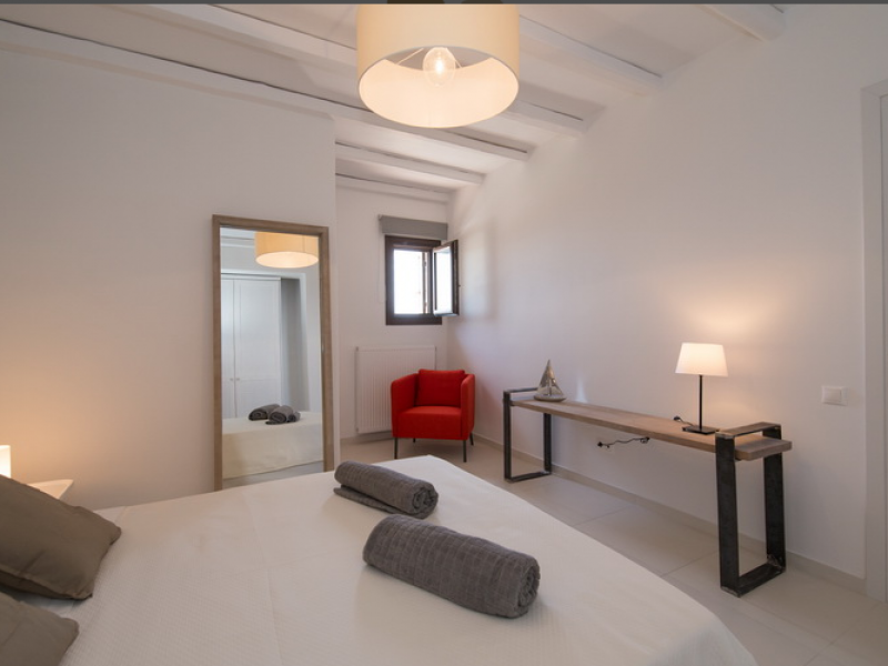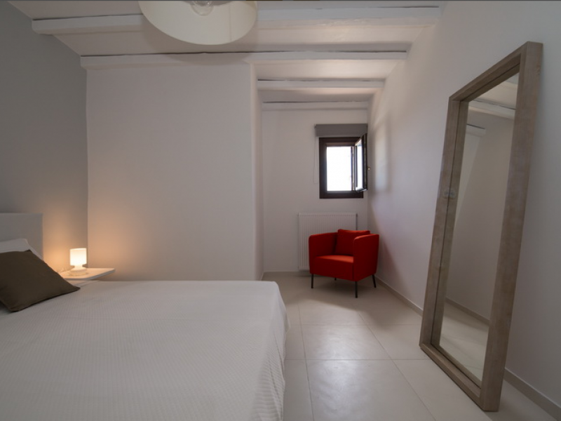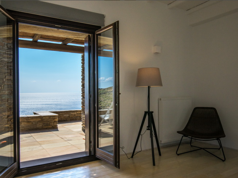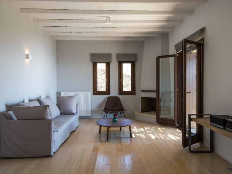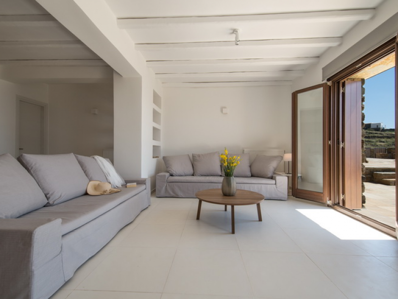 On the First Floor of the Villa we find another living room with a comfortable sofa, elegant arm chairs and view to the sea. The floor also features two bedrooms and one bathroom. The First Floor of the Villa has a circumferential veranda with lovely views to the Aegean Sea, sun loungers and armchairs!