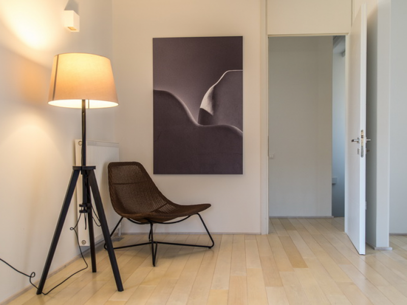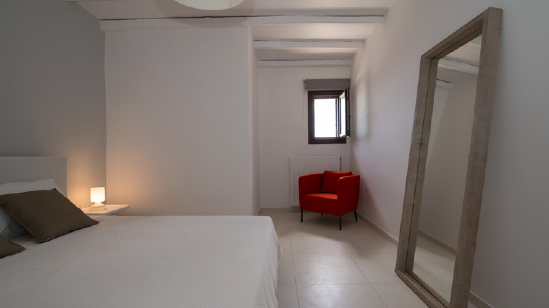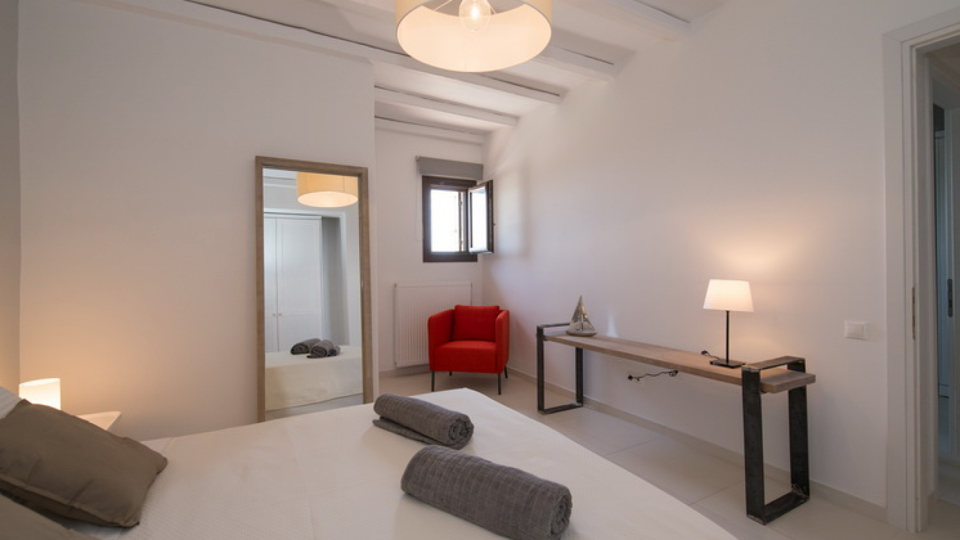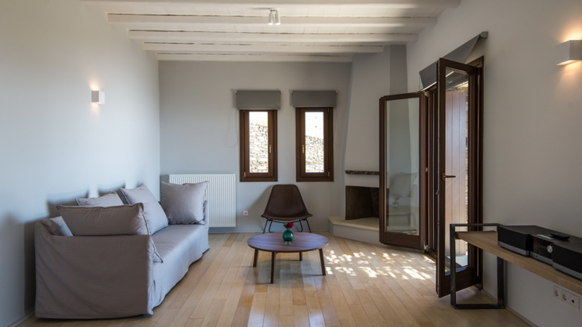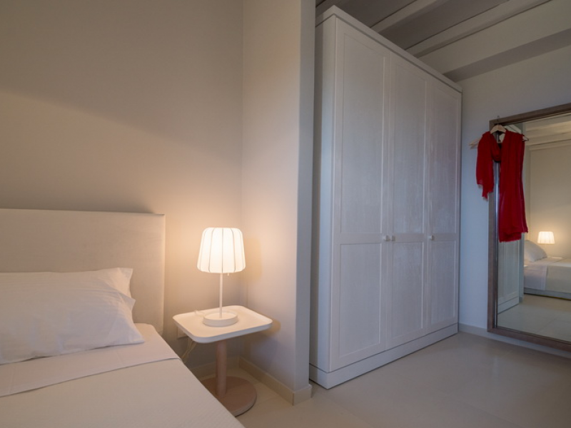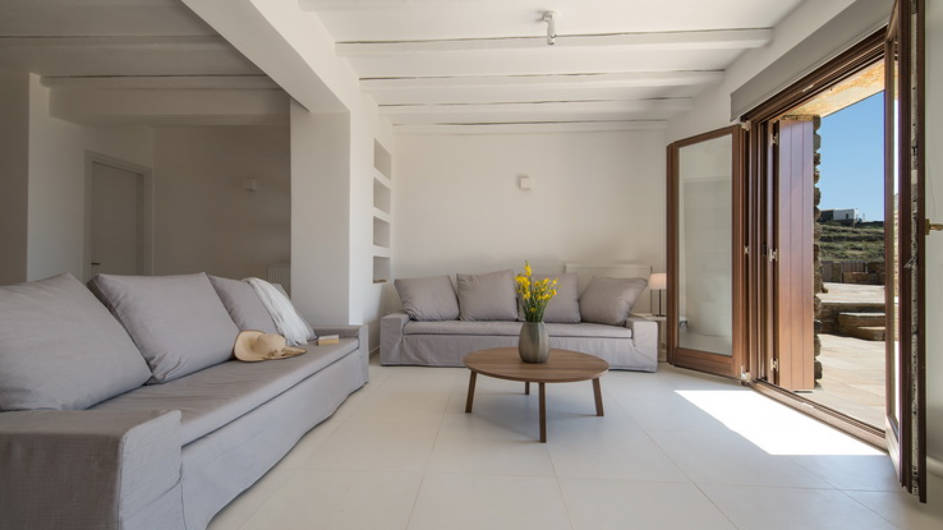 On the First Floor of the Villa we find another living room with a comfortable sofa, elegant arm chairs and view to the sea. The floor also features two bedrooms and one bathroom. The First Floor of the Villa has a circumferential veranda with lovely views to the Aegean Sea, sun loungers and armchairs!