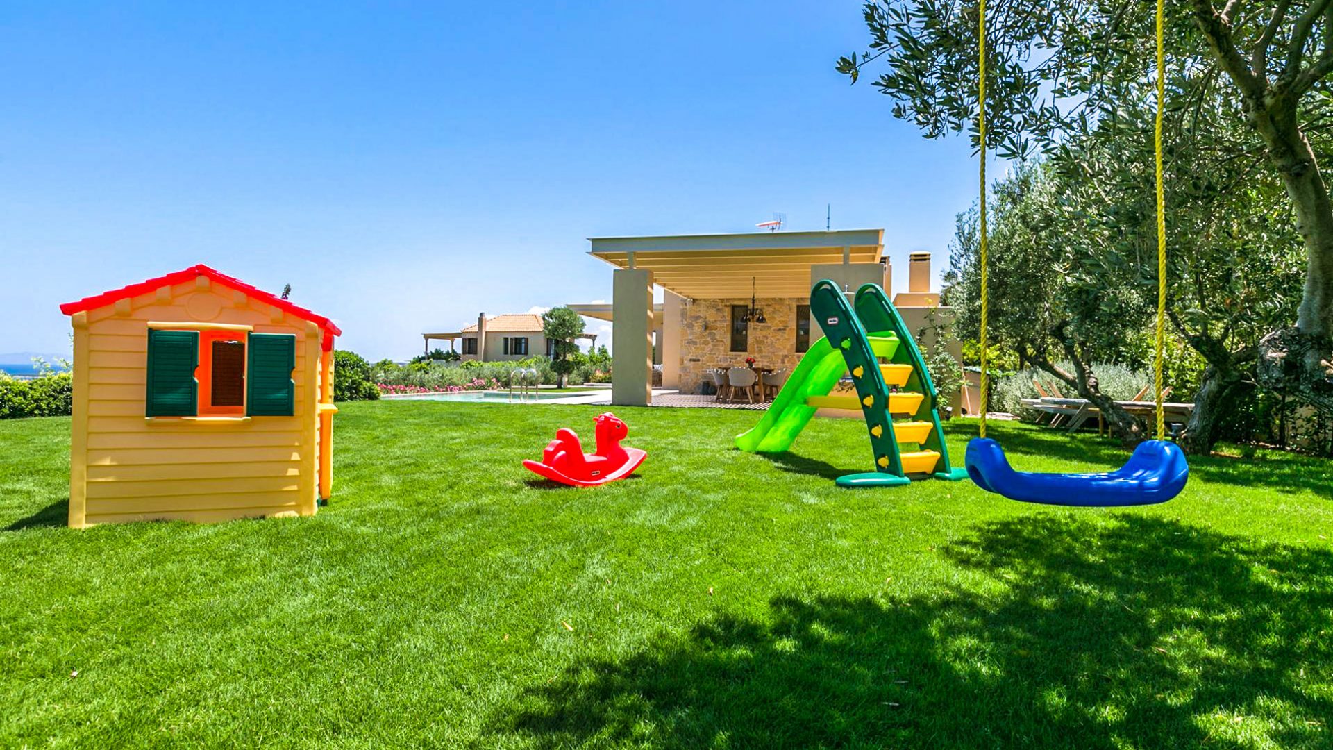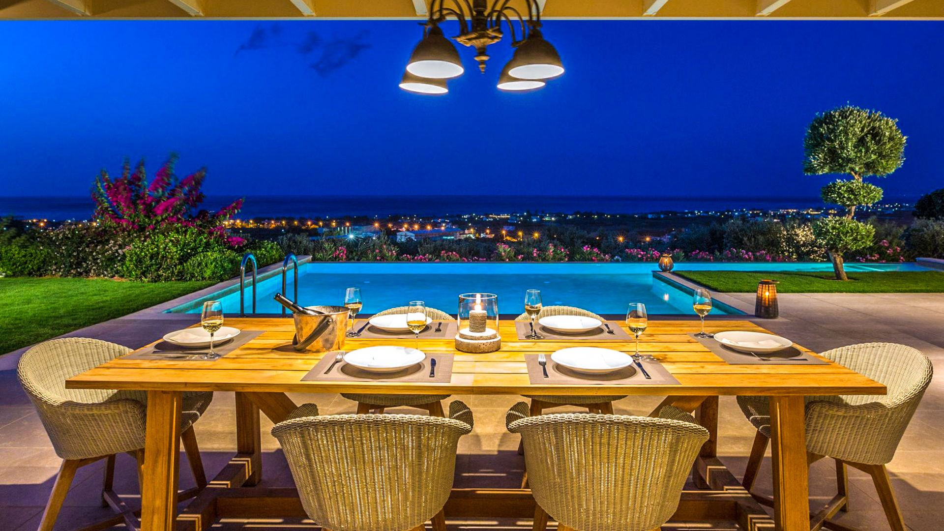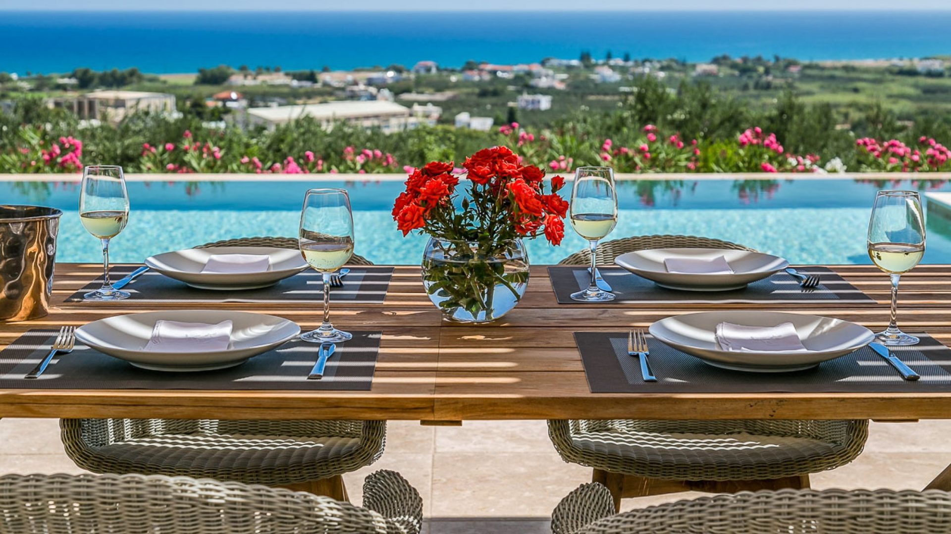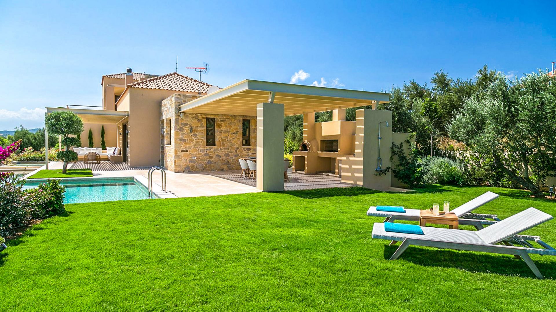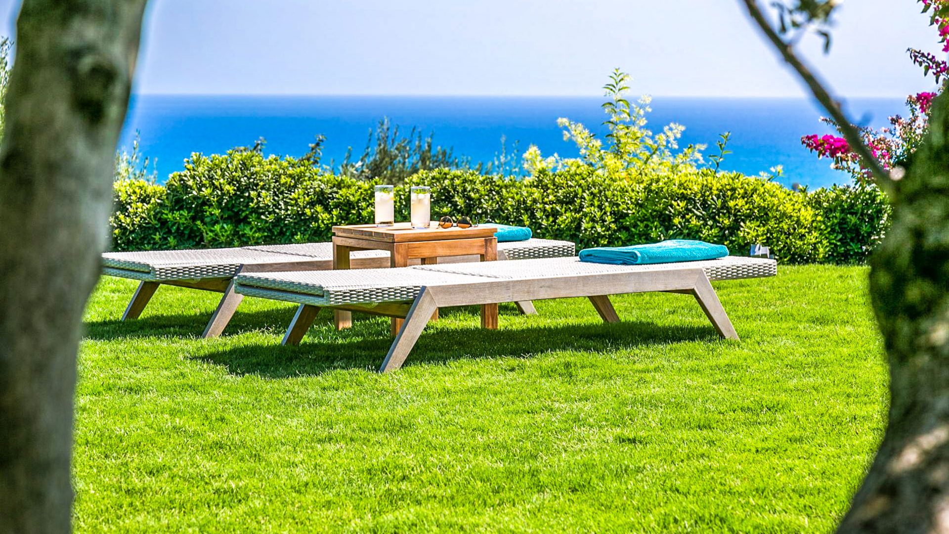 Two patios extend in front of the living room, with built-in corner sofas, soft fluffy pillows and wooden furniture fashioned of teak and rattan. Further on, the dining area is set against the green backdrop of the well-tended lawn which stretches out before you like an endless emerald carpet. An outdoor “kitchen” complete with wood-burning oven, BBQ, built-in countertops and an impressive wide wooden-planked monastery-style table for unforgettable Greek feasts and revelry.