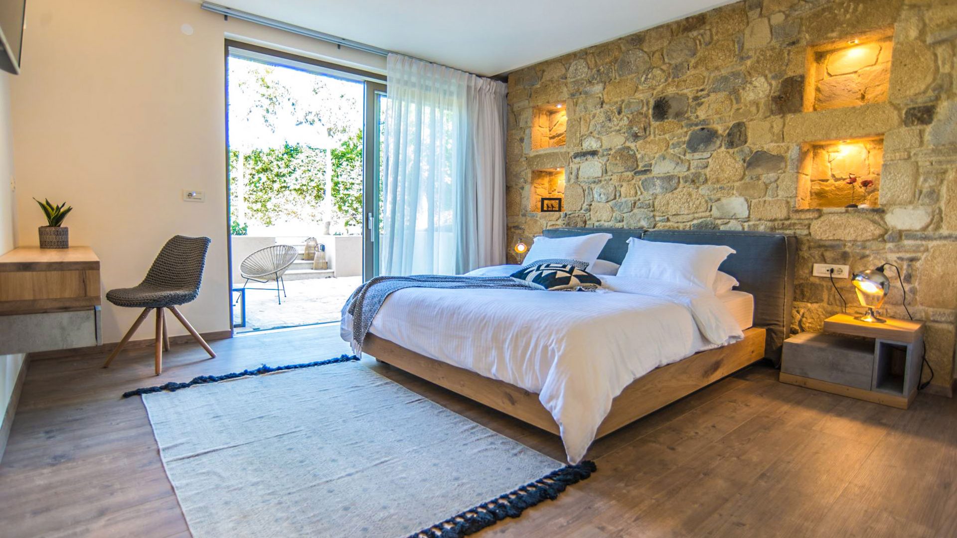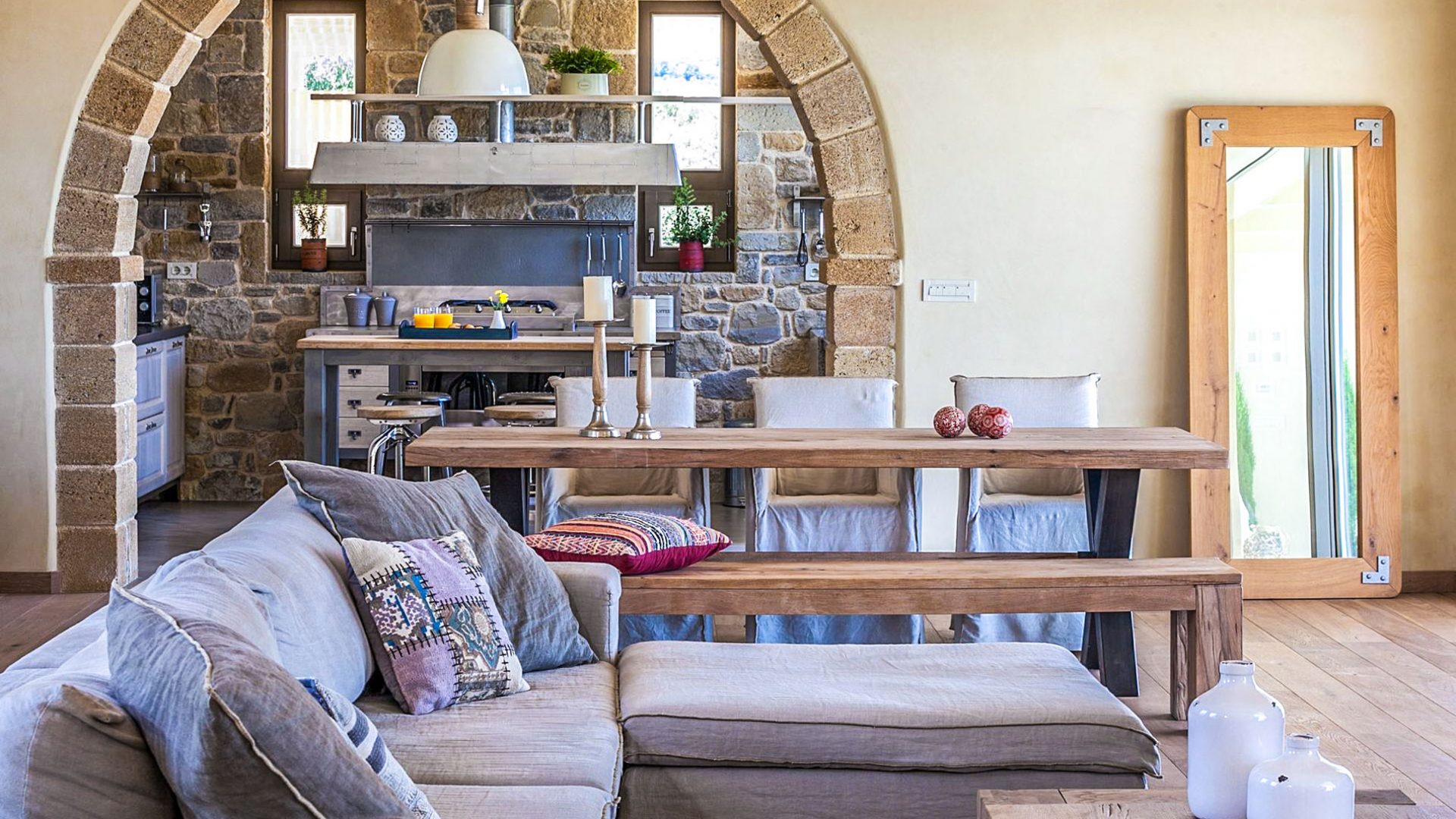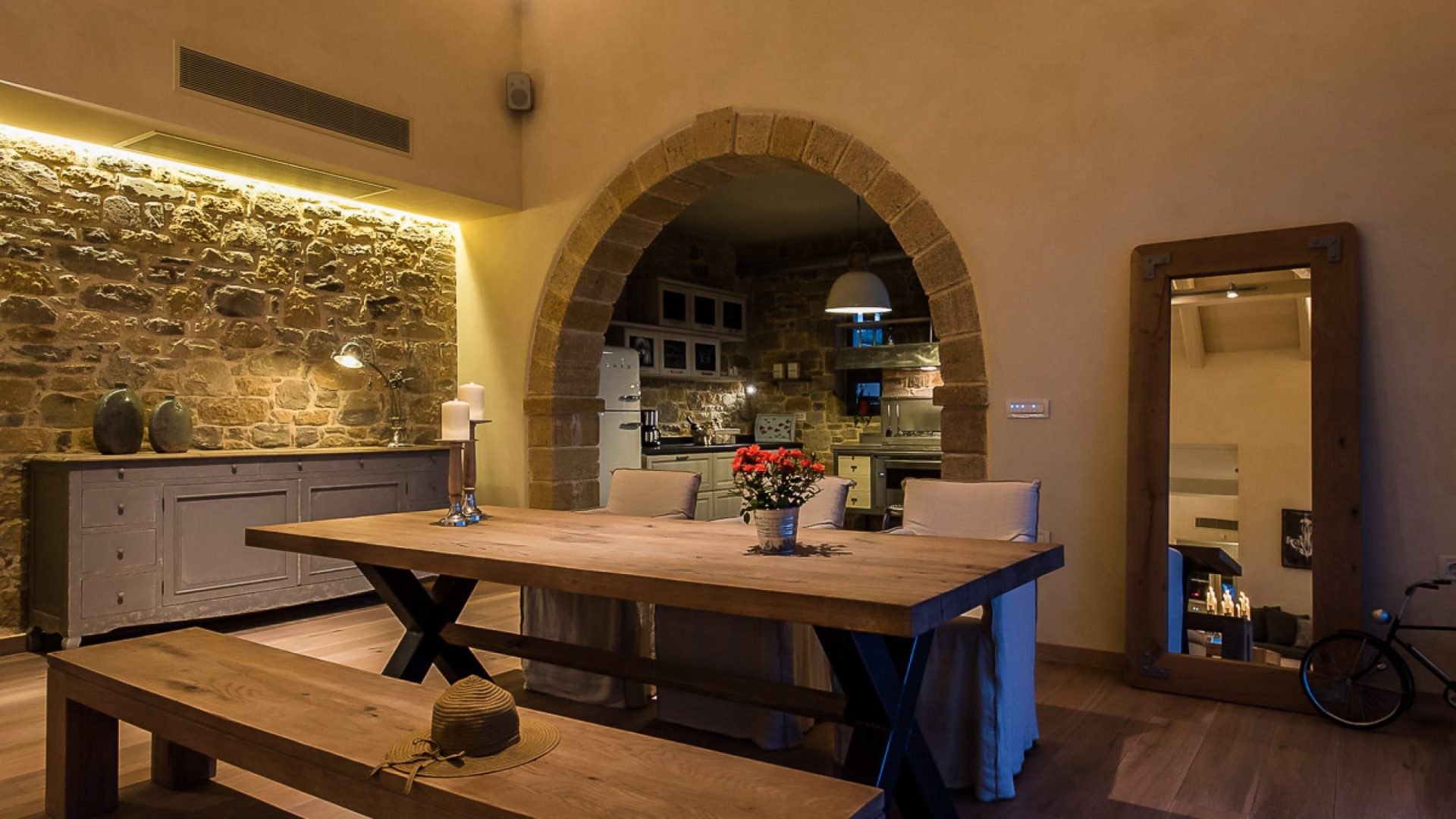 Local stone in the soothing ochre and grey tones characteristic of the surrounding Cretan land where it was sourced “softens” contrasts. Wood abounds, from the wide-planked oak wood floors to the dining room table and side tables, some sanded and refined, others left in their natural state for a deliberately “unfinished” look, sturdy yet light in both quality and aesthetic.