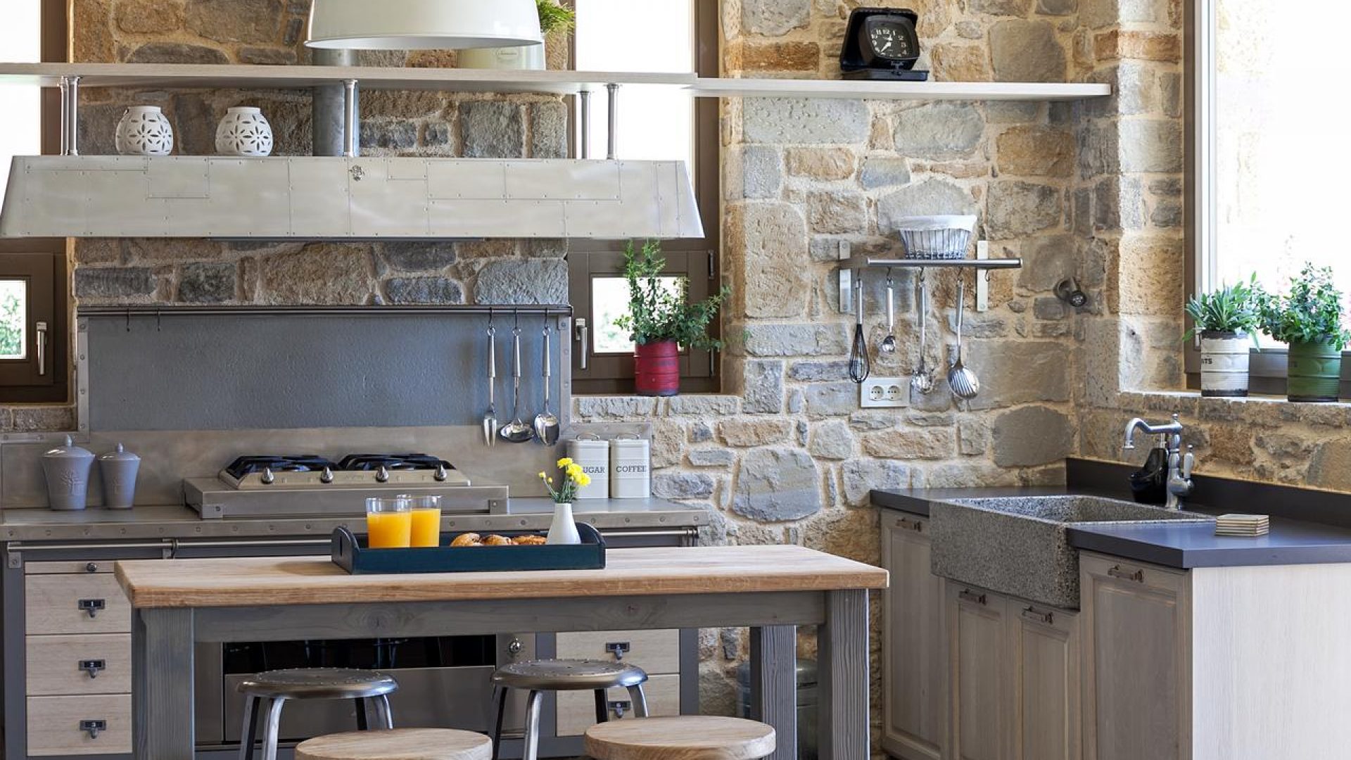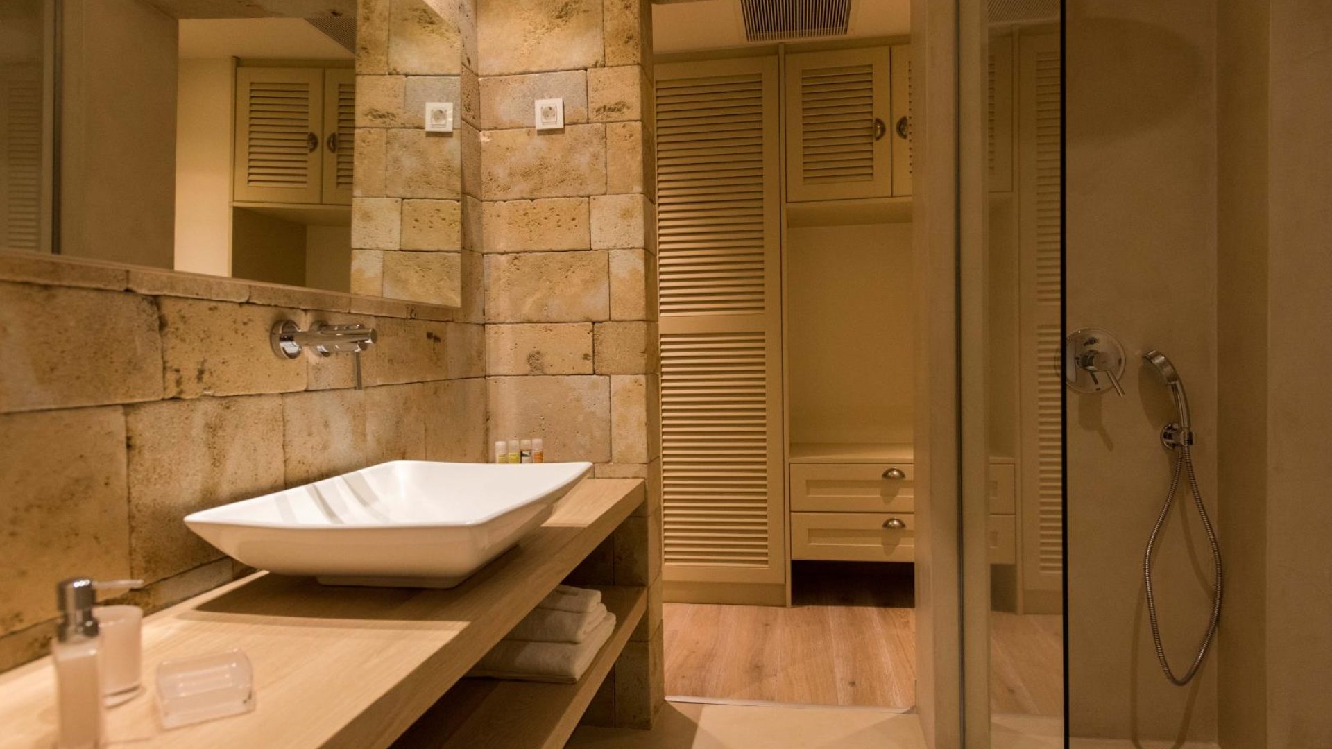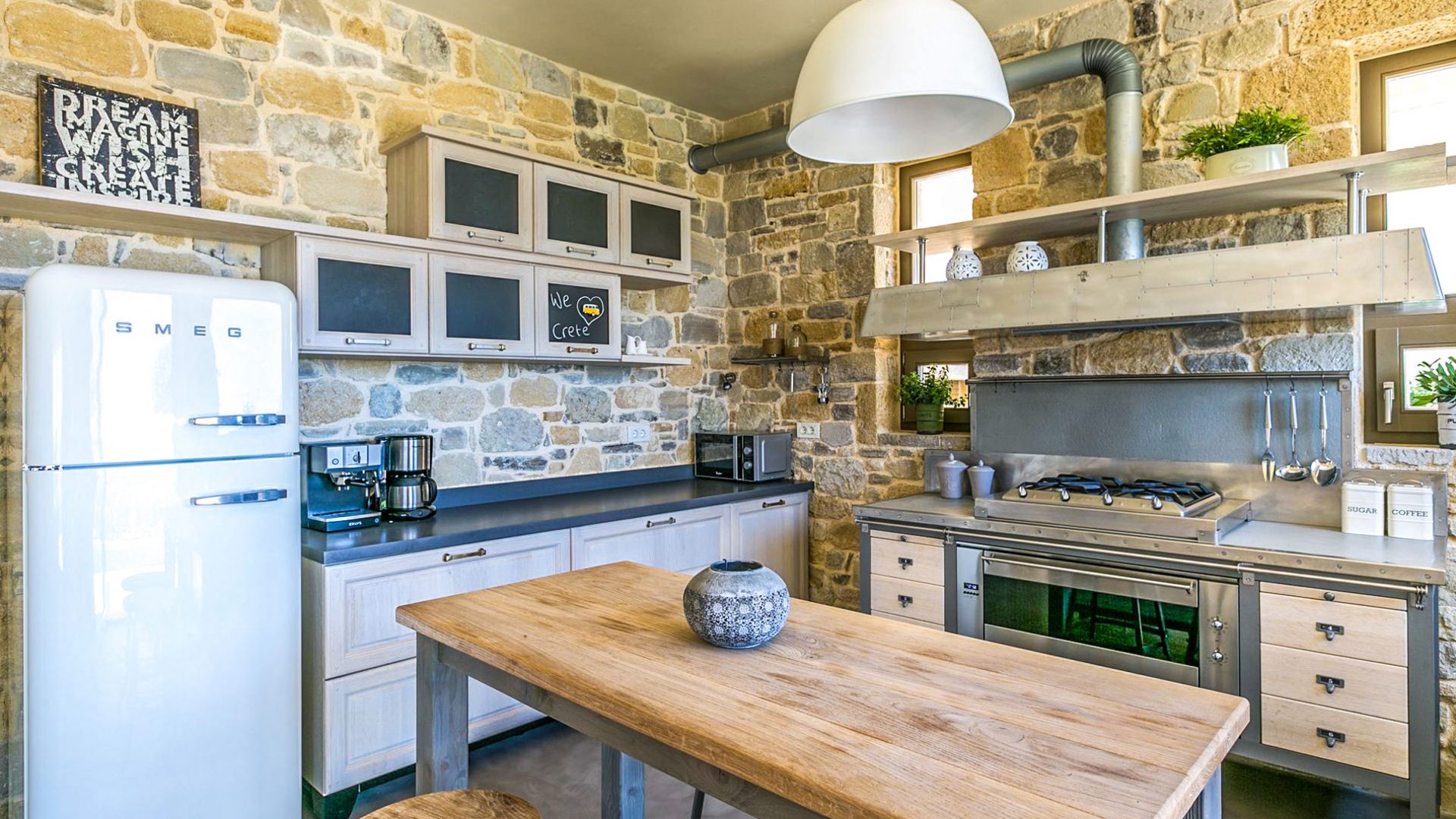Local stone in the soothing ochre and grey tones characteristic of the surrounding Cretan land where it was sourced “softens” contrasts. Wood abounds, from the wide-planked oak wood floors to the dining room table and side tables, some sanded and refined, others left in their natural state for a deliberately “unfinished” look, sturdy yet light in both quality and aesthetic.