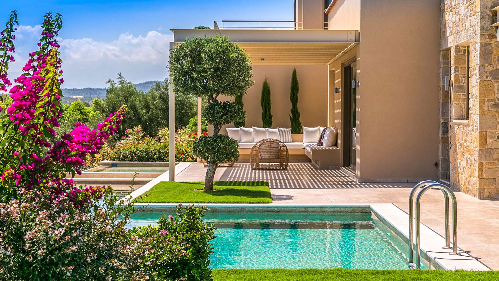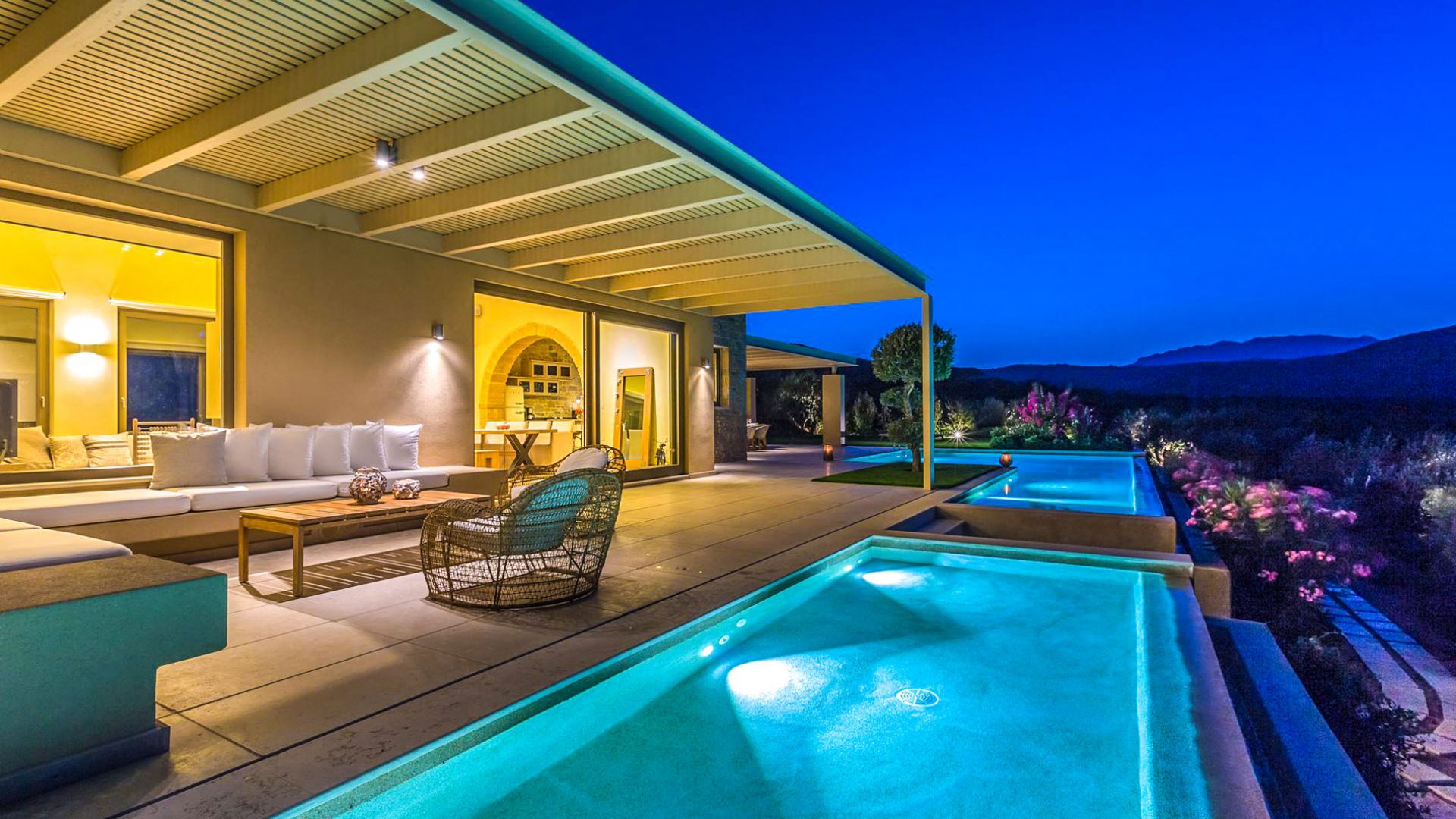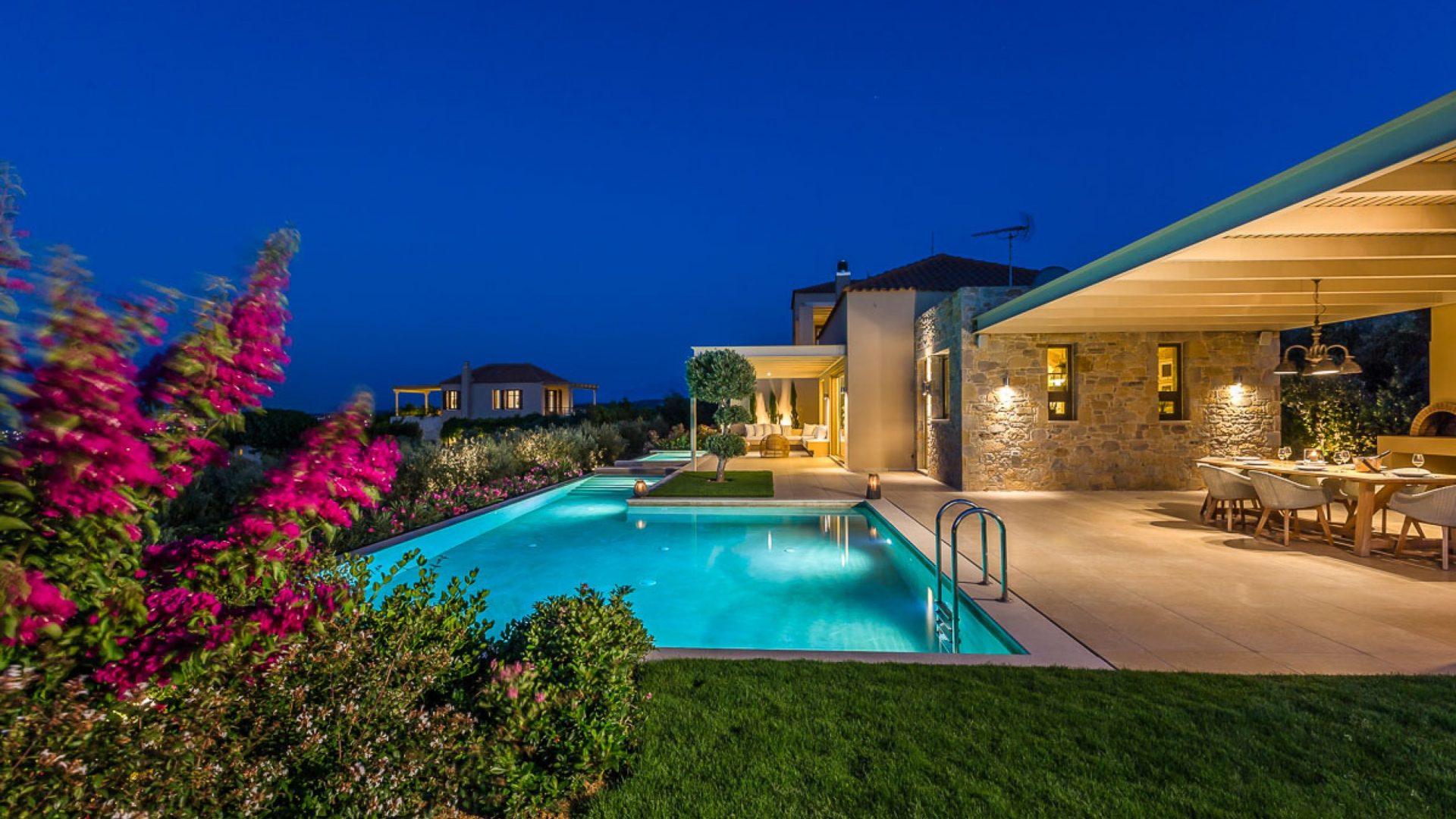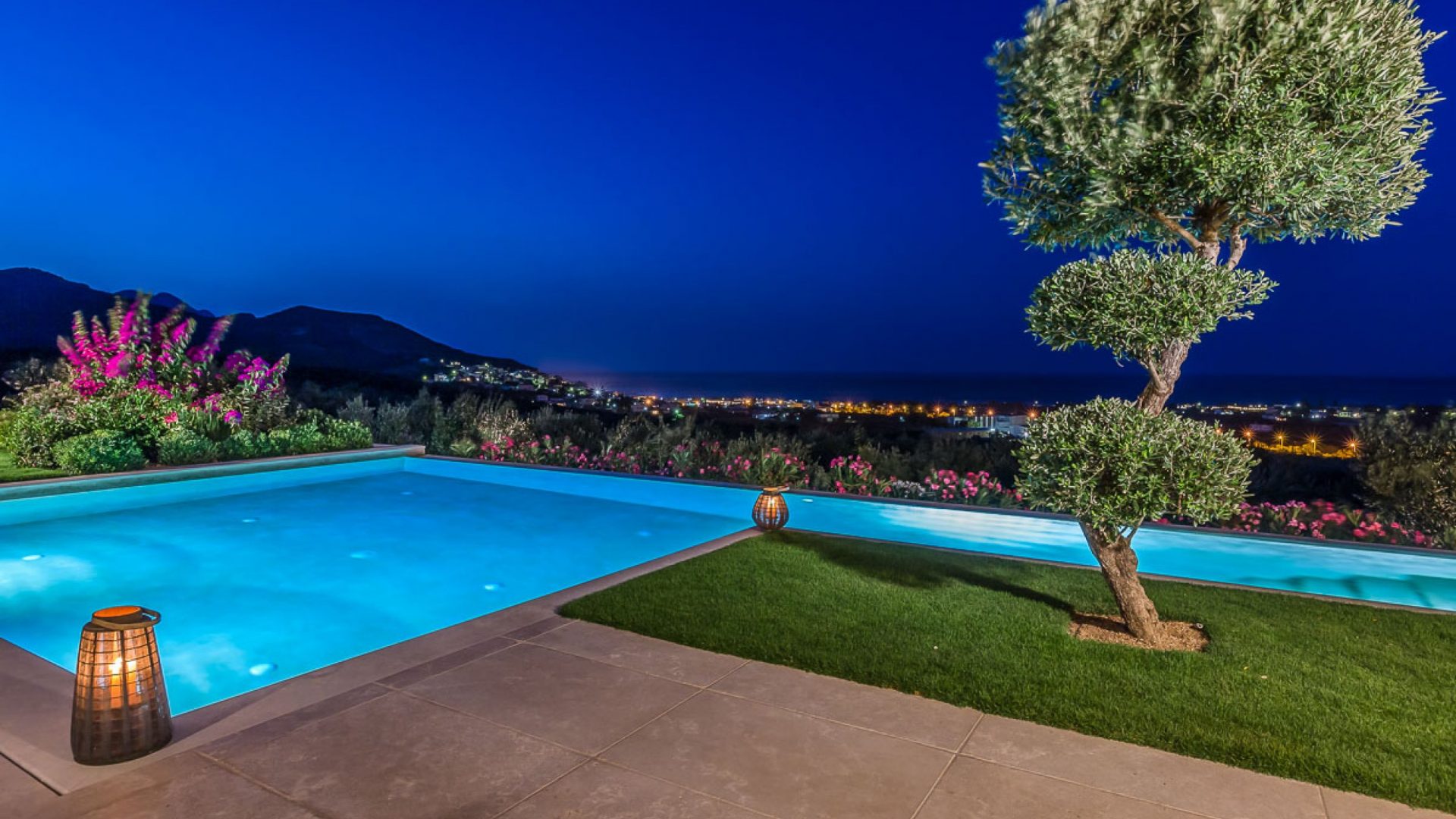 Well-situated within its 3-hectare property, this Cretan holiday villa is impressive in its contemporary architectural lines that blend so seamlessly with its surroundings as to almost become one with the land. The swimming pool’s pebble-tiled depths boast a lovely sandy shade that captures the sunlight and creates playful iridescent reflections through the crystal-clear water.