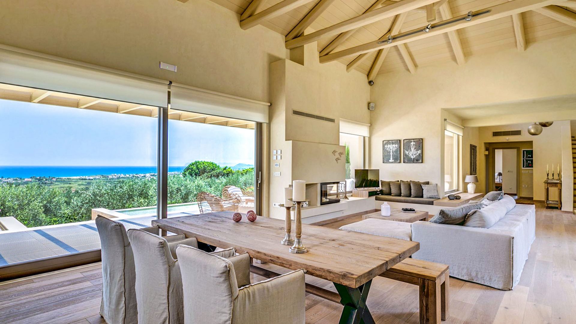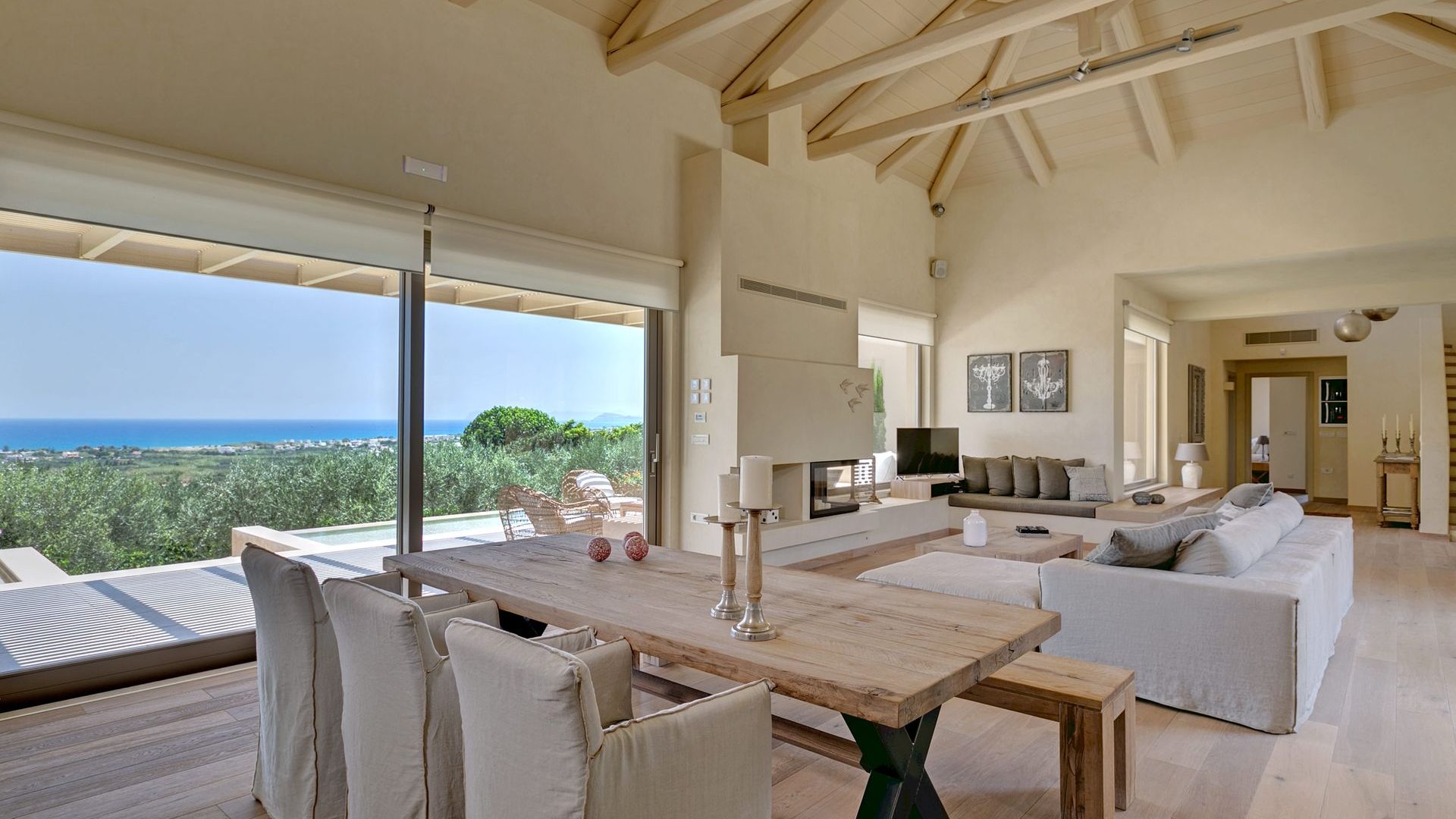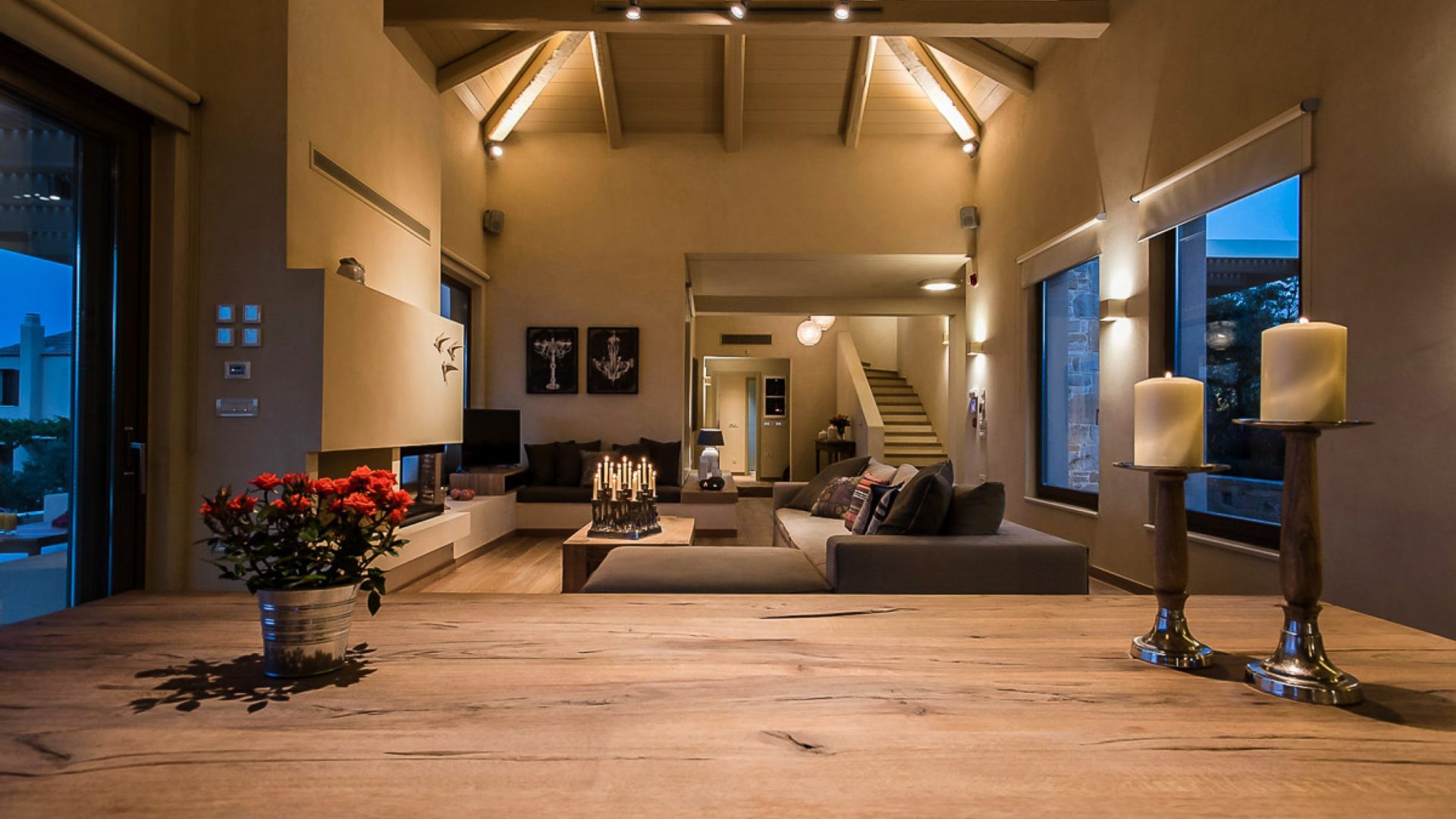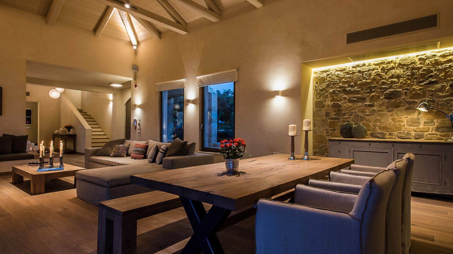 In the living room, soft, oversized, comfortable sofas envelop the body for ultimate relaxation. Opposite the energy-efficient fireplace that was specifically selected because of its low environmental impact, a designer wooden table stands before huge windows looking out towards the Cretan sea, infinity pool, gardens and their flower beds which beckon visitors to the property’s splendid outdoor spaces.