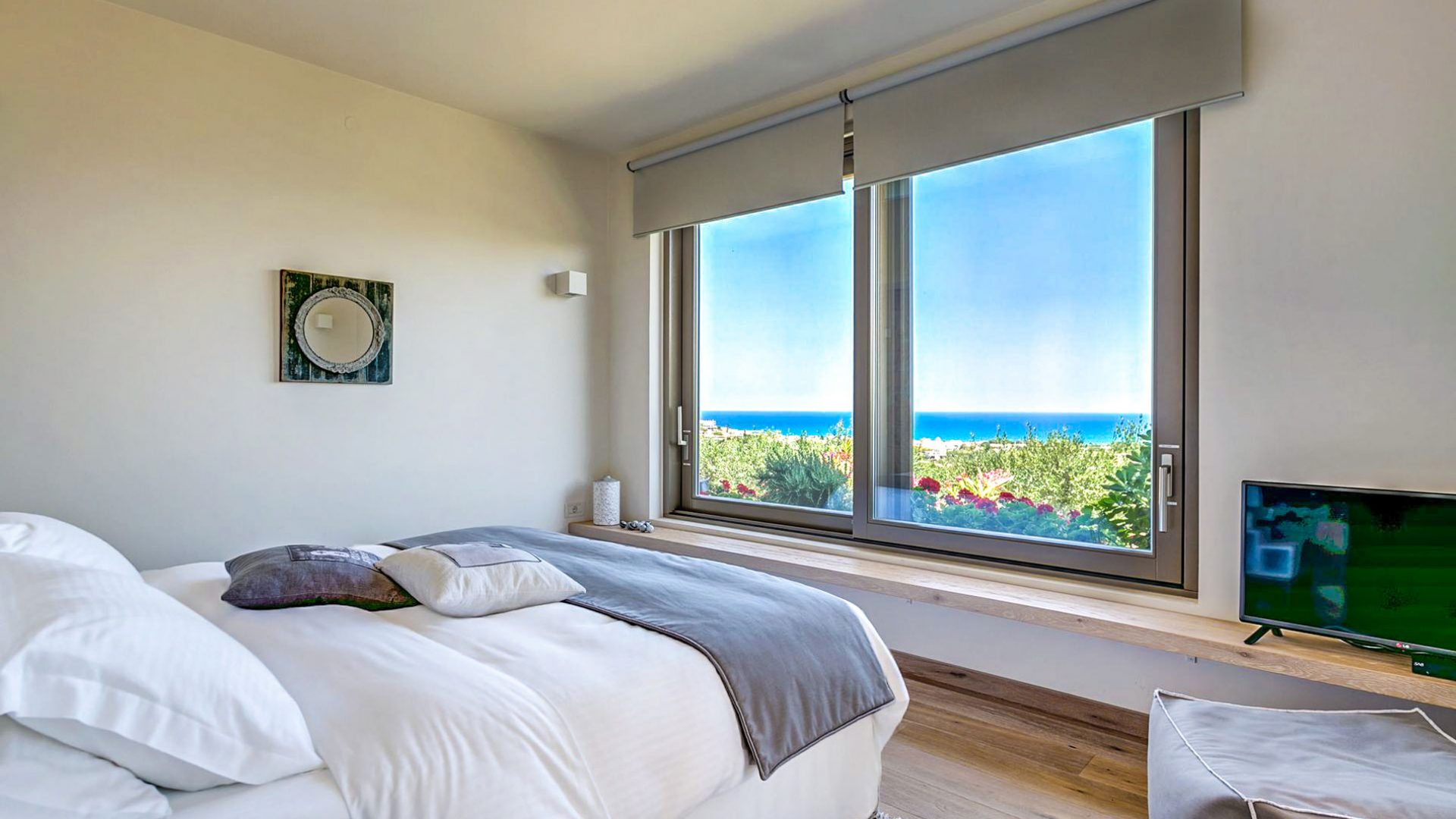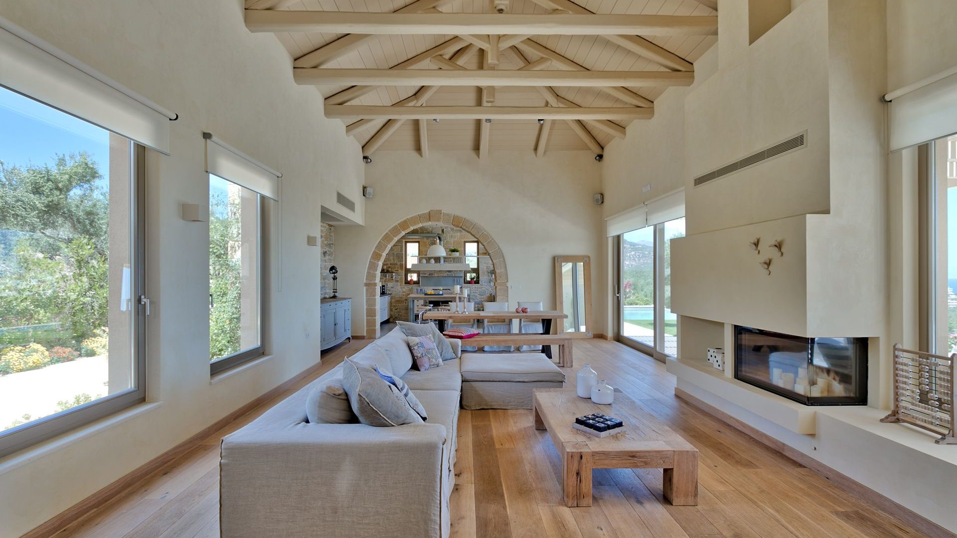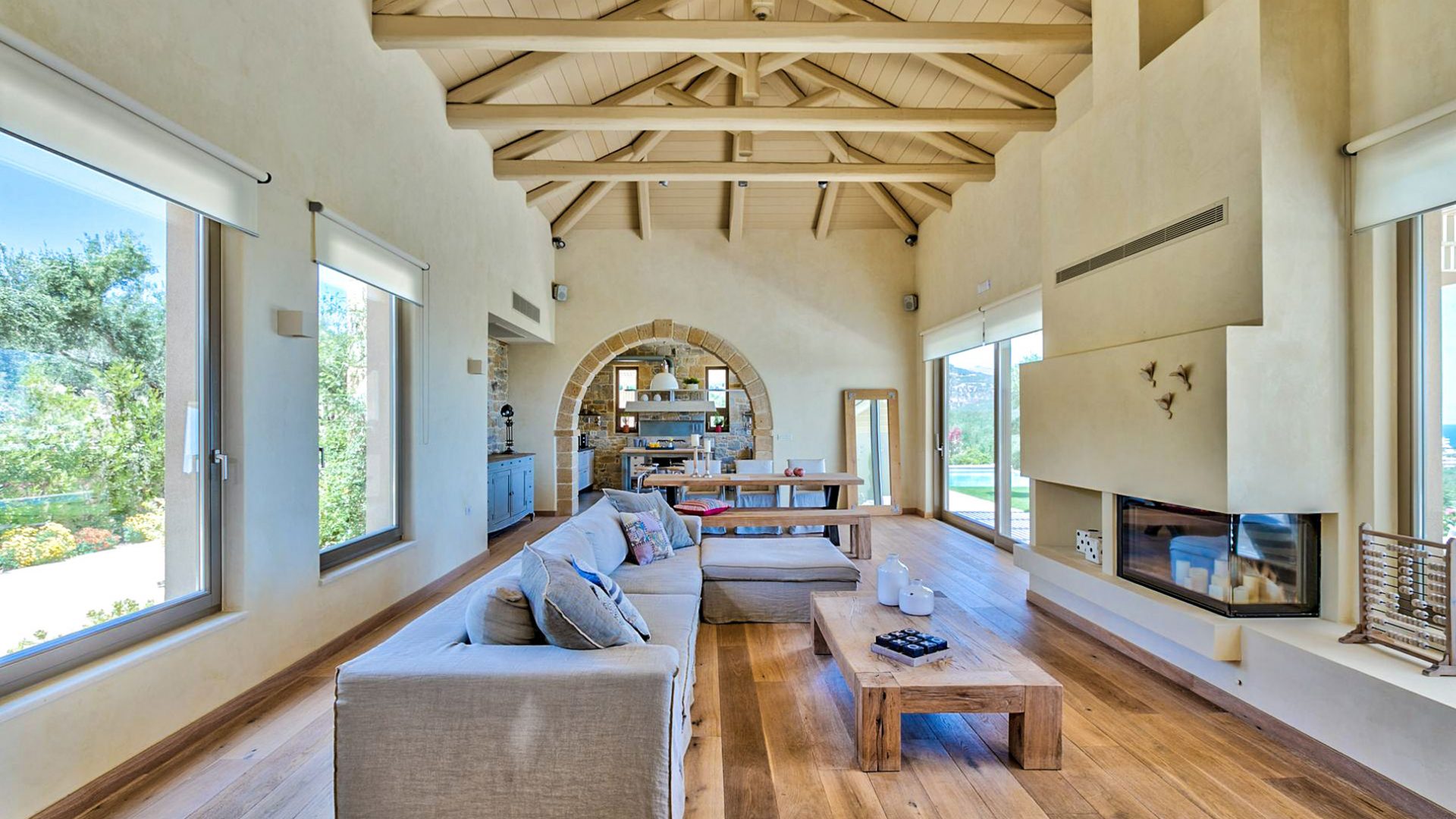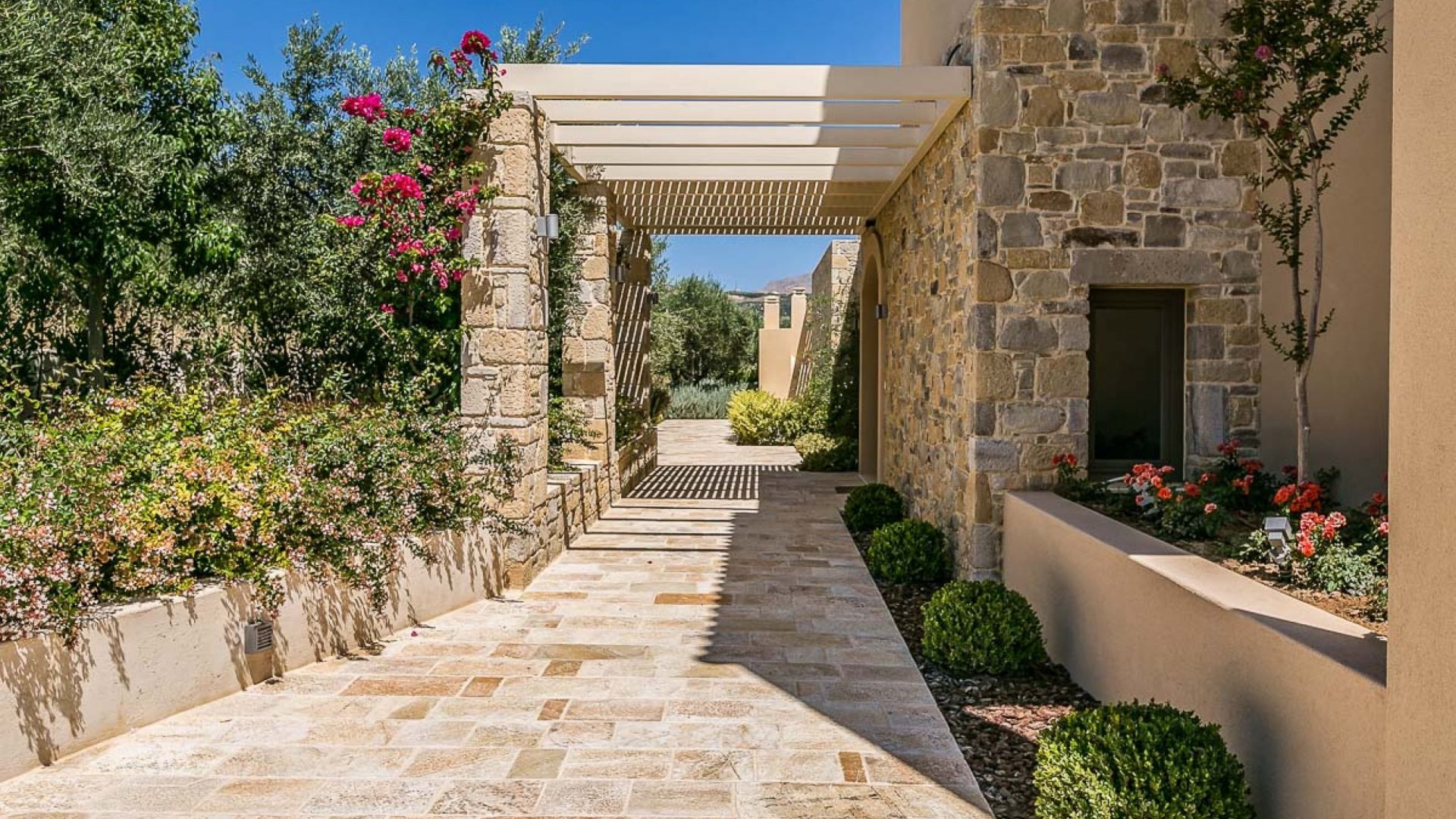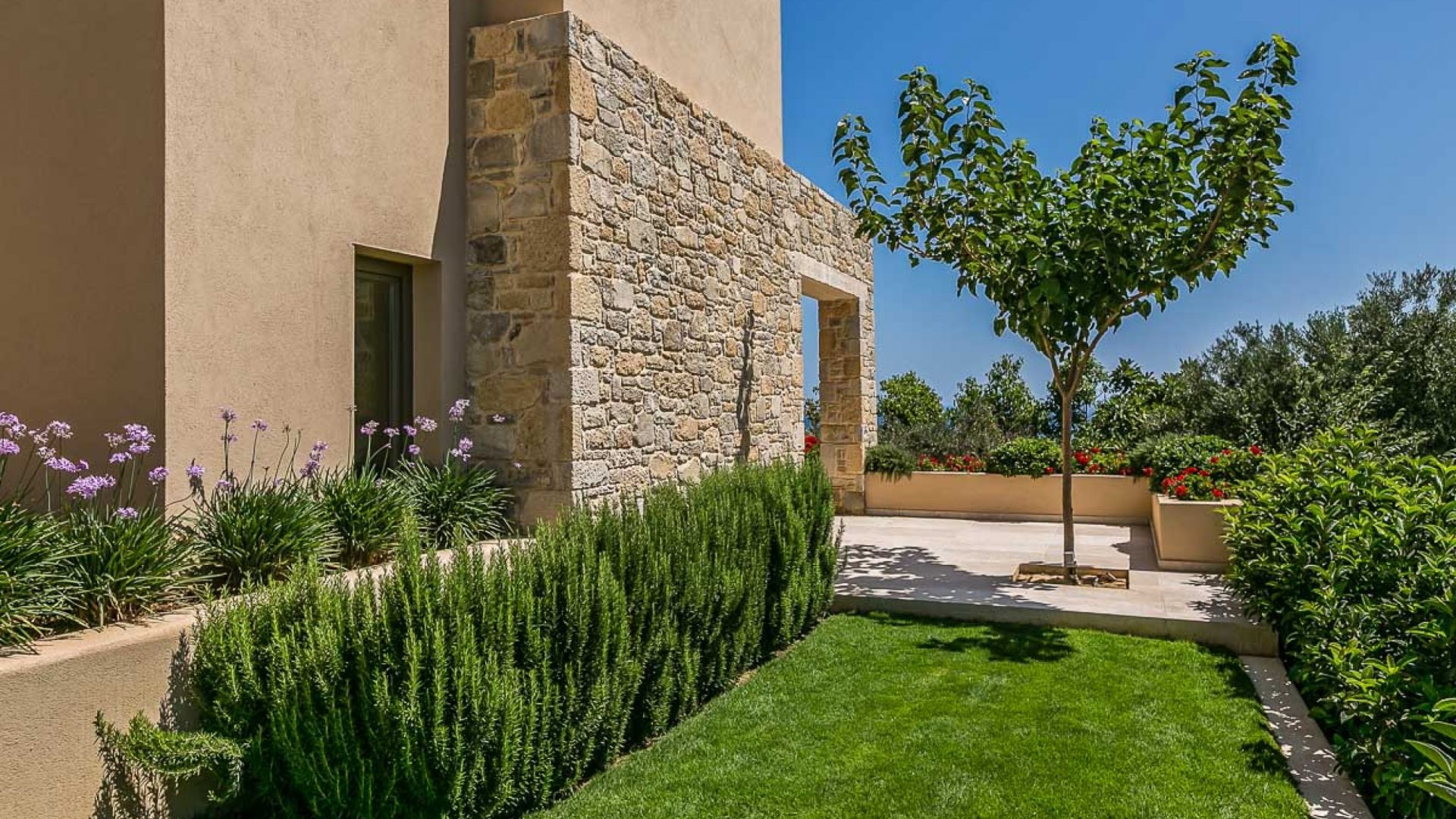 In the living room, soft, oversized, comfortable sofas envelop the body for ultimate relaxation. Opposite the energy-efficient fireplace that was specifically selected because of its low environmental impact, a designer wooden table stands before huge windows looking out towards the Cretan sea, infinity pool, gardens and their flower beds which beckon visitors to the property’s splendid outdoor spaces.