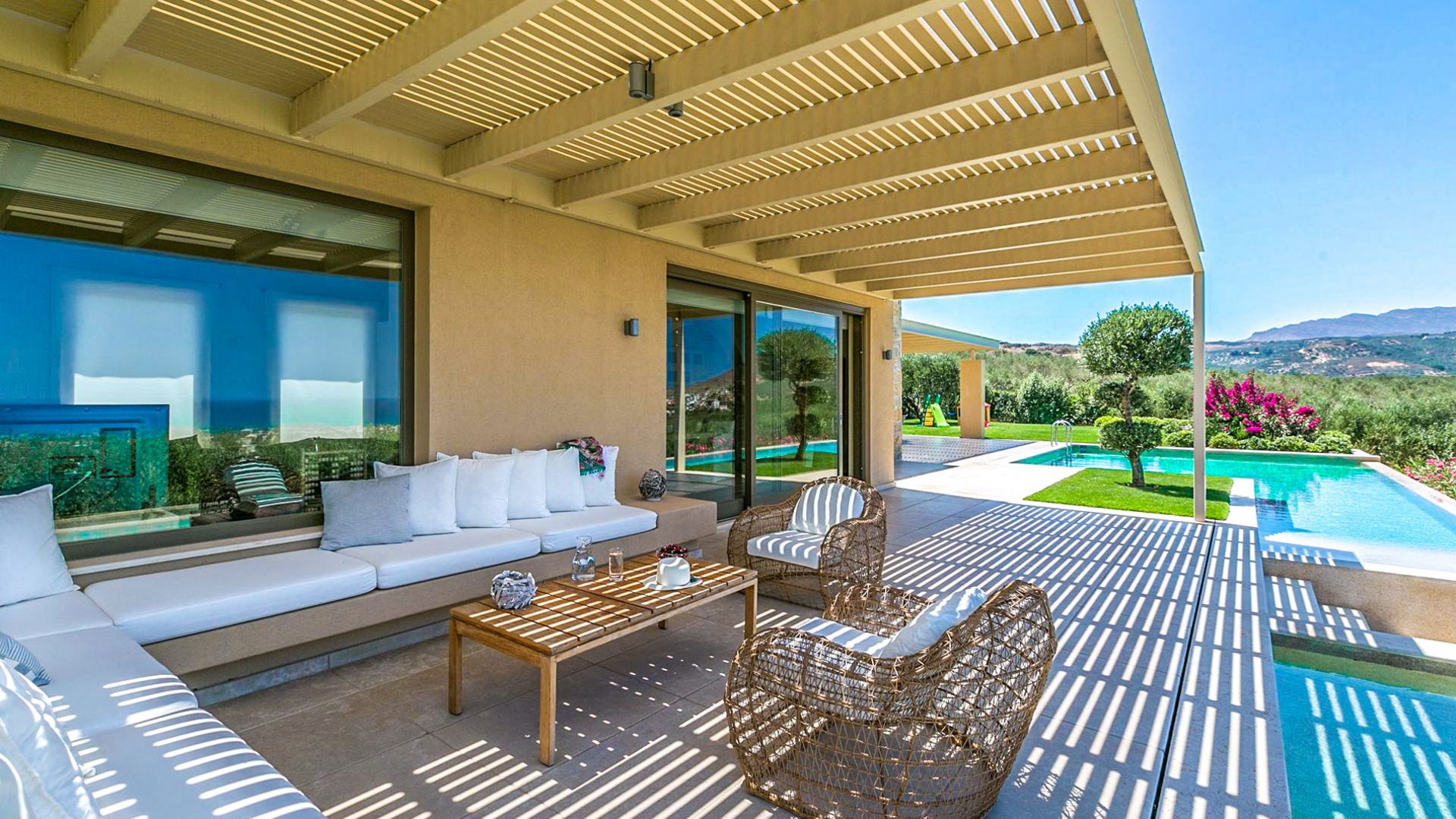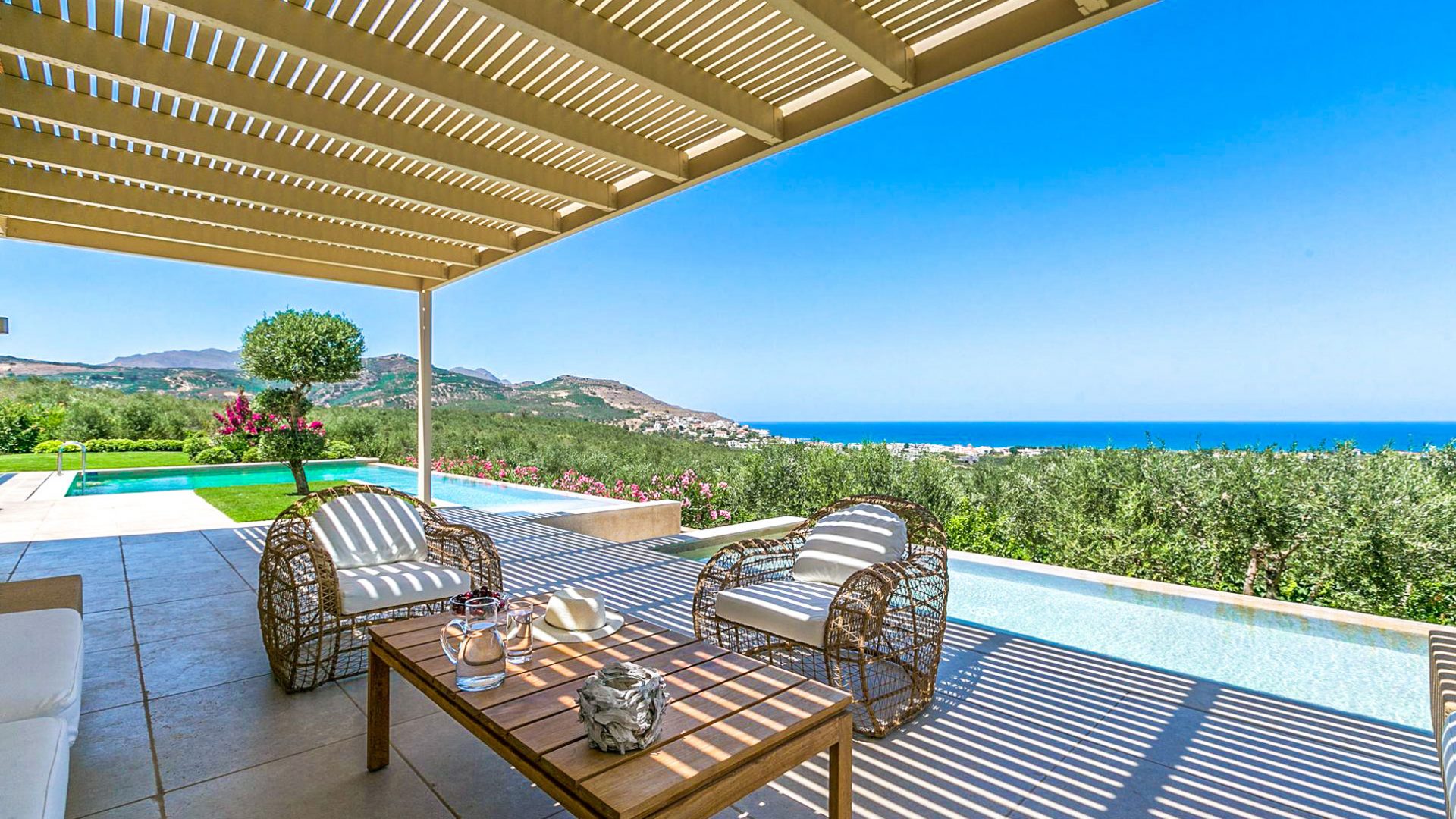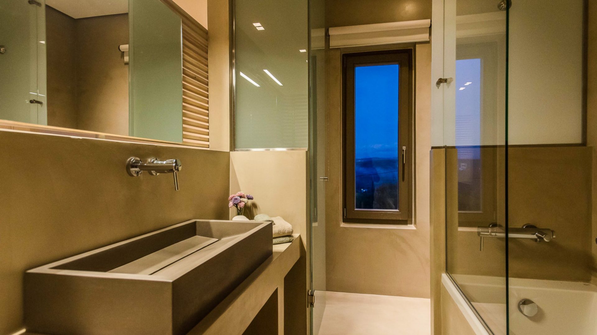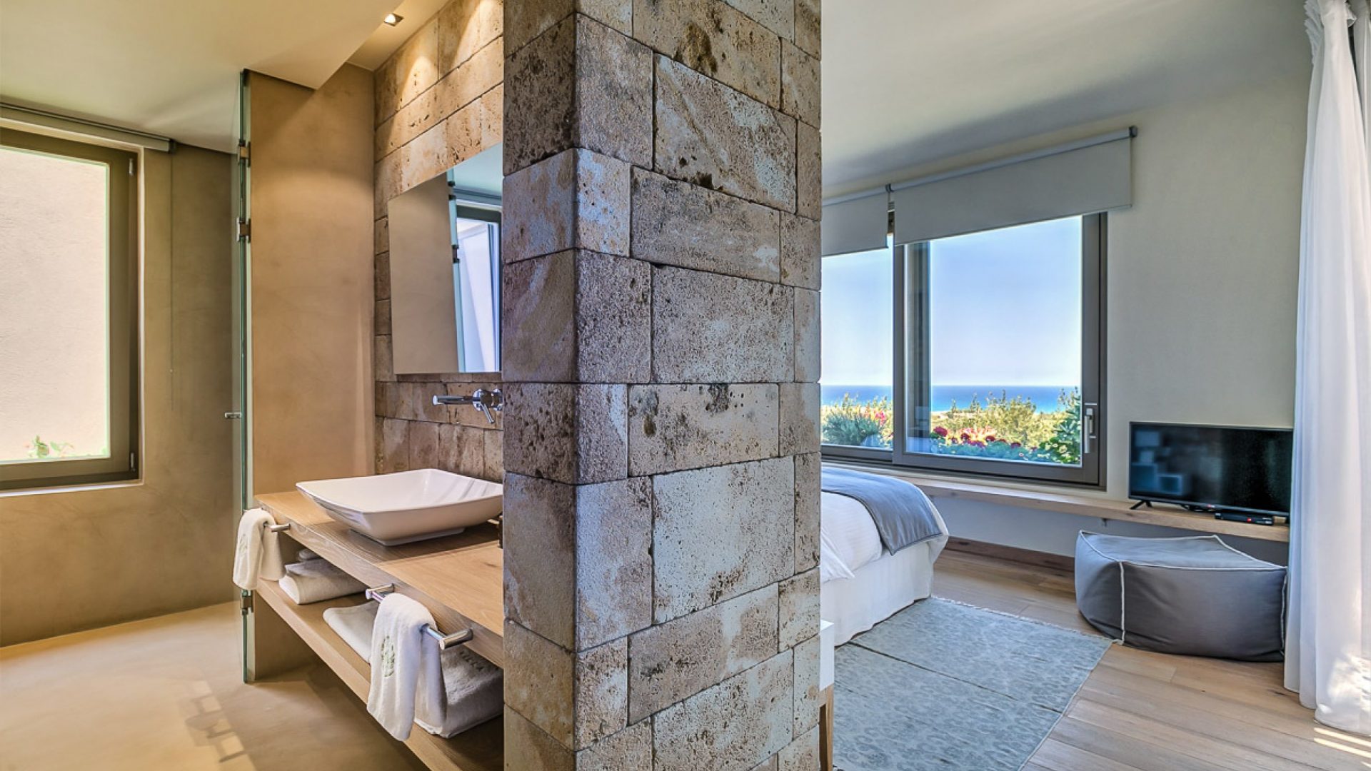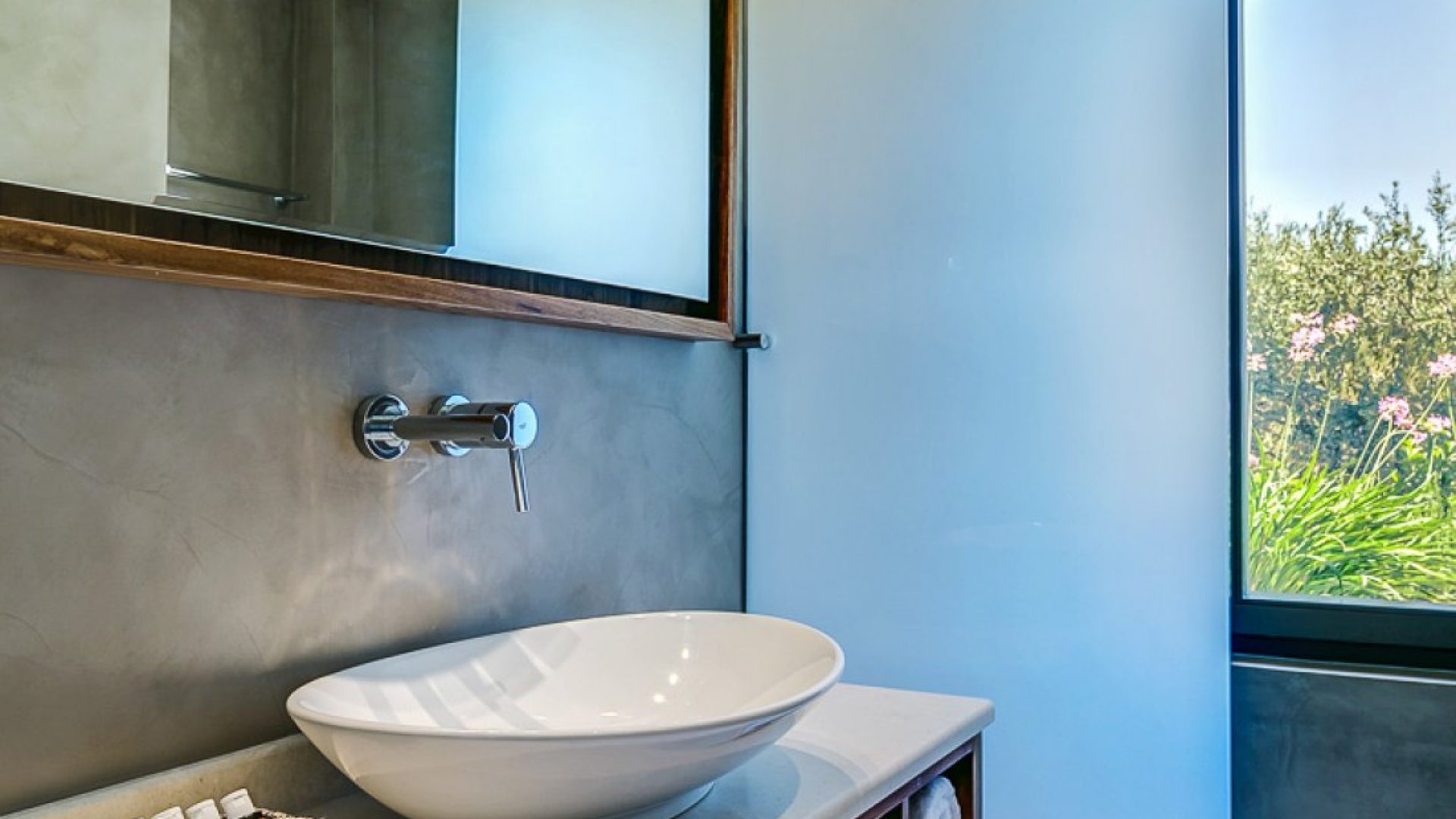 The baths, all fashioned in stylish textured concrete and directly communicating with the bedrooms, are a delight with their clever layout that permits for even greater roominess and comfort, while the front patio and its natural tree-produced shade invites guests for yet another change of scenery and more stunning views of the villa’s gorgeous natural surroundings: one of the many options that this Cretan holiday rental villa offers for moments dedicated to peaceful reading, meditation or simply unwinding.