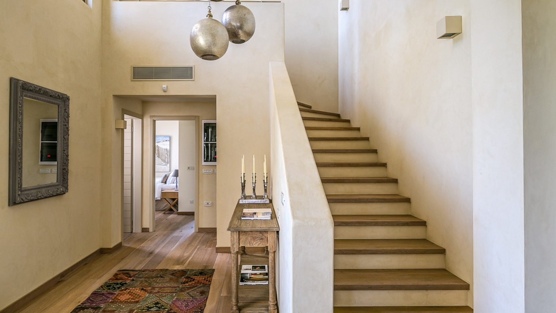 From the striking main entry and its large arched doors, to the notably spacious interior of the entry hall and its double-height ceiling. Opposite, a large bay window allows the sunlight to reflect the colors of the garden off the interior’s earthy tones, with its simple, refined lines and resoundingly tasteful touches. To the right, a staircase leads to the first floor and the master bedroom, and is adorned with impressive ethnic-inspired lighting fixtures that were lovingly selected by the owners of the villa.