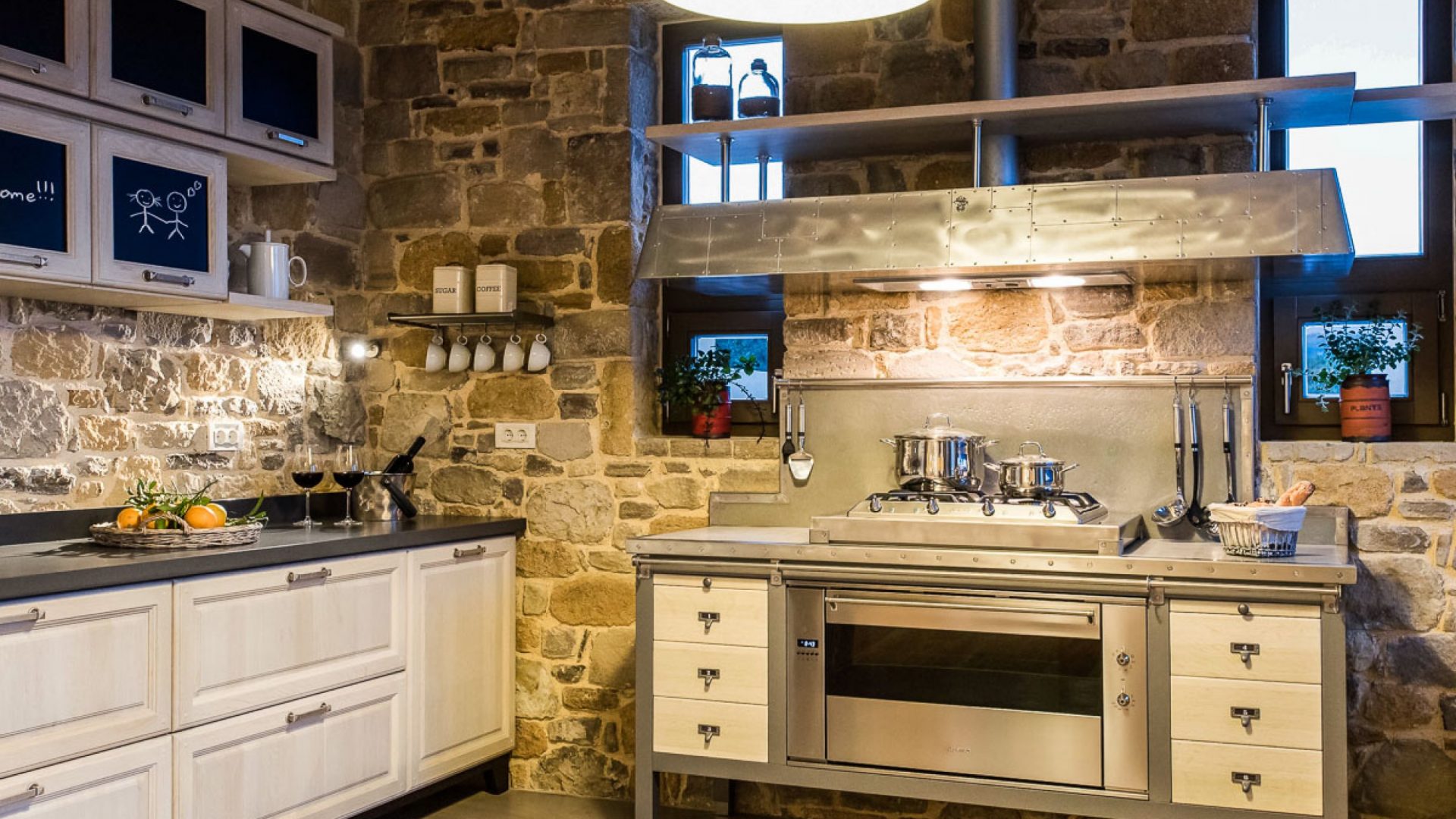 The interior dining area boasts a large untreated wood table resting on wrought iron legs with bench seating on one side and 4 comfortable armchairs on the other. Opposite the unique dining table and through a stunning arch, the kitchen: an homage to the fine art of design outfitted in the unmistakably striking Marchi vintage style, contemporary and highly functional, with a retro feel that inspires gastronomical creativity.