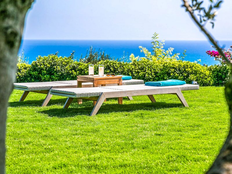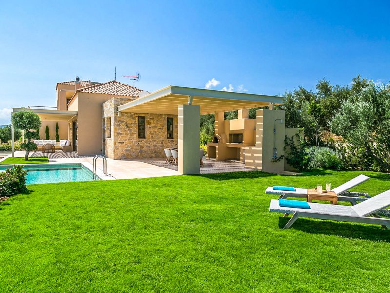 Two patios extend in front of the living room, with built-in corner sofas, soft fluffy pillows and wooden furniture fashioned of teak and rattan. Further on, the dining area is set against the green backdrop of the well-tended lawn which stretches out before you like an endless emerald carpet. An outdoor “kitchen” complete with wood-burning oven, BBQ, built-in countertops and an impressive wide wooden-planked monastery-style table for unforgettable Greek feasts and revelry.