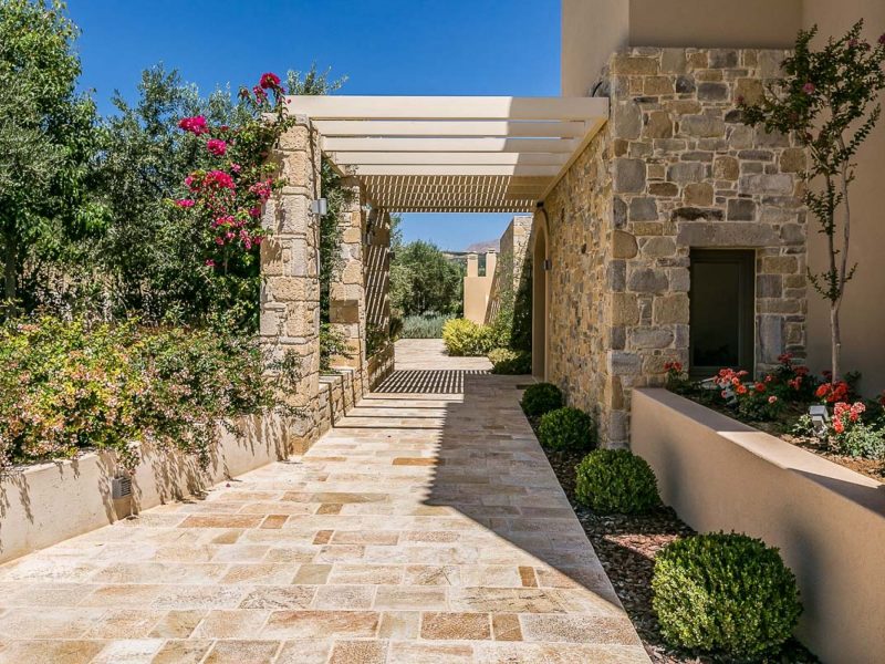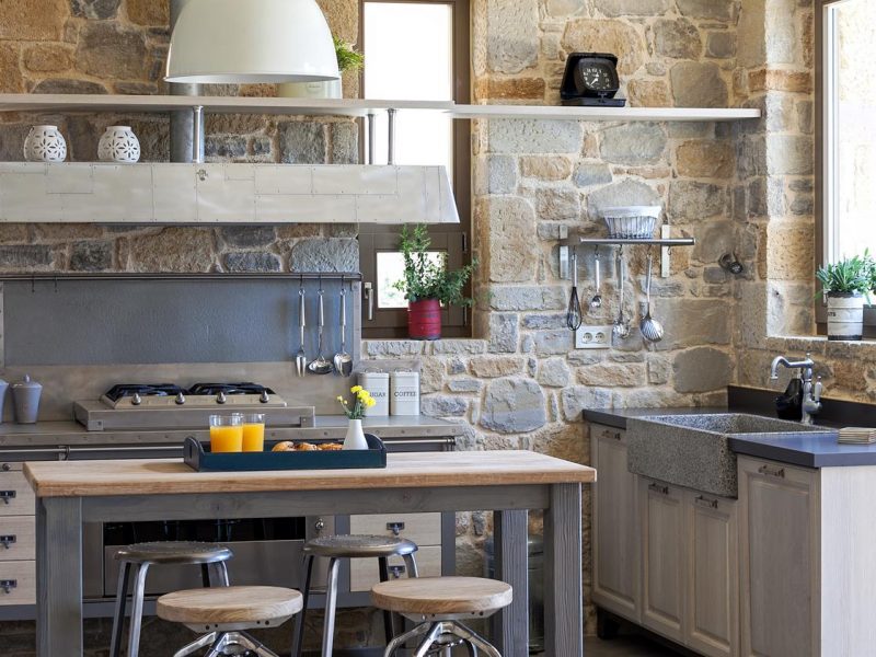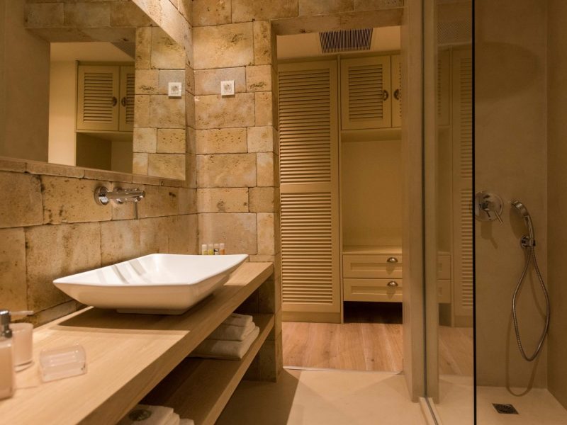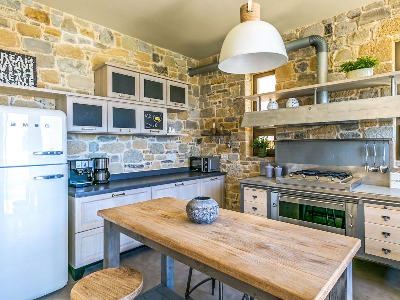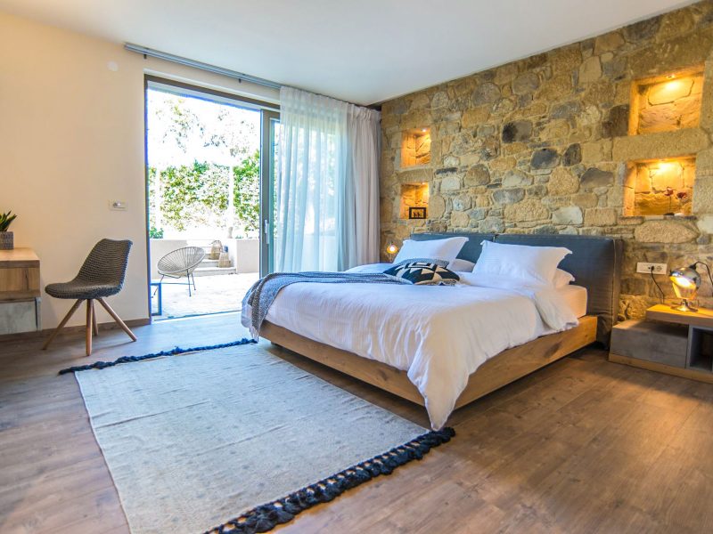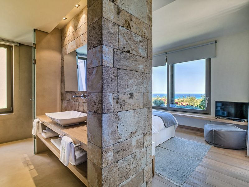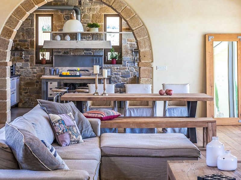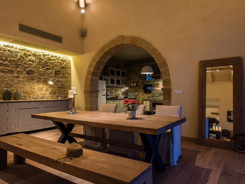 Local stone in the soothing ochre and grey tones characteristic of the surrounding Cretan land where it was sourced “softens” contrasts. Wood abounds, from the wide-planked oak wood floors to the dining room table and side tables, some sanded and refined, others left in their natural state for a deliberately “unfinished” look, sturdy yet light in both quality and aesthetic.