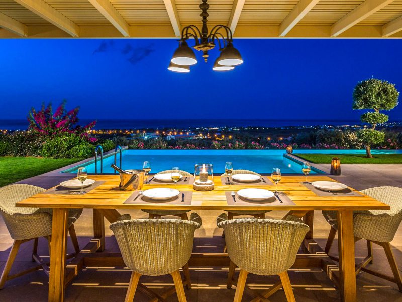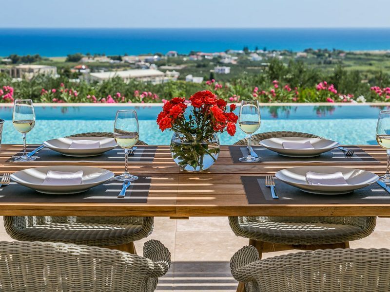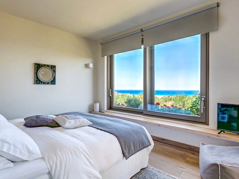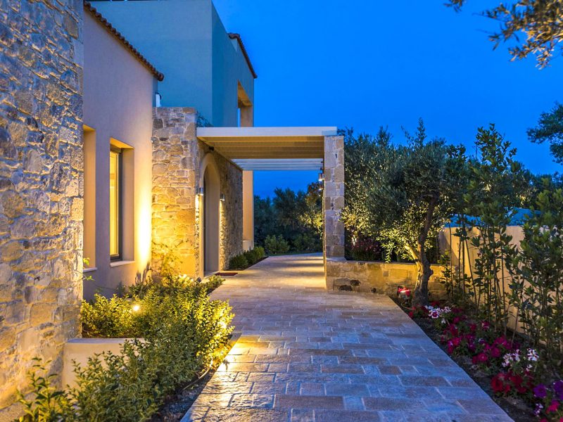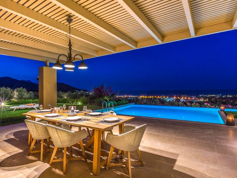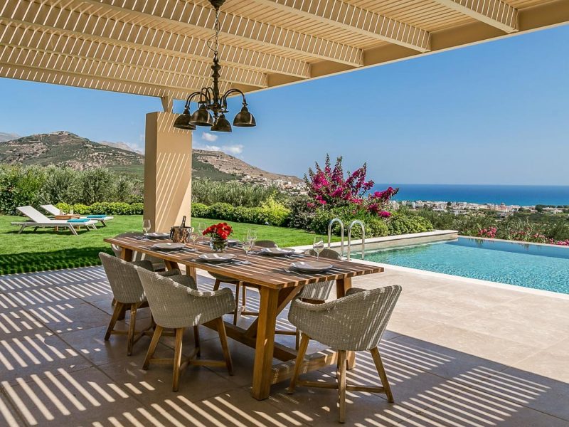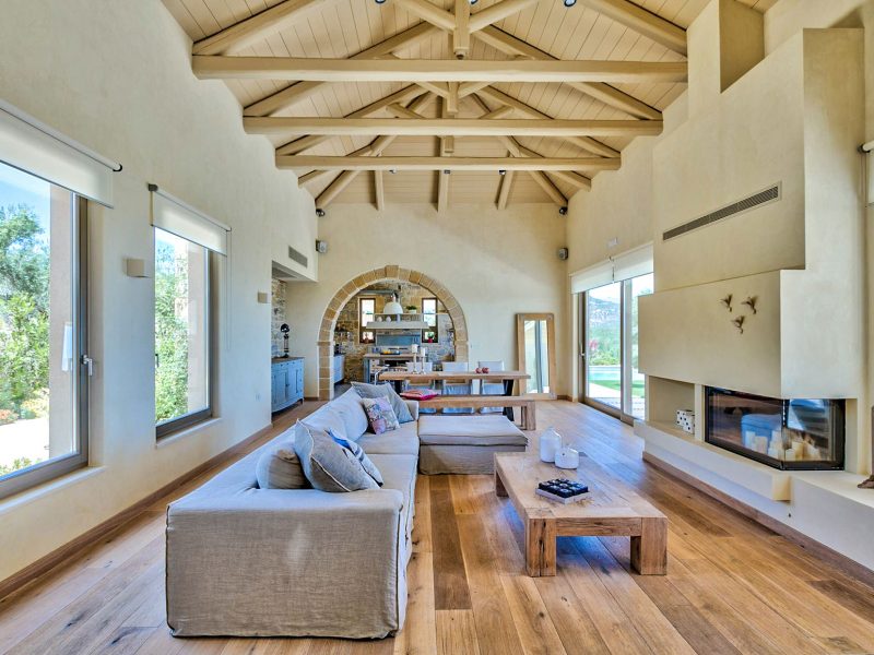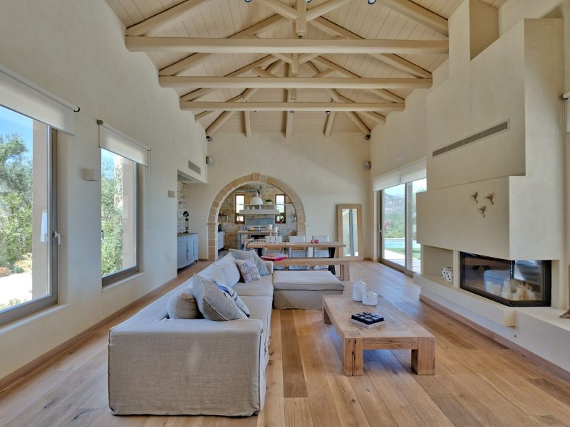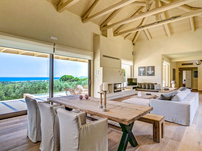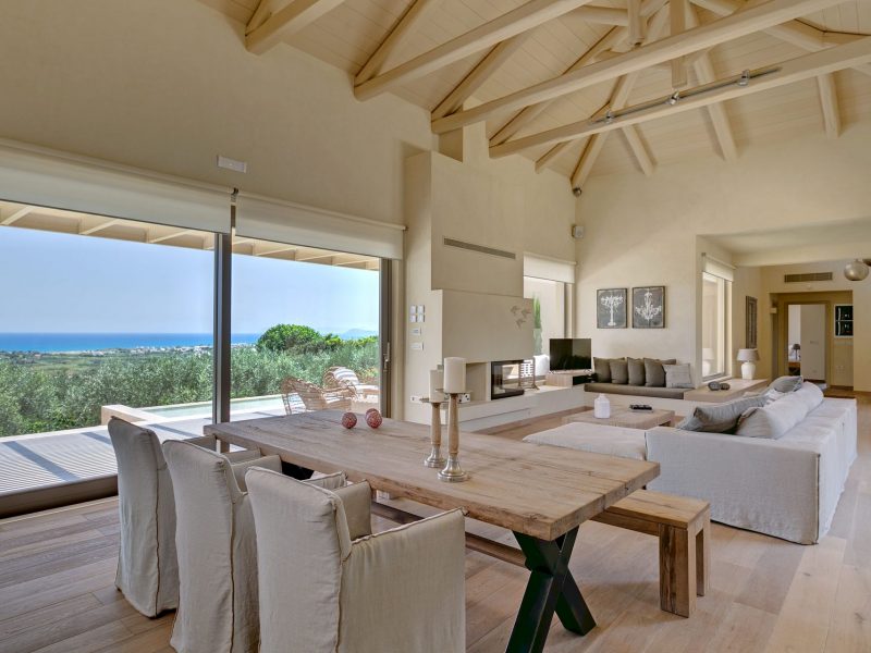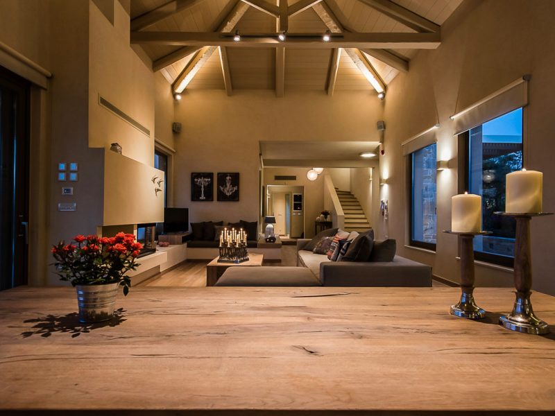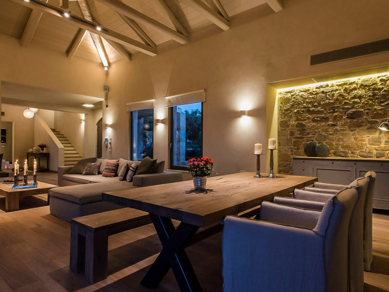 In the living room, soft, oversized, comfortable sofas envelop the body for ultimate relaxation. Opposite the energy-efficient fireplace that was specifically selected because of its low environmental impact, a designer wooden table stands before huge windows looking out towards the Cretan sea, infinity pool, gardens and their flower beds which beckon visitors to the property’s splendid outdoor spaces.