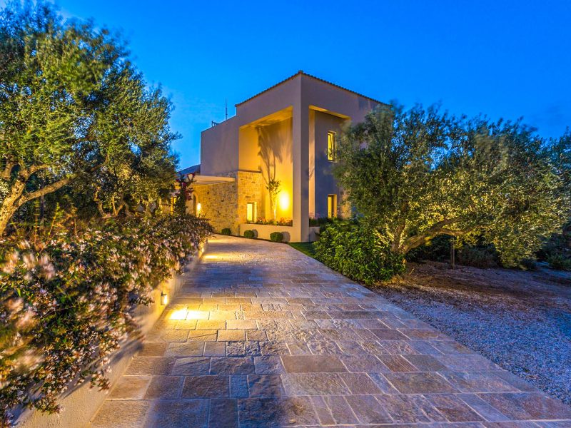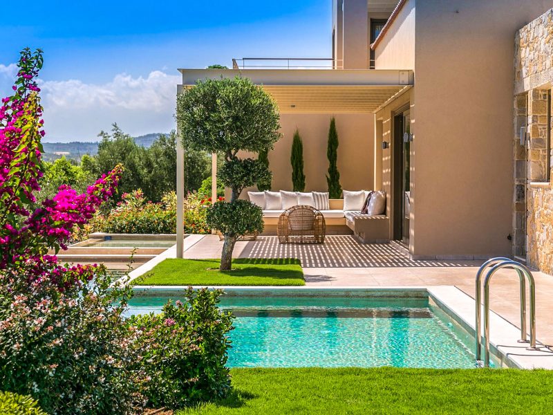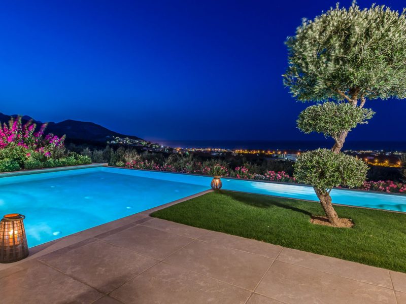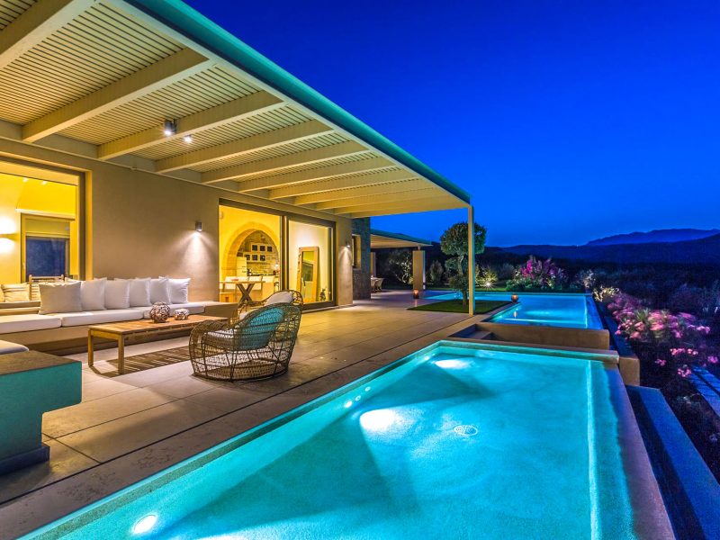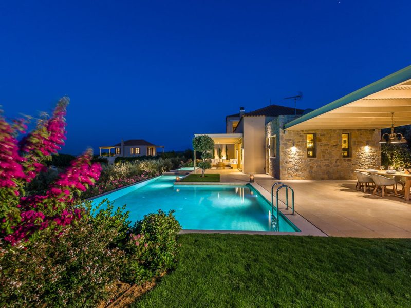 Well-situated within its 3-hectare property, this Cretan holiday villa is impressive in its contemporary architectural lines that blend so seamlessly with its surroundings as to almost become one with the land. The swimming pool’s pebble-tiled depths boast a lovely sandy shade that captures the sunlight and creates playful iridescent reflections through the crystal-clear water.