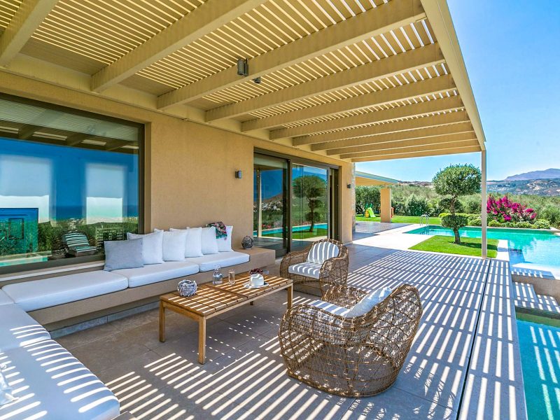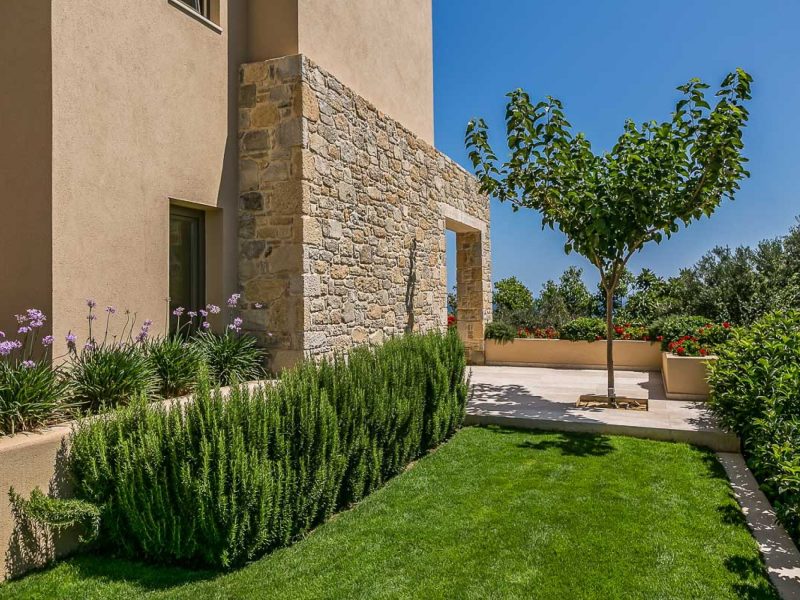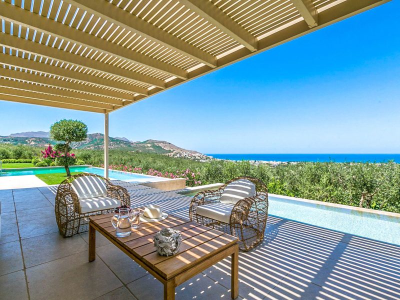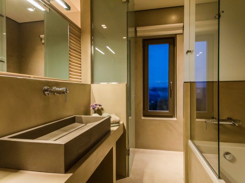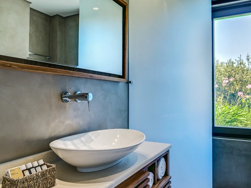 The baths, all fashioned in stylish textured concrete and directly communicating with the bedrooms, are a delight with their clever layout that permits for even greater roominess and comfort, while the front patio and its natural tree-produced shade invites guests for yet another change of scenery and more stunning views of the villa’s gorgeous natural surroundings: one of the many options that this Cretan holiday rental villa offers for moments dedicated to peaceful reading, meditation or simply unwinding.